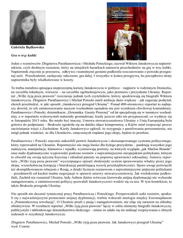 Gabriela Będkowska Gra w trzy kubki Jeden z rozmówców Zbigniewa Parafianowicza i Michała Potockiego, nazwał Wiktora Janukowycza napiorstnikiem, czyli drobnym oszustem, który na miejskich bazarkach namawia przechodniów na grę w trzy kubki. Napiorstnik zręcznie je przesuwa, odkrywa i teatralnymi gestami podkreśla rozczarowanie z powodu przegranej serii. Przechodzień, zachęcony sukcesem, gra dalej. I wszystko w końcu przegrywa, bo początkowe straty napiorstnika były wkalkulowane w koszty. To trafna metafora opisująca nieprzeciętną karierę Janukowycza w polityce – najpierw w rodzinnym Doniecku, na szczeblu lokalnym, wreszcie – na szczeblu ogólnokrajowym, jako premiera i prezydenta Ukrainy. Reportaż „Wilki żyją poza prawem” rozczaruje jednak tych czytelników, którzy spodziewają się biografii Wiktora Janukowycza. Zbigniew Parafianowicz i Michał Potocki mieli ambicje dużo większe – jak sugeruje podtytuł, chcieli prześledzić, w jaki sposób „Janukowycz przegrał Ukrainę”. Ponad 400-stronicowy reportaż to najlepszy dowód, że ich zainteresowanie naszym wschodnim sąsiadem nie jest wynikiem chwilowej koniunktury. Parafianowicz i Potocki, dziennikarze „Dziennika. Gazety Prawnej” od lat specjalizują się w tematyce wschodniej, a w reportażu wykorzystali materiały gromadzone, kiedy jeszcze nikt nie przypuszczał, co wydarzy się w listopadzie 2013 roku. Bo miało być inaczej. Umowa stowarzyszeniowa Ukrainy z Unią Europejską była gotowa do podpisania – Bruksela zgodziła się na daleko idące kompromisy, a Kijów miał rozpocząć proces zacieśniania więzi z Zachodem. Kiedy Janukowycz ogłosił, że rezygnuje z parafowania porozumienia, nie mógł jednak wiedzieć, że dla Ukraińców, zmęczonych rządami jego ekipy, będzie to przełom. Parafianowicz i Potocki zręcznie nakreślili portret Janukowycza i skorumpowanego systemu politycznego, który wprowadził na Ukrainie. Reportażyści nie mają litości dla byłego prezydenta – punktują wszystkie jego nadużycia, manipulacje, kłamstwa i wpadki, wyśmiewają portrety, na których wygląda „jak Marlon Brando” oraz mało dyplomatyczne wypowiedzi podczas rozmów z najważniejszymi europejskimi politykami, którym to chwalił się swoją tężyzną fizyczną i zdradzał patenty na poprawę sprawności seksualnej. Autorzy reportażu „Wilki żyją poza prawem” wyczerpująco opisali złodziejski system sprawowania władzy przez jego ekipę, wszechobecną korupcję i biurokrację paraliżującą rozwój przedsiębiorczości. Sporo uwagi poświęcili też skomplikowanym relacjom z Rosją, a dzięki licznym rozmowom z najważniejszymi unijnymi politykami – przedstawili od kuchni trudne negocjacje w sprawie umowy stowarzyszeniowej. Jak wielokrotnie podkreślali, Zachód nie rozumiał Ukrainy, lady Ashton (która wówczas kierowała unijną dyplomacją) nie wykazała zaangażowania, a zainteresowani politycy pozwalali Janukowyczowi wodzić się za nos. W tym kontekście, to także Bruksela przegrała Ukrainę. Nie sposób nie docenić tytanicznej pracy Parafinowicza i Potockiego. Przeprowadzili setki rozmów, spotkali się z najważniejszymi postaciami unijnej dyplomacji, trafnie wskazali analogie między Euromajdanem a „Pomarańczową rewolucją”. O Ukrainie pisali z pasją i zaangażowaniem, nie siląc się zarazem na chłodny obiektywizm. W rezultacie reportaż „Wilki żyją poza prawem” łączy w sobie elementy biografii Janukowycza, publicystyki i tabloidowego dziennikarstwa śledczego – mimo że udało się im uniknąć rozpisywania o złotych sedesach w rezydencji Janukowycza. Zbigniew Parafianowicz, Michał Potocki „Wilki żyją poza prawem. Jak Janukowycz przegrał Ukrainę” wyd. Czarne
