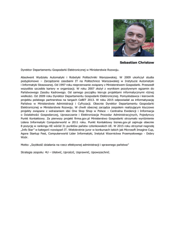 Sebastian Christow Dyrektor Departamentu Gospodarki Elektronicznej w Ministerstwie Rozwoju. Absolwent Wydziału Automatyki i Robotyki Politechniki Warszawskiej. W 2009 ukończył studia podyplomowe – Zarządzanie zasobami IT na Politechnice Warszawskiej w Instytucie Automatyki i Informatyki Stosowanej. Od 1997 roku nieprzerwanie związany z Ministerstwem Gospodarki. Przeszedł wszystkie szczeble kariery w organizacji. W roku 2007 złożył z wynikiem pozytywnym egzamin do Państwowego Zasobu Kadrowego. Od samego początku kieruje projektami informatycznymi różnej wielkości. Od 2009 roku Dyrektor Departamentu Gospodarki Elektronicznej. Pomysłodawca i kierownik projektu polskiego partnerstwa na targach CeBIT 2013. W roku 2015 odpowiadał za informatyzację Państwa w Ministerstwie Administracji i Cyfryzacji. Obecnie Dyrektor Departamentu Gospodarki Elektronicznej w Ministerstwie Rozwoju. W chwili obecnej zarządza zespołem realizującym kluczowe projekty związane z wdrażaniem idei One Stop Shop w Polsce – Centralna Ewidencji i Informacja o Działalności Gospodarczej, Upraszczanie i Elektronizacja Procedur Administracyjnych, Pojedynczy Punkt Kontaktowy. Za pierwszy projekt firma.gov.pl Ministerstwo Gospodarki otrzymało wyróżnienie Lidera Informatyki Computerworld w 2011 roku. Punkt Kontaktowy biznes.gov.pl zajmuje obecnie 8 pozycję w rankingu KE wśród 31 punktów państw członkowskich UE. W 2015 roku otrzymał nagrodę „Info Star” w kategorii rozwiązań IT. Wielokrotnie juror w konkursach takich jak Microsoft Imagine Cup, Agora Startup Fest, Computerworld Lider Informatyki, Instytut Wzornictwa Przemysłowego - Dobry Wzór. Motto: „Szybkość działania na rzecz efektywnej administracji i sprawnego państwa” Strategia zespołu: 4U – Ułatwić, Uprościć, Usprawnić, Upowszechnić.