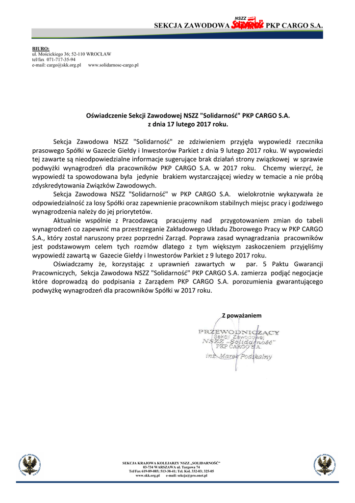 Oświadczenie 17 lutego 2017 - "Solidarność" PKP CARGO SA