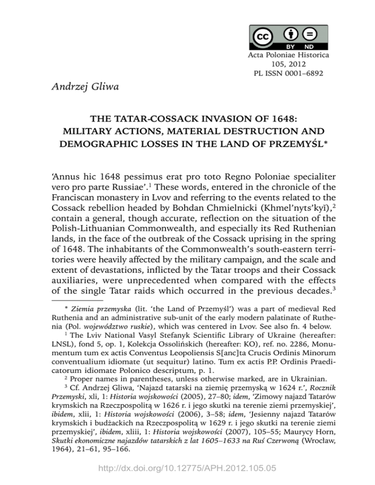 Acta Poloniae Historica 105, 2012 PL ISSN 0001–6892 Andrzej Gliwa THE TATAR-COSSACK INVASION OF 1648: MILITARY ACTIONS, MATERIAL DESTRUCTION AND DEMOGRAPHIC LOSSES IN THE LAND OF PRZEMYŚL* ‘Annus hic 1648 pessimus erat pro toto Regno Poloniae specialiter vero pro parte Russiae’.1 These words, entered in the chronicle of the Franciscan monastery in Lvov and referring to the events related to the Cossack rebellion headed by Bohdan Chmielnicki (Khmel’nyts’kyĭ),2 contain a general, though accurate, reflection on the situation of the Polish-Lithuanian Commonwealth, and especially its Red Ruthenian lands, in the face of the outbreak of the Cossack uprising in the spring of 1648. The inhabitants of the Commonwealth’s south-eastern territories were heavily affected by the military campaign, and the scale and extent of devastations, inflicted by the Tatar troops and their Cossack auxiliaries, were unprecedented when compared with the effects of the single Tatar raids which occurred in the previous decades.3 * Ziemia przemyska (lit. ‘the Land of Przemyśl’) was a part of medieval Red Ruthenia and an administrative sub-unit of the early modern palatinate of Ruthenia (Pol. województwo ruskie), which was centered in Lvov. See also fn. 4 below. 1 The Lviv National Vasyl Stefanyk Scientific Library of Ukraine (hereafter: LNSL), fond 5, op. 1, Kolekcja Ossolińskich (hereafter: KO), ref. no. 2286, Monumentum tum ex actis Conventus Leopoliensis S[anc]ta Crucis Ordinis Minorum conventualium idiomate (ut sequitur) latino. Tum ex actis P.P. Ordinis Praedicatorum idiomate Polonico descriptum, p. 1. 2 Proper names in parentheses, unless otherwise marked, are in Ukrainian. 3 Cf. Andrzej Gliwa, ‘Najazd tatarski na ziemię przemyską w 1624 r.’, Rocznik Przemyski, xli, 1: Historia wojskowości (2005), 27–80; idem, ‘Zimowy najazd Tatarów krymskich na Rzeczpospolitą w 1626 r. i jego skutki na terenie ziemi przemyskiej’, ibidem, xlii, 1: Historia wojskowości (2006), 3–58; idem, ‘Jesienny najazd Tatarów krymskich i budżackich na Rzeczpospolitą w 1629 r. i jego skutki na terenie ziemi przemyskiej’, ibidem, xliii, 1: Historia wojskowości (2007), 105–55; Maurycy Horn, Skutki ekonomiczne najazdów tatarskich z lat 1605–1633 na Ruś Czerwoną (Wrocław, 1964), 21–61, 95–166. http://dx.doi.org/10.12775/APH.2012.105.05 86 Andrzej Gliwa It is worth stressing that the traumatic experience became the common lot of the members of various ethno-religious groups, be they Ruthenians (i.e., Ukrainians), Poles, or Jews. The present article aims to reconstruct the military campaign which took place in the autumn of 1648 and, especially, to measure the extent of war destruction and demographic losses inflicted in the Land of Przemyśl, the furthest part of the palatinate (voivodeship) of Ruthenia, which was affected during this campaign by the activity of Tatar-Cossack troops.4 This was one of the largest military campaigns, directed against the Commonwealth’s territories, which took place in the seventeenth century. Notwithstanding the extensive historical literature devoted to the Cossack uprising, the picture of its events still remains largely distorted due to the myths created, beginning from the nineteenth century, by Ukrainian and Russian historiography, and especially by Soviet historiography, beginning from the late 1930s. The latter, heavily loaded ideologically and politically, depicted Bohdan Chmielnicki and the effects of his activity in a way that was both instrumental and, at the same time, overly idealistic. A very similar and generally one-sided picture of the events of the mid-seventeenth century can be found in contemporary, post-Soviet Ukrainian historiography, both in the writings of the historians ascribed to the ‘national-stately paradigm’, and those ascribed to the ‘stately-national’ one.5 Nonetheless, in the recent years, one can observe a certain shift in the attitude of Ukrainian historiography in regard to the subject of our study. A small but rising number of researchers, influenced by new methodological currents coming belatedly from the West, have challenged the ‘established truths’ and adopted a non-dogmatic stand, The Land of Przemyśl covered the territory of 12,070 km²; in the first half of the 17th century, it was divided into four districts: of Przemyśl, Sambor, Drohobycz and Stryj; see Kazimierz Przyboś, ‘Granice ziemi przemyskiej w czasach nowożytnych XVI–XVIII wiek’, Rocznik Przemyski, xxix–xxx (1993–94), 189. In the present article, I deliberately adopt the term ‘Tatar-Cossack invasion’ and not ‘Cossack-Tatar invasion’, as has been commonly used in the Polish historiography, because, in my opinion, there is no doubt as to who from among the two allies was the stronger partner in regard to both the political standing and military strength, and whose voice was decisive in regard to the way of conduct of military actions in the autumn of 1648. 5 Tomasz Stryjek, Jakiej przeszłości potrzebuje przyszłość? Interpretacje dziejów narodowych w historiografii i debacie publicznej na Ukrainie 1991–2004 (Seria Wschodnia, Warsaw, 2007), 253–65. 4 http://dx.doi.org/10.12775/APH.2012.105.05 The Tatar-Cossack Invasion of 1648 87 not burdened with ideology, towards the Polish-Cossack conflict. Especially worth noting are the studies by Natalya Yakovenko6 and Viktor Brekhunenko,7 in which one can find new interpretations of the eventful developments of the late 1640s. However, the military activities of the invaders have usually been treated as a mere fragment of the great Cossack uprising, or as one more Tatar raid in the long history of Polish-Tatar relations, which allowed for at most a superficial description of this campaign.8 Admittedly, in the recent years a few studies appeared, focused on the military activities in western Ruthenian lands belonging to the Polish Crown, which were reached by the wave of the Co