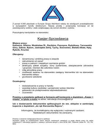 Z ponad 4.000 placówek w Europie Grupa Aldi-Nord należy do wiodących przedsiębiorstw w europejskim handlu detalicznym. Naszej prostej i przejrzystej koncepcji od lat zawdzięczamy solidny i stale zwiększający się wzrost obrotów i zysków. Poszukujemy kandydatów na stanowisko: Kasjer-Sprzedawca Miejsce pracy: Katowice, Gliwice, Wodzisław Śl., Racibórz, Pszczyna, Rydułtowy, Tarnowskie Góry, Zabrze, Bytom, Jastrzębie Zdrój, Tychy, Sosnowiec, Bielsko-Biała, Kęty, Rybnik, Knurów Oferujemy: • • • • • • • dynamiczną i ambitną pracę w zespole zatrudnienie od zaraz! pracę w pełnym i niepełnym wymiarze godzin atrakcyjny pakiet socjalny: bony żywieniowe, ubezpieczenie zdrowotne i grupowe, również dla członków rodzin miłą atmosferę pracy możliwość awansu na stanowisko zastępcy kierownika lub na stanowisko kierownika sklepu gruntowne szkolenie Oczekujemy: • • • • doświadczenia w pracy w handlu wysokiej kultury osobistej i uprzejmości wobec klientów gotowości do podejmowania odpowiedzialności uczciwości Prosimy o przesłanie aplikacji w formacie pdf koniecznie z dopiskiem „Kasjer + miasto” w tytule e-maila na adres: [email protected] lub o dostarczenie dokumentów aplikacyjnych do ww. sklepów w zamkniętej kopercie z dopiskiem „do rąk Kierownika Rejonu”. Informujemy, że kontaktujemy się wyłącznie z wybranymi osobami. Nadesłanych dokumentów nie zwracamy. Prosimy o zawarcie następującej klauzuli w aplikacji: Wyrażam zgodę na przetwarzanie moich danych osobowych zawartych w mojej ofercie pracy do celów związanych z rekrutacją (zgodnie z ustawą o ochronie danych z dnia 29.08.1997, Dziennik Ustaw Nr. 133, Pkt. 883).