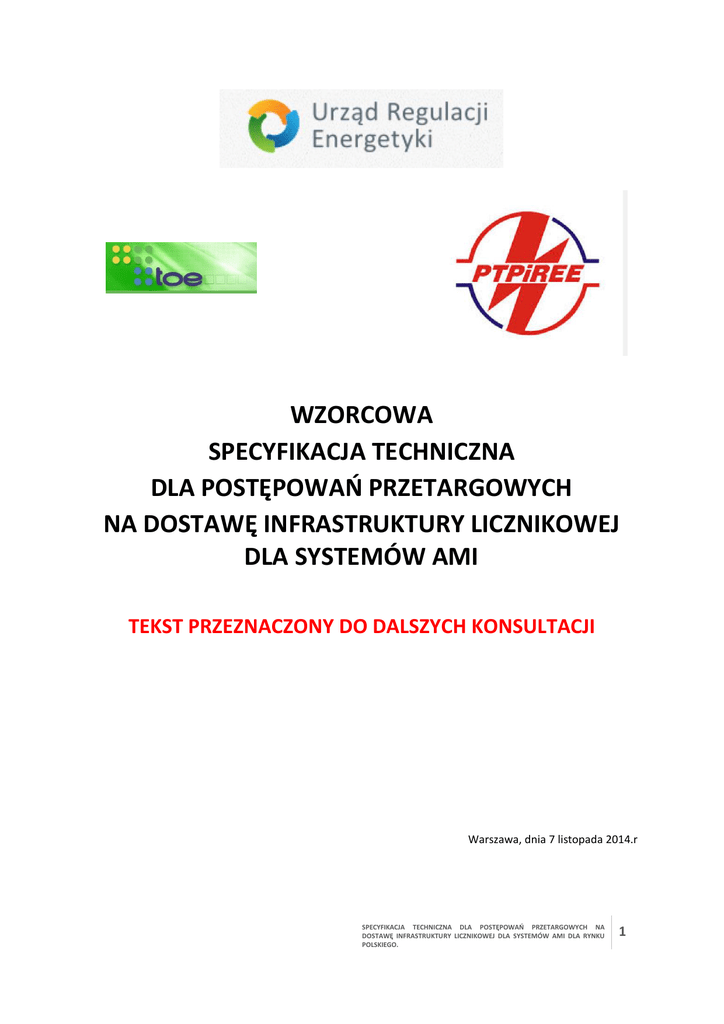 WZORCOWA SPECYFIKACJA TECHNICZNA DLA POSTĘPOWAŃ PRZETARGOWYCH NA DOSTAWĘ INFRASTRUKTURY LICZNIKOWEJ DLA SYSTEMÓW AMI TEKST PRZEZNACZONY DO DALSZYCH KONSULTACJI Warszawa, dnia 7 listopada 2014.r SPECYFIKACJA TECHNICZNA DLA POSTĘPOWAŃ PRZETARGOWYCH NA DOSTAWĘ INFRASTRUKTURY LICZNIKOWEJ DLA SYSTEMÓW AMI DLA RYNKU POLSKIEGO. 1 Wprowadzenie I. Wprowadzenie Rynek elektroenergetyczny w Polsce stoi przed koniecznością zmian organizacyjnych i technologicznych. Zmiana wynika, między innymi, z obowiązków nałożonych na Polskę jako Państwo Członkowskie przez III pakiet dyrektyw rynkowych, dotyczących m.in. zapewnienia wszystkim odbiorcom energii elektrycznej dostępu do informacji umożliwiających praktyczne i bardziej efektywne zarządzanie własnym zużyciem energii elektrycznej. Faktyczne przyjęcie przez Polskę ww. obowiązku potwierdza stanowisko Rządu zatwierdzone przez Radę Ministrów w dniu 27 sierpnia 2014 r.1 Wprowadzane regulacje prawne mają przyczynić się m.in. do powstania mechanizmów aktywnego zarządzania popytem. Ich celem jest również ułatwienie zainteresowanym odbiorcom podjęcia roli prosumentów, czyli podmiotów nie tylko pobierających energię z sieci ale jednocześnie produkujących ją we własnych mikroinstalacjach. Skuteczna realizacja wymienionych celów jest silnie uzależniona od sposobu wprowadzenia infrastruktury liczników zdalnego odczytu, umożliwiających dwukierunkową komunikację pomiędzy klientami a centrami (docelowo centrum) zarządzania informacją pomiarową. Kluczową kwestią jest zapewnienie, aby określone i niezbędne informacje mogły zostać skutecznie oraz bezpiecznie dostarczone bezpośrednio do samego klienta tak, by mógł on zoptymalizować wykorzystanie energii elektrycznej. Informacje powinny być dla klienta czytelne i zrozumiałe oraz pozwalać na ich ewentualne bezpośrednie (tj. automatyczne) wykorzystanie do optymalnego bieżącego zarządzania zapotrzebowaniem na energię. Ze względu na znaczenie i złożoność infrastruktury liczników zdalnego odczytu, jej opis funkcjonalny stał się przedmiotem pakietu Stanowisk Prezesa Urzędu Regulacji Energetyki (dalej Prezesa URE), publikowanych kolejno, po poddaniu ich projektów publicznej dyskusji. Stanowiska są efektem wspólnej wizji Prezesa URE oraz wyważonych interesów klientów energetyki, Operatorów Systemów Dystrybucyjnych Elektroenergetycznych (OSD E), Sprzedawców energii oraz dostawców technologii. Realizacja tej wizji, co ujawniły pierwsze projekty wdrożeniowe podjęte przez niektórych OSD E, podlega istotnym ryzykom. Zarządzenie nimi wybiega daleko poza opis funkcjonalny modelu rynku pomiarów, do którego Prezes URE dotychczas się ograniczał ze względów doktrynalnych. Infrastruktura zdalnego pomiaru jest implementowana równolegle przez wielu OSD E, wzajemnie niezależnych, a założone funkcjonalności można zrealizować korzystając z przynajmniej kilku rozwiązań technicznych. Ryzyka z tym związane wynikają z: 1. obecności na rynku gotowych produktów, które jedynie fragmentarycznie odpowiadają faktycznym potrzebom specyficznego rynku polskiego; 2. możliwości podziału rynku na lokalne enklawy, zdominowane przez dostawców dysponujących produktami, w tym o których mowa powyżej, ze szkodą dla mechanizmów konkurencji zarówno na rynku dostawców technologii, jak i na rynku samej energii; 1 http://www.mg.gov.pl/Bezpieczenstwo+gospodarcze/Energetyka/Inteligentne+sieci SPECYFIKACJA TECHNICZNA DLA POSTĘPOWAŃ PRZETARGOWYCH NA DOSTAWĘ INFRASTRUKTURY LICZNIKOWEJ DLA SYSTEMÓW AMI DLA RYNKU POLSKIEGO. 2 3. możliwości uzależnienia OSD E od jednego bądź wąskiej grupy dostawców, które to zagrożenia zostały opisane między innymi w rekomendacjach Prezesa Urzędu Zamówień Publicznych dotyczących zamówień na systemy informatyczne2; 4. wzajemnej niekompatybilności rozwiązań wdrażanych na sąsiadujących ze sobą obszarach sieci, z możliwym negatywnym skutkiem dla ich skuteczności na obszarach wzajemnego oddziaływania; 5. wzajemnej niekompatybilności rozwiązań wdrażanych przez różnych OSD E, ze skutkiem potencjalnie negatywnym dla odbiorców energii elektrycznej, w szczególności polegającym na nierównym traktowaniu klientów obsługiwanych przez poszczególnych OSD E; 6. zastosowania przez OSD E rozwiązań technicznych, zabezpieczających krótkoterminowe interesy OSD E, długoterminowo powodujących nieuzasadnione koszty ich utrzymania i rozwoju lub zabezpieczających interesy OSD E jednostronnie, poprzez przerzucenie nadmiernych kosztów i ryzyk na stronę klientów. Z przedstawionych powyżej przykładowych ryzyk, najpoważniejszym jest podział rynku i trwałe związanie Zamawiającego z dostawcą lub ograniczoną grupą dostawców, którego następstwem jest brak możliwości zoptymalizowania kosztów przedsięwzięcia poprzez wykorzystanie mechanizmów konkurencji. Prezes URE skupił uwagę na tym problemie w wydanym 15 lipca 2013 r. Stanowisku w sprawie niezbędnych wymagań dotyczących jakości usług świadczonych z wykorzystaniem infrastruktury AMI oraz ram wymienności i interoperacyjności współpracujących ze sobą elementów sieci Smart Grid oraz elementów sieci domowych współpracujących z siecią Smart Grid. Stanowisko z 15 lipca 2013 r. reguluje relacje „wewnątrz” inwestycji poszczególnych OSD E, natomiast nie zapewnia interoperacyjności i wymienności na styku pomiędzy: 1. obszarami jurysdykcji poszczególnych OSD E a klientami (odbiorcami końcowymi) oraz 2. obszarami jurysdykcji poszczególnych OSD E pomiędzy sobą, co jest okolicznością kluczową z punktu widzenia oczekiwanych korzyści rynkowych z wdrożenia infrastruktury liczników zdalnego odczytu. Podkreślenia wymaga ponadto fakt, że żaden z dostępnych aktualnie na rynku produktów nie zapewnia realizacji kompletu oczekiwanych funkcjonalności. Wobec powyższego wszyscy obecni na rynku dostawcy zostali p