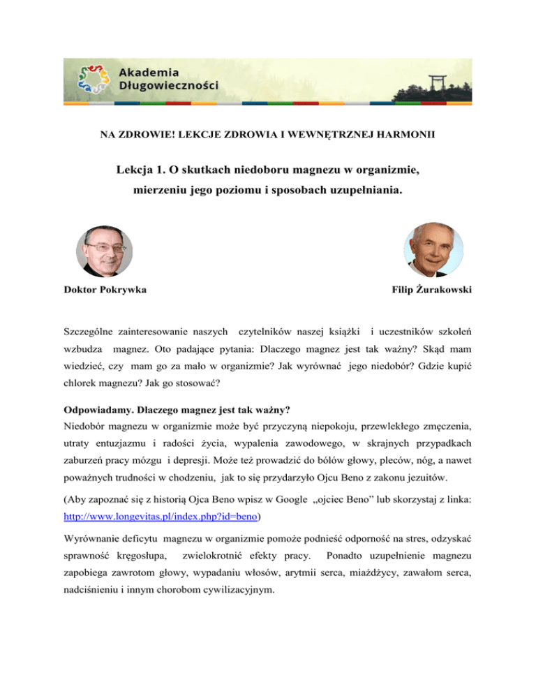 NA ZDROWIE! LEKCJE ZDROWIA I WEWNĘTRZNEJ HARMONII Lekcja 1. O skutkach niedoboru magnezu w organizmie, mierzeniu jego poziomu i sposobach uzupełniania. Filip Żurakowski Doktor Pokrywka Szczególne zainteresowanie naszych wzbudza czytelników naszej książki i uczestników szkoleń magnez. Oto padające pytania: Dlaczego magnez jest tak ważny? Skąd mam wiedzieć, czy mam go za mało w organizmie? Jak wyrównać jego niedobór? Gdzie kupić chlorek magnezu? Jak go stosować? Odpowiadamy. Dlaczego magnez jest tak ważny? Niedobór magnezu w organizmie może być przyczyną niepokoju, przewlekłego zmęczenia, utraty entuzjazmu i radości życia, wypalenia zawodowego, w skrajnych przypadkach zaburzeń pracy mózgu i depresji. Może też prowadzić do bólów głowy, pleców, nóg, a nawet poważnych trudności w chodzeniu, jak to się przydarzyło Ojcu Beno z zakonu jezuitów. (Aby zapoznać się z historią Ojca Beno wpisz w Google „ojciec Beno” lub skorzystaj z linka: http://www.longevitas.pl/index.php?id=beno) Wyrównanie deficytu magnezu w organizmie pomoże podnieść odporność na stres, odzyskać sprawność kręgosłupa, zwielokrotnić efekty pracy. Ponadto uzupełnienie magnezu zapobiega zawrotom głowy, wypadaniu włosów, arytmii serca, miażdżycy, zawałom serca, nadciśnieniu i innym chorobom cywilizacyjnym. Skąd mam wiedzieć, czy mam go za mało w organizmie? Jak go uzupełnić? Najbardziej widoczne objawy zbyt niskiego poziomu magnezu w organizmie to drganie powiek lub skurcze łydek, zaburzenia snu, rozdrażnienie. Aby zmierzyć swój poziom magnezu, zrób badanie krwi w laboratorium. A jak ten poziom podnieść? Są lepsze sposoby niż tabletki. Picie rozpuszczonej w wodzie soli Ojca Beno, moczenie nóg w roztworze chlorku magnezu, natryskiwanie ciała tzw. oliwą magnezową i inne sposoby. Fot. Szymon Kliszewski Coś dla ducha Dlaczego się nie uśmiechasz? Bo ci się nie chce. Bo wygodniej i łatwiej tkwić w smutku. Dlaczego nie dajesz rzeczy na miejsce, nie utrzymujesz porządku? Bo ci się nie chce. Bo wygodniej i łatwiej żyć w bałaganie i chaosie. Dlaczego odwlekasz wiele spraw, zamiast załatwić je od razu? Bo ci się nie chce. Bo wygodniej i łatwiej żyć lenistwie i marazmie. Ale to polityka krótkowzroczna. Na dłuższą metę okazuje się, że szczęście, zadowolenie, satysfakcję, wyniki – daje życie w stanie radości, zapału, entuzjazmu, porządku, samodyscypliny, automotywacji, działania „od razu”. Daj światu to, co masz najlepszego, a on ci to odda stokrotnie. Dobro krąży i powraca. NOWA KSIĄŻKA! Bestseller Sensusa www.drpokrywka.pl www.filip-zurakowski.com