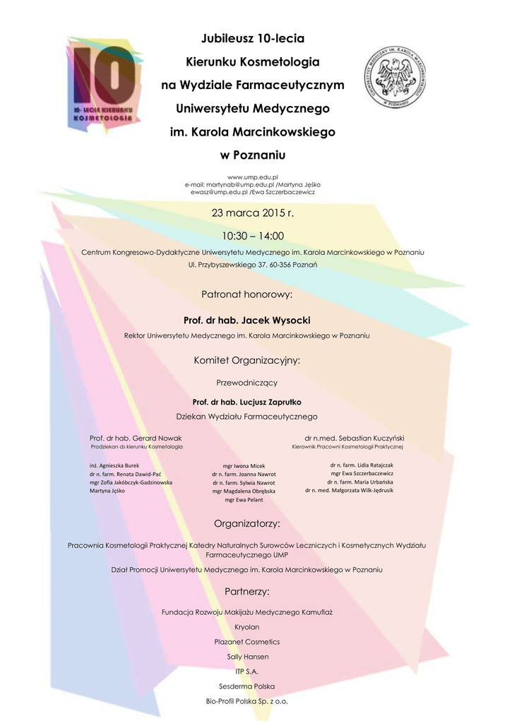 Jubileusz 10-lecia Kierunku Kosmetologia na Wydziale Farmaceutycznym Uniwersytetu Medycznego im. Karola Marcinkowskiego w Poznaniu www.ump.edu.pl e-mail: [email protected] /Martyna Jęśko [email protected] /Ewa Szczerbaczewicz 23 marca 2015 r. 10:30 – 14:00 Centrum Kongresowo-Dydaktyczne Uniwersytetu Medycznego im. Karola Marcinkowskiego w Poznaniu Ul. Przybyszewskiego 37, 60-356 Poznań Patronat honorowy: Prof. dr hab. Jacek Wysocki Rektor Uniwersytetu Medycznego im. Karola Marcinkowskiego w Poznaniu Komitet Organizacyjny: Przewodniczący Prof. dr hab. Lucjusz Zaprutko Dziekan Wydziału Farmaceutycznego Prof. dr hab. Gerard Nowak dr n.med. Sebastian Kuczyński Prodziekan ds kierunku Kosmetologia Kierownik Pracowni Kosmetologii Praktycznej inż. Agnieszka Burek dr n. farm. Renata Dawid-Pać mgr Zofia Jakóbczyk-Gadzinowska Martyna Jęśko mgr Iwona Micek dr n. farm. Joanna Nawrot dr n. farm. Sylwia Nawrot mgr Magdalena Obrębska mgr Ewa Pelant dr n. farm. Lidia Ratajczak mgr Ewa Szczerbaczewicz dr n. farm. Maria Urbańska dr n. med. Małgorzata Wilk-Jędrusik Organizatorzy: Pracownia Kosmetologii Praktycznej Katedry Naturalnych Surowców Leczniczych i Kosmetycznych Wydziału Farmaceutycznego UMP Dział Promocji Uniwersytetu Medycznego im. Karola Marcinkowskiego w Poznaniu Partnerzy: Fundacja Rozwoju Makijażu Medycznego Kamuflaż Kryolan Plazanet Cosmetics Sally Hansen ITP S.A. Sesderma Polska Bio-Profil Polska Sp. z o.o. Program obchodów jubileuszu 10-lecia Kierunku Kosmetologia na Wydziale Farmaceutycznym Uniwersytetu Medycznego im. Karola Marcinkowskiego w Poznaniu 23 marca 2015 r, 10:30 – 14:00, Centrum Kongresowo-Dydaktyczne UMP Ul. Przybyszewskiego 37, 60-356 Poznań Serdecznie zapraszamy wszystkich Pracowników i Studentów UMP do uczestnictwa w obchodach Jubileuszu. W programie wykłady i prezentacje nauczycieli Praktycznej Katedry akademickich Naturalnych Pracowni Surowców Kosmetologii Leczniczych i Kosmetycznych oraz pokazy i konkursy współpracujących z nią firm kosmetycznych. 10:30 Powitanie UCZESTNIKÓW spotkania przez prof. dr hab. Lucjusza Zaprutkę 10:35 – 11:00 10 lat studiów na Kierunku Kosmetologia na Uniwersytecie Medycznym im. Karola Marcinkowskiego w Poznaniu: prof. dr hab. Lucjusz Zaprutko 11:00 – 11:20 dr Sebastian Kuczyński: Piękno we współczesnym świecie. Czy można wpłynąć na swoją atrakcyjność? 11:20 – 11:40 dr Małgorzata Wilk-Jędrusik: Pielęgnacja cery trądzikowej. Czy trądzik pospolity należy leczyć? 11:40 – 12:00 dr Sylwia Nawrot: Makijaż medyczny jako element terapii 12:00 - 12:20 mgr Iwona Micek: Współczesne metody na gładkie ciało. Czy należy usuwać niepożądane owłosienie? 12:20 – 12:40 mgr Ewa Pelant: Podologia jako nowa specjalizacja w kosmetologii 12:40 – 14:00 Prezentacje firm: Fundacja Rozwoju Makijażu Medycznego Kamuflaż, Kryolan, Sesderma Polska, Bio-Profil Polska Sp. z o.o., ITP. S.A, Plazanet Cosmetics, Sally Hansen