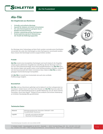 Alu-Tile Produktblatt Alu-Tile Der Ziegelersatz aus Aluminium • • • • • Schnelle und einfache Montage Speziell für Gebiete mit hohen Schneelasten Für viele Dachziegelarten geeignet durch flexible Anschlussschürze Direkter Lasteintrag auf den Dachsparren Kostenoptimierung durch Reduzierung der Anzahl der Befestigungspunkte Zur Montage einer Solaranlage auf dem Dach werden normalerweise Dachhaken verwendet, die unter den Dachziegeln an den Dachsparren verschraubt werden. Dazu müssen die Dachziegel zumeist ausgeschnitten werden. Produkt Alu-Tile ersetzt einen kompletten Dachziegel und macht dadurch die Ziegelbearbeitung bei zahlreichen Ziegelformen überflüssig. Bei der Montage wird nur ein Torx T40-Schlüssel benötigt. Durch die kompakte Bauform von Alu-Tile kann der einzelne Haken sehr große Lasten in die Dachkonstruktion einleiten, wodurch sich die Gesamtanzahl der Haken minimieren lässt. Dabei ist Alu-Tile zu vielen gängigen Dacheindeckungen kompatibel. Mit Alu-Tile ist sowohl eine horizontale wie auch eine vertikale Profilmontage möglich. Besonderheit Alu-Tile wird aus Aluminium gefertigt und ist dadurch von fast unbegrenzter Lebensdauer. Zudem lassen sich durch den Einsatz von Alu-Tile Haarrisse oder Ziegelbruch in der Dacheindeckung bei zu großer Belastung, wie z.B. durch Schnee, vermeiden. Durch den Rapid2+ Aufsatz ist eine einfache und sichere Anbindung an Schletter-Standardprofile gewährleistet. Technische Daten Material Befestigungselemente, Schrauben: Edelstahl 1.4301 Grundwerkstoff: Aluminium Logistik • Schnelle und einfache Montage • Maximaler Vorfertigungsgrad *Garantiebedingungen einzusehen unter www.schletter.de/AGB © Schletter GmbH • Gewerbegebiet an der B15 • Alustraße 1 • 83527 Kirchdorf/Haag i.OB • Tel.: +49 8072 9191-200 Fax: +49 8072 9191-9200 • E-Mail: [email protected] • www.schletter.de • Stand 11/2016 • Änderungen vorbehalten 1/2 Alu-Tile Produktblatt Kompatible Dachziegel Artikel Nr. 103003-000 103003-000 103003-000 103003-000 103003-009 103003-009 103003-014 103003-017 103003-024 103003-026 103003-026 103003-028 Alu blank Alu-Tile BEZ H+V Typ000 Set Alu-Tile BEZ H+V Typ000 Set Alu-Tile BEZ H+V Typ000 Set Alu-Tile BEZ H+V Typ000 Set Alu-Tile BEZ H+V Typ009 Set Alu-Tile BEZ H+V Typ009 Set Alu-Tile BEZ H+V Typ014 Set Alu-Tile BEZ H+V Typ017 Set Alu-Tile BEZ H+V Typ024 Set Alu-Tile BEZ H+V Typ026 Set Alu-Tile BEZ H+V Typ026 Set Alu-Tile BEZ H+V Typ028 Set 103003-000 Alu-Tile BEZ H+V Typ000 Set 103003-000 Alu-Tile BEZ H+V Typ000 Set 103003-001 103003-003 103003-005 103003-007 103003-009 103003-016 103003-019 103003-020 103003-020 103003-024 103003-025 Alu-Tile BEZ H+V Typ001 Set Alu-Tile BEZ H+V Typ003 Set Alu-Tile BEZ H+V Typ005 Set Alu-Tile BEZ H+V Typ007 Set Alu-Tile BEZ H+V Typ009 Set Alu-Tile BEZ H+V Typ016 Set Alu-Tile BEZ H+V Typ019 Set Alu-Tile BEZ H+V Typ020 Set Alu-Tile BEZ H+V Typ020 Set Alu-Tile BEZ H+V Typ024 Set Alu-Tile BEZ H+V Typ025 Set 103003-002 103003-003 103003-004 103003-006 103003-006 103003-008 103003-013 103003-015 103003-022 Alu-Tile BEZ H+V Typ002 Set Alu-Tile BEZ H+V Typ003 Set Alu-Tile BEZ H+V Typ004 Set Alu-Tile BEZ H+V Typ006 Set Alu-Tile BEZ H+V Typ006 Set Alu-Tile BEZ H+V Typ008 Set Alu-Tile BEZ H+V Typ013 Set Alu-Tile BEZ H+V Typ015 Set Alu-Tile BEZ H+V Typ022 Set 103003-000 Alu-Tile BEZ H+V Typ000 Set 103003-002 Alu-Tile BEZ H+V Typ002 Set 103003-023 Alu-Tile BEZ H+V Typ023 Set 103003-000 103003-010 103003-021 Alu-Tile BEZ H+V Typ000 Set Alu-Tile BEZ H+V Typ010 Set Alu-Tile BEZ H+V Typ021 Set 103003-030 Alu-Tile BEZ H+V Typ030 Set 103003-020 Alu-Tile BEZ H+V Typ020 Set 103003-009 103003-009 103003-009 103003-011 Alu-Tile BEZ H+V Typ009 Set Alu-Tile BEZ H+V Typ009 Set Alu-Tile BEZ H+V Typ009 Set Alu-Tile BEZ H+V Typ011 Set 103003-012 Alu-Tile BEZ H+V Typ012 Set 103003-029 Alu-Tile BEZ H+V Typ029 Set 103003-018 103003-031 Alu-Tile BEZ H+V Typ018 Set Alu-Tile BEZ H+V Typ031 Set 1 Zusatzmaßnahmen: Ziegel müssen leicht bearbeitet werden! Beachten Sie dazu unsere Montagebeiblätter zur Montageanleitung. Preis variiert! Alu-Tile für weitere Ziegelformen ab 200 Stk. Mindestabnahmemenge mit einer Lieferzeit von ca. 3 Wochen, vorbehaltlich der Verfügbarkeit geeigneter Musterziegel und Machbarkeit. Weitere Informationen unter www.schletter.de 2/2 © Schletter GmbH • Gewerbegebiet an der B15 • Alustraße 1 • 83527 Kirchdorf/Haag i.OB • Tel.: +49 8072 9191-200 Fax: +49 8072 9191-9200 • E-Mail: [email protected] • www.schletter.de • Stand 11/2016 • Änderungen vorbehalten © Schletter GmbH, 2016, I400197DE, V10 Vergleichsliste (sortiert nach Dachziegel-Hersteller) Braas / Monier Frankfurter Pfanne Taunus Pfanne Harzer Pfanne Doppel-S-Ziegel Topas 11V (Lattenabstand: min. 330 mm !) Topas 13V Tegalit 1 Harzer Pfanne 7 (BIG) Rubin 13V Hainstädter Rubin 11V Heisterholzer Rubin 11V Turmalin Bramac Classic / Donau Ceda Mareno / Asimmetrica Creaton Rustico Falzziegel Domino MZ3 Gratus Ratio Magnum 1 Rapido Premion Futura Harmonie Maxima Ergoldsbacher Falzziegel Großfalzziegel Erlus E58 / S Erlus Großfalzziegel XXL Erlus Reformpfanne XXL Erlus Karat 1 Erlus E58 plus 1 Erlus Linea Forma Eternit Göteborg / Heidelberg Jungmeier Falzziegel Mondo 15 Koramic Migeon Tuile Actua (Lattenabstand: min. 345mm!) Nelskamp S-Pfanne Finkenberger Pfanne Nibra F7 1 Redland Stoneworld II Rupp Keramik Rubin Schweizer Fabrikat - ZZWancor Swiss Flachschiebeziegel Jura 13 Züricher Ziegelei Istigh. 290 Flachschiebeziegel Fama Pfannenziegel Pada 13 Schweizer Fabrikat - Istighofener Swiss Doppelfalz 425 x 250 mm Tejas Borja TB-12 Tondach SULM Verschiebeziegel Biberfalz