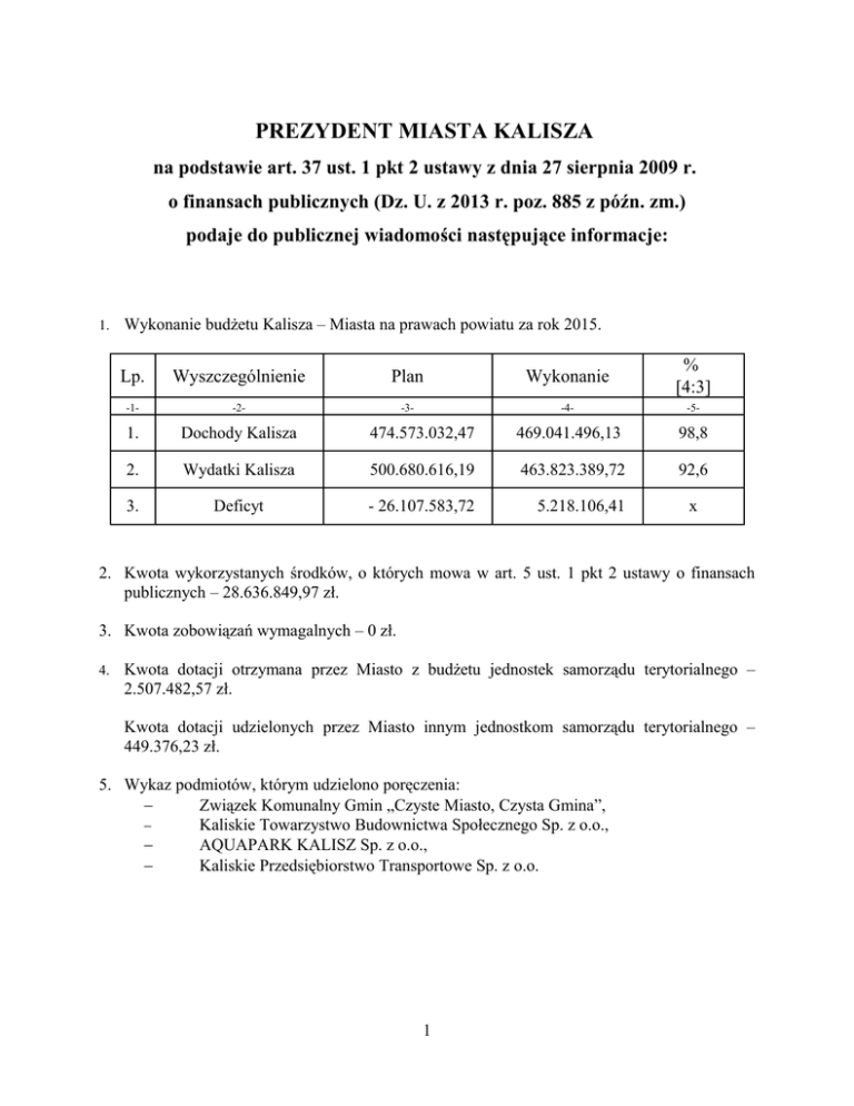 PREZYDENT MIASTA KALISZA na podstawie art. 37 ust. 1 pkt 2 ustawy z dnia 27 sierpnia 2009 r. o finansach publicznych (Dz. U. z 2013 r. poz. 885 z późn. zm.) podaje do publicznej wiadomości następujące informacje: 1. Wykonanie budżetu Kalisza – Miasta na prawach powiatu za rok 2015. Lp. Wyszczególnienie Plan Wykonanie % [4:3] -1- -2- -3- -4- -5- 1. Dochody Kalisza 474.573.032,47 469.041.496,13 98,8 2. Wydatki Kalisza 500.680.616,19 463.823.389,72 92,6 3. Deficyt - 26.107.583,72 5.218.106,41 x 2. Kwota wykorzystanych środków, o których mowa w art. 5 ust. 1 pkt 2 ustawy o finansach publicznych – 28.636.849,97 zł. 3. Kwota zobowiązań wymagalnych – 0 zł. 4. Kwota dotacji otrzymana przez Miasto z budżetu jednostek samorządu terytorialnego – 2.507.482,57 zł. Kwota dotacji udzielonych przez Miasto innym jednostkom samorządu terytorialnego – 449.376,23 zł. 5. Wykaz podmiotów, którym udzielono poręczenia: − Związek Komunalny Gmin „Czyste Miasto, Czysta Gmina”, − Kaliskie Towarzystwo Budownictwa Społecznego Sp. z o.o., − AQUAPARK KALISZ Sp. z o.o., − Kaliskie Przedsiębiorstwo Transportowe Sp. z o.o. 1 6. Wykaz osób prawnych i fizycznych oraz jednostek organizacyjnych nieposiadających osobowości prawnej, którym udzielono ulg, odroczeń, umorzeń lub rozłożono spłatę na raty w kwocie przewyższającej 500 zł: a) w zakresie podatków OSOBY PRAWNE I JEDNOSTKI ORGANIZACYJNE NIEPOSIADAJĄCE OSOBOWOŚCI PRAWNEJ Umorzenia Lp. 1. 2. 3. 4. Nazwa podatnika Kaliskie Linie Autobusowe Sp. z o.o. Parafia Ewangelicko – Augsburska Parafia Prawosławna pw. św. app. Piotra i Pawła Przedsiębiorstwo Komunikacji Samochodowej Sp. z o.o. RAZEM Kwota Przyczyna umorzenia 142.382,00 ważny interes podatnika i interes publiczny 1.857,60 ważny interes podatnika i interes publiczny 16.563,00 ważny interes podatnika i interes publiczny 115.947,00 ważny interes podatnika i interes publiczny 276.749,60 Rozłożenia na raty, odroczenia Lp. 1. 2. 3. 4. 5. 6. 7. 8. Nazwa podatnika Calfrost Sp. z o.o. Ennon Company Sp. z o.o. FRUTO J.V. Sp. z o.o. Kaliskie Linie Autobusowe Sp. z o.o. Magic Play Sp. z o.o. Parafia Ewangelicko – Augsburska Przedsiębiorstwo Komunikacji Samochodowej Sp. z o.o. Zakład Budowlany Stanisław Patyna Sp. Komandytowa OSOBY FIZYCZNE Umorzenia Lp. 1. 2. 3. 4. 5. 6. 7. 8. 9. Nazwisko i imię podatnika Adamiak Barbara i Stanisław Balcerzak Jadwiga Majtas Maria Mikuła Izabela i Wojciech Musielak Waldemar Ole Krystyna Rosiak Paweł Rosik Barbara Wieliński Romuald RAZEM Kwota 1.379,00 22.408,00 565,00 570,00 2.887,60 530,00 7.614,00 638,00 1.142,80 37.734,40 2 Przyczyna umorzenia ważny interes podatnika ważny interes podatnika ważny interes podatnika ważny interes podatnika ważny interes podatnika ważny interes podatnika ważny interes podatnika ważny interes podatnika ważny interes podatnika Rozłożenia na raty, odroczenia Lp. 1. 2. 3. 4. 5. 6. 7. 8. 9. 10. 11. 12. 13. 14. 15. 16. 17. 18. 19. 20. 21. 22. 23. 24. 25. 26. 27. 28. 29. 30. 31. Nazwisko i imię podatnika Banaszkiewicz Jerzy Cicha Karolina Dolińska Iwona Dulnik Joanna Dyonizy Violetta i Jerzy Gajewska Joanna Grabowski Józef Hardy Elżbieta i Robert Ignasiak Agnieszka Jerz Alina i Stanisław Jerz Stanisław Kozerka Izabela Krystek Urszula Kubiak Janina, Jakubowska Iwona Kurek Jolanta i Arkadiusz Kurzawa Ryszard Łuczak Tadeusz Mielcarek Katarzyna Nowak Eugeniusz Okoński Aleksander Patyna Stanisław Pilas Dorota P.U.P. SANBUD Edward Rataj Przyjazny Leszek i Emilia Samek Zdzisława i Edward Sołtysiak Halina Sołtysiak Maciej Staszak Teresa Szubert Piotr Wawrzyniak Jacek Zaremba Roman b) w zakresie opłat OSOBY FIZYCZNE Umorzenia L.p. 1. 2. 3. 4. 5. Nazwisko i imię Gałęska Marzena Krymarys Waldemar Rosik Barbara Stasiak Renata Wojtasik Jadwiga Kwota 1.032,00 1.207,00 564,00 976,00 760,00 3 Przyczyna umorzenia ważny interes podatnika ważny interes podatnika ważny interes podatnika ważny interes podatnika ważny interes podatnika 6. 7. 8. 9. 10. Duda Izabela Krawiec Elżbieta Muller Sylwia Walczak Beata Ziołański Marek RAZEM 16.795,94 690,24 29.647,53 1.733,69 3.637,64 57.044,04 Rozłożenia na raty, odroczenia L.p. 1. 2. 3. 4. 5. 6. 7. 8. 9. 10. 11. 12. 13. 14. 15. 16. 17. 18. 19. 20. 21. 22. 23. 24. 25. 26. 27. 28. 29. 30. 31. 32. 33. 34. 35. 36. 37. 38. Nazwisko i imię Babińska Adriana Bartoszczyk Bronisław Bogdaszewska Sławomira Bordych Edyta Bosacka-Makuła Magdalena Brzezicha Marlena Czajkowska Barbara Dolecka Kamila Druciarek Dariusz Dudek Renata Dutkowska Katarzyna Dymarczyk Martyna Dymarczyk Monika Dziwińska Karolina Fankidejska Dagmara Fikcińska Dorota Flas Mariola Gałązka Sylwia Gorzałka Joanna Górna Barbara Górny Tomasz Grzelakowska Anna Hardy Elżbieta i Robert Jankowski Zbigniew Jaranowska Małgorzata Jaworska Beata Jaworski Ryszard Kapitaniak Jan Kołeczko Agata Kołton Regina Kowalczyk Tomasz Kowalska Ewelina Krasnosielska Żaneta Krzeszkiewicz Anna Kubińska Barbara Kubera Jolanta Kubisiak Marta Kuświk Skrzypek Katarzyna 4 ważny interes dłużnika ważny interes dłużnika ważny interes dłużnika ważny interes dłużnika ważny interes dłużnika 39. 40. 41. 42. 43. 44. 45. 46. 47. 48. 49. 50. 51. 52. 53. 54. 55. 56. 57. 58. 59. 60. 61. 62. 63. 64. Mocna Kinga Mocna Teresa Muller Sylwia Nogaj Ewelina Nowak Agata Nowakowska Ewa Pawlak Karolina Pieczarka Karolina Pieper Dorota Przybylska Gancarz Magdalena Rogala Zenon Sławińska Wioletta Strejczek Magdalena Szewczyk Adrian Śliwiński Włodzimierz Ślusarski Donat Tokarek Beata Tomczak Agnieszka Trębacz Agata Urbaniak Aleksandra Urbaniak Izabela Urbaniak Paula Włodarczyk Iwona Wojdecka Karina Wroniecki Piotr Zajdel Barbara 7. Wykaz osób prawnych i fizycznych, którym udzielono pomocy publicznej OSOBY PRAWNE Lp. 1. 2. 3. 4. 5. 6. 7. 8. 9. 10. 11. 12. 13. Nazwa firmy Calfrost Sp. z o.o. FRUTO J.V. Sp. z o.o. Kaliskie Linie Autobusowe Sp. z o.o. Magic Play Sp. z o.o. Parafia Ewangelicko –