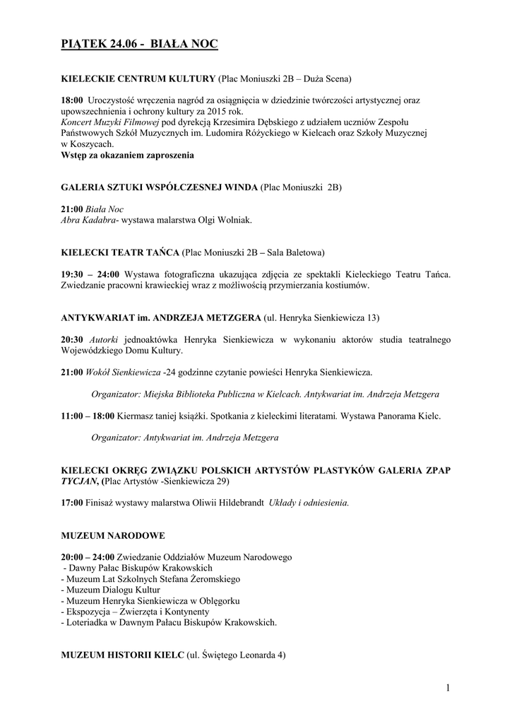 PIĄTEK 24.06 - BIAŁA NOC KIELECKIE CENTRUM KULTURY (Plac Moniuszki 2B – Duża Scena) 18:00 Uroczystość wręczenia nagród za osiągnięcia w dziedzinie twórczości artystycznej oraz upowszechnienia i ochrony kultury za 2015 rok. Koncert Muzyki Filmowej pod dyrekcją Krzesimira Dębskiego z udziałem uczniów Zespołu Państwowych Szkół Muzycznych im. Ludomira Różyckiego w Kielcach oraz Szkoły Muzycznej w Koszycach. Wstęp za okazaniem zaproszenia GALERIA SZTUKI WSPÓŁCZESNEJ WINDA (Plac Moniuszki 2B) 21:00 Biała Noc Abra Kadabra- wystawa malarstwa Olgi Wolniak. KIELECKI TEATR TAŃCA (Plac Moniuszki 2B – Sala Baletowa) 19:30 – 24:00 Wystawa fotograficzna ukazująca zdjęcia ze spektakli Kieleckiego Teatru Tańca. Zwiedzanie pracowni krawieckiej wraz z możliwością przymierzania kostiumów. ANTYKWARIAT im. ANDRZEJA METZGERA (ul. Henryka Sienkiewicza 13) 20:30 Autorki jednoaktówka Henryka Sienkiewicza w wykonaniu aktorów studia teatralnego Wojewódzkiego Domu Kultury. 21:00 Wokół Sienkiewicza -24 godzinne czytanie powieści Henryka Sienkiewicza. Organizator: Miejska Biblioteka Publiczna w Kielcach. Antykwariat im. Andrzeja Metzgera 11:00 – 18:00 Kiermasz taniej książki. Spotkania z kieleckimi literatami. Wystawa Panorama Kielc. Organizator: Antykwariat im. Andrzeja Metzgera KIELECKI OKRĘG ZWIĄZKU POLSKICH ARTYSTÓW PLASTYKÓW GALERIA ZPAP TYCJAN, (Plac Artystów -Sienkiewicza 29) 17:00 Finisaż wystawy malarstwa Oliwii Hildebrandt Układy i odniesienia. MUZEUM NARODOWE 20:00 – 24:00 Zwiedzanie Oddziałów Muzeum Narodowego - Dawny Pałac Biskupów Krakowskich - Muzeum Lat Szkolnych Stefana Żeromskiego - Muzeum Dialogu Kultur - Muzeum Henryka Sienkiewicza w Oblęgorku - Ekspozycja – Zwierzęta i Kontynenty - Loteriadka w Dawnym Pałacu Biskupów Krakowskich. MUZEUM HISTORII KIELC (ul. Świętego Leonarda 4) 1 19:00 - 23:00 Bezpłatne zwiedzanie Muzeum, prezentacja dawnej fotografii Kielc na dziedzińcu muzeum. Udział w grze muzealnej MUZEAIKA. PAŁAC BISKUPÓW KRAKOWSKICH 17:00 Otwarta próba koncertu pianistów z Młodzieżowego Domu Kultury i Małej Akademii Muzycznej. Organizator: Młodzieżowy Dom Kultury KOŚCIÓŁ EWANGELICKO-AUGSBURSKI (ul. Henryka Sienkiewicza 1) 18:00 Koncert kameralny w wykonaniu uczniów i nauczycieli z Młodzieżowego Domu Kultury i zaproszonych gości. Organizator: Młodzieżowy Dom Kultury TEATR LALKI I AKTORA KUBUŚ W KIELCACH (ul. Duża 9) 20:00 – 20:50 Jasno/Ciemno – spektakl z cyklu „Baja dla najnaja” dla dzieci od 1 do 5 lat. Bezpłatne wejściówki (dziecko + osoba towarzysząca) będą wydawane na godzinę przed spektaklem w kasie teatru. Spektakl jest grany w namiocie na terenie teatru. Widzowie proszeni są o przyniesienie ze sobą obuwia na zmianę lub ciepłych skarpetek. BIURO WYSTAW ARTYSTYCZNYCH (ul. Kapitulna 2) 17:00 Przedwiośnie 39 – wernisaż wystawy pokonkursowej Interdyscyplinarnego Konkursu Plastyki Województwa Świętokrzyskiego 2016 – Galeria Górna i Dolna BWA w Kielcach. Foto- notatki na temat: Sienkiewiczowskie inspiracje – wystawa fotografia- Galeria Mała Organizator: BWA i ZPAF Okręg Świętokrzyski GEOPARK KIELCE – CENTRUM EDUKACJI (ul. Daleszycka 21) 19:00 – 20:00 Z piórem i młotkiem czyli geologiczno – literacka podróż przez świętokrzyskie – pokaz multimedialny. 20:00 – 21:00 Quo Vadis skało?– warsztaty szlifowania i polerowanie skał. 20:00 – 21:00 Geo – czytanki nocą – opowieści literackie o świętokrzyskim kamieniu. 20:00 – 23:00 Nocny Marku zagraj w Geoparku – gra geologiczna na terenie Centrum Geoedukacji. DOM ŚRODOWISK TWÓRCZYCH PAŁAC TOMASZA ZIELIŃSKIEGO - OGRÓD (ul. Zamkowa 5) 21:00 Ach jak przyjemnie koncert zespołu Klang. GALERIA WSPÓŁCZESNEJ SZTUKI SAKRALNEJ DOM PRACZKI (ul. Zamkowa 5/7) 2 18:00 – 24:00 – wystawa Ptaki i ryby Józefa Wilkonia. DOM KULTURY ZAMECZEK (ul. Jana Słowackiego 23) 18:00 PHOTOmini wystawa fotografii artystyczno – podróżniczych regionu Gór Świętokrzyskich Galeria ART-STYL DK Zameczek. 20:00 – 23:00 Zameczkowa Noc Kabaretowa. Prezentacje Zameczkowych Grup Kabaretowych i zaproszonych gości, wystąpią: Kabaret z Konopi, Kabaret Bez Próby, Kabaret Inaczej. OŚRODEK KULTURY ZIEMOWIT (ul. Mieszka I 79) 18:00 – 20:00 Rodzinny Festyn z Ziemkiem W programie: Galeria m – „Sienkiewicza od początku” – wystawa, „Przystanek sztuka” – wystawa prac dzieci z sekcji plastycznej Ośrodka Kultury Ziemowit, konkursy muzyczne, animacje plastyczne. OŚRODEK KULTURY BIAŁOGON (ul. Pańska 1A) 18:00 – 21:00 W rytmie lata –piknik artystyczny organizowany przy współpracy z Komendą Kieleckiej Chorągwi Związku Harcerstwa Polskiego. W programie: Przy ognisku – spotkanie z piosenką dziecięcą i turystyczną, gry i zabawy edukacyjne. Galeria Trzy Kolory – plenerowa wystawa prac i biżuterii artystycznej. MIEJSKA BIBLIOTEKA PUBLICZNA W KIELCACH Filia nr 1 (ul. Karczówkowska 20) 10:00 Ulica Sienkiewicza wczoraj i dziś - otwarcie wystawy. Filia nr 2 (ul. Krzemionkowa 1) 10:00 Afrykańska przygoda - podsumowanie konkursu plastycznego na ilustrację do książki W pustyni i w puszczy. 12:00 Z piórem czy mieczem. Opowieść o Henryku Sienkiewiczu - spotkanie promujące książkę. Filia nr 3 (ul. Jagiellońska 36) 12:00 W starych Kielcach - prezentacja książek o Kielcach i czytanie wybranych fragmentów. Filia nr 4 (ul. Górnicza 36) 10:00 Mieszkanie bez książki ciemniejsze jest niż bez lampy - wystawa dzieł Henryka Sienkiewicza oraz opracowań poświęconych pisarzowi. 10:00 Przygoda ze słoniem - spotkanie z dziećmi wprowadzające w twórczość H. Sienkiewicza połączone z zajęciami plastycznymi. Filia nr 5 (ul. Warszawska 147) 10:00 Szkice węglem -ulica Sienkiewicza przed wiekami wystawa pokonkursowa prac dzieci. Filia nr 6 (ul. Wikaryjska 1) 15:30 Fraszki o Henryku Sienkiewiczu. Filia nr 8 ( Barwinek 31) 11:30 Kmicic i Oleńka prezentują strój szlachecki – impreza dla dzi