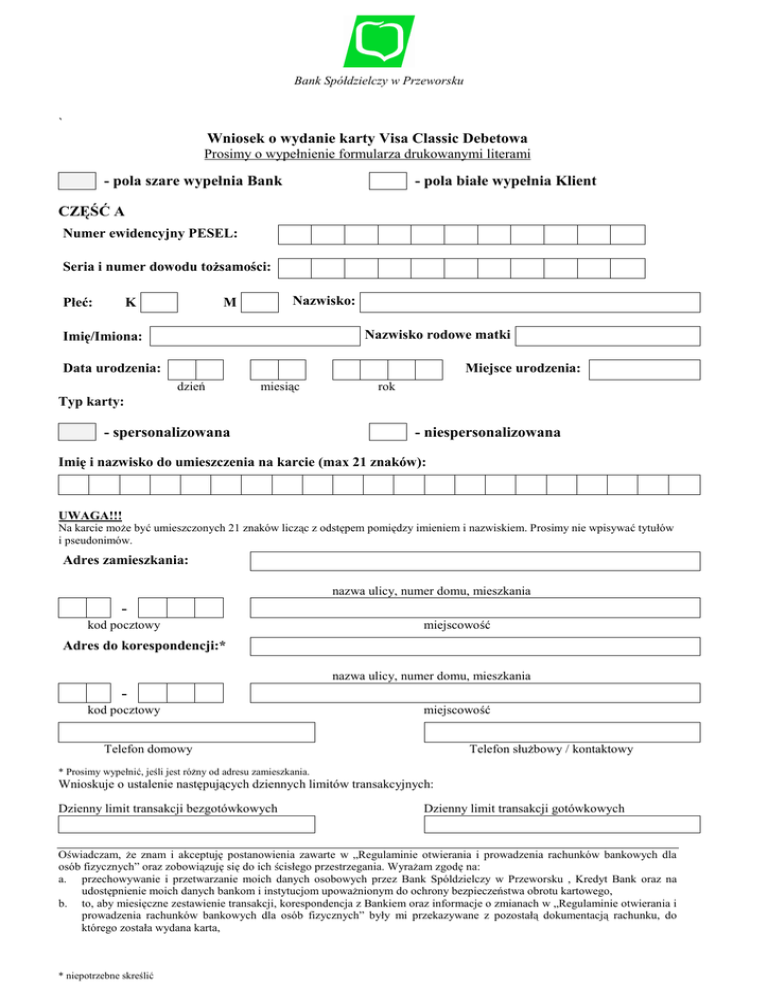 Bank Spółdzielczy w Przeworsku ` Wniosek o wydanie karty Visa Classic Debetowa Prosimy o wypełnienie formularza drukowanymi literami - pola szare wypełnia Bank - pola białe wypełnia Klient CZĘŚĆ A Numer ewidencyjny PESEL: Seria i numer dowodu tożsamości: Płeć: Nazwisko: M K Nazwisko rodowe matki Imię/Imiona: Data urodzenia: Miejsce urodzenia: dzień miesiąc rok Typ karty: - spersonalizowana - niespersonalizowana Imię i nazwisko do umieszczenia na karcie (max 21 znaków): UWAGA!!! Na karcie może być umieszczonych 21 znaków licząc z odstępem pomiędzy imieniem i nazwiskiem. Prosimy nie wpisywać tytułów i pseudonimów. Adres zamieszkania: nazwa ulicy, numer domu, mieszkania kod pocztowy miejscowość Adres do korespondencji:* nazwa ulicy, numer domu, mieszkania kod pocztowy miejscowość Telefon domowy Telefon służbowy / kontaktowy * Prosimy wypełnić, jeśli jest różny od adresu zamieszkania. Wnioskuje o ustalenie następujących dziennych limitów transakcyjnych: Dzienny limit transakcji bezgotówkowych Dzienny limit transakcji gotówkowych Oświadczam, że znam i akceptuję postanowienia zawarte w „Regulaminie otwierania i prowadzenia rachunków bankowych dla osób fizycznych” oraz zobowiązuję się do ich ścisłego przestrzegania. Wyrażam zgodę na: a. przechowywanie i przetwarzanie moich danych osobowych przez Bank Spóldzielczy w Przeworsku , Kredyt Bank oraz na udostępnienie moich danych bankom i instytucjom upoważnionym do ochrony bezpieczeństwa obrotu kartowego, b. to, aby miesięczne zestawienie transakcji, korespondencja z Bankiem oraz informacje o zmianach w „Regulaminie otwierania i prowadzenia rachunków bankowych dla osób fizycznych” były mi przekazywane z pozostałą dokumentacją rachunku, do którego została wydana karta, * niepotrzebne skreślić c. to, aby Bank kontaktował się ze mną w pozostałych sprawach związanych z obsługą kart: telefonicznie / pisemnie (listem zwykłym)*. miejscowość i data podpis Użytkownika karty CZĘŚĆ B Przyjmuję do wiadomości, że złożenie przeze mnie wniosku o wydanie karty dla innej osoby fizycznej oznacza udzielenie wskazanej osobie pełnomocnictwa, zgodnie z zakresem uprawnień określonych w „Regulaminie otwierania i prowadzenia rachunków bankowych dla osób fizycznych” do dokonywania rozliczeń transakcji przy użyciu karty płatniczej w ciężar mojego konta osobistego. miejscowość i data podpis Posiadacza rachunku WYPEŁNIA PLACÓWKA SPRZEDAŻOWA BANKU Data przyjęcia wniosku stempel dzienny i podpis pracownika przyjmującego wniosek Karta wydana do rachunku (pełny numer) Nr karty Decyzja banku ...................................................................................................................................................................... ...................................................................................................................................................................... ...................................................................................................................................................................... ................................................................................................................................................................... miejscowość i data podpis i stempel kasowo-memoriałowy /pieczątka imienna upoważnionego pracownika Adnotacje ...................................................................................................................................................................... ...................................................................................................................................................................... ......................................................................................................................................................................
