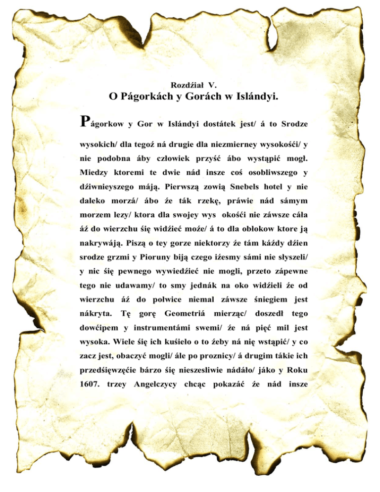 Rozdźiał V. O Págorkách y Gorách w Islándyi. Págorkow y Gor w Islándyi dostátek jest/ á to Srodze wysokich/ dla tegoź ná drugie dla niezmierney wysokośći/ y nie podobna áby człowiek przyść ábo wystąpić mogł. Miedzy ktoremi te dwie nád insze coś osobliwszego y dźiwnieyszego máją. Pierwszą zowią Snebels hotel y nie daleko morzá/ ábo źe ták rzekę, práwie nád sámym morzem lezy/ ktora dla swojey wys okośći nie záwsze cáła áź do wierzchu śię widźieć moźe/ á to dla obłokow ktore ją nakrywáją. Piszą o tey gorze niektorzy źe tám káźdy dźien srodze grzmi y Pioruny biją czego iźesmy sámi nie słyszeli/ y nic śię pewnego wywiedźieć nie mogli, przeto zápewne tego nie udawamy/ to smy jednák na oko widźieli źe od wierzchu áź do połwice niemal záwsze śniegiem jest nákryta. Tę gorę Geometriá mierząc/ doszedł tego dowćipem y instrumentámi swemi/ źe ná pięć mil jest wysoka. Wiele śię ich kuśieło o to źeby ná nię wstąpić/ y co zacz jest, obaczyć mogli/ ále po proznicy/ á drugim tákie ich przedśięwzęćie bárzo śię nieszesliwie nádáło/ jáko y Roku 1607. trzey Angelczycy chcąc pokazáć źe nád insze śmielszimi są/ zeby śię czego pewnego o tey gorze dowiedźieć mogli/ poszli ná nię/ y jáko śię domyślawają juź beli dáleko przyszli ále śię znowu nie wroćieli/ ták że do tego dniá nie wiedzą kędy śię podźieli/ piesek telko ich/ ktorego z sobą mieli wroćieł śię beł / ale bez śierśći/ nie inaczey jedno jákoby go ukropem opárzono/ dorozumieć śię jednák nie trudno/ źe ábo ich wiátr gwałtowny porwał á dokąd zániosł/ ábo teź powietrzem jákim szkodliwym y nieznośnym záráźeni tám padszy pomárli. Druga Gora jest co ją zowią Hecla/ ábo Heðelsberg ná trzy miele od Schalholtu/ takźe bárzo wielka szeroka, wysoka/ y ná weyrzeniu bárzo strászliwa/ ták iź od sámego na nię weyrzenia musi śię czlowiek wzdrygnąć y ulęknąć. Jest ná niey bárzo wiele nie wielkich opok opalonych y srodze czarnych á miedzy niemi rozmáite jáskinie y dźiury widáć. Wiele tám jest rzeczy Cudownych ale miedzy niemi to osobliwie: źe Ogien y płomien bez przestanku strászny z niey występuje/ ktory jednak czasem więtszy/ czasem mnieyszy bywa/ ale prećię ustawiczny:dla tegosz y dym záwsze śię zniey gwałtownie kurzy/ y nad nią jako obłok niejaki czarny śię záwiesza/ czym sámym ta Gorá wszytkie insze tákźe Cudowne gory/ jako Ethnę w Syciliy, przewysza: często, á osobliwie źimie/ kiedy u nich oná tak długá/ jáko śię juź powiedźiało/ noc jest/ ten płomien z tey gory występujący całą onę wyspę oświeca: kamienie teź z siebie srodze wysoko y dáleko wyrzuca/ tak źe ná dwie mile y daliey/ nikt tám koło oney gory mieszkáć nie moźe y nie śmie: do tego, wrzask, krzyk y láment wlasnie ludzki teź tám słychać. Płomien on zniey występujący áni pápieru áni płotná/ y tym inszych podobnych suchych rzeczy nie pali/ ale co telko źywego ábo mokrego zárwie w okámgnieniu to pali/ z tądźe im bárziey tam Rok bywa mokrzeyszy tym więtszy śię on płomien ukázuie/ osobliwie Zimie kiedy wiele sniegu nápáda. Obłudy teźrozmaite tym co tam nie dáleko niey mieszkáją/ takźe y ludźie niektorzy z tych co niedawno przed tym beli pomárli: się pokázuią/ ktorych gdy pytáją/ co tu czynią/ y czemu raczey zdrugiemi do domow swych śię powroćić nie máją, ná to oni bárzo smutnie y z westchnieniem odpowiádáją, mowiąc: iź ich do Hecle posłano, á źe tá znowu odeyść y powroćić śię koniecznie muszą. Pospolićie tá Gorá srodze więc gorzeć y dźwięk strászny z siebie wydawáć zwykłá/ gdy śię co znácznego y nowego na Swiećie stáć ma/ abo gdy osobliwa jaka odmiáná rzeczy nástępuie: y juź to Islanderowie zá pewny znák mają/ źe cokolwiek niezwyczáinego á rzadkiego kędykolwiek śię stáć ma lecz coby y kędy beło wiedźieć zaraz nie mogą/ áź dopiero kiedy z Niemiec ábo z inąd kupcy do nich przyiádą/ y onym, jesli co nowego máją powiádáją. Kuśieli śię niektorzy oto źeby zblizá do tey Gory przystąpieli/ aleć śię im to nigdy nie nádáło/ owszem częstokroć/ ábo wielkiego niebespieczenstwá y stráchu śię nábráć, abo teź y gardłá postradáć muśieli. Pod czas wiele śię ich tám ku oney Gorze zwykło przechodźić/ ále nie wszyscy śię z tey przechaczki wracáją/ bo około niey wiele przepasći/ rozpádlin y jam dziwnych jest/ ktore rowno z inszą ziemią popiołem są wypełnione/ ná jákowe miesce kto telko z tych co tám chodzą/ stąpi/ záraz w okámgnieniu, do głębokośći oney przez ten popioł leći/ nie ináczy jákoby kto do státku kwápem nápełnionego w pádł. Niektorzy teź, co śię nie mája ná baczeniu ( gdysz we wnetrzny on Ogien y máłe y wielkie kámienie z siebie wyrzuca ) kámieniem tym pozábijáni y wniwecz pokruszeni bywáją. Drudzy y od płomienia ktory niespodźiewánie z dźiur oney Gory dáleko wyskakuje záchwyceni giną: aź náwet wiele ich teź y od sámego stráchu przed obłudámi/ ktorych śię tám nie mało pokázuie/ nie telko bez pámieći omdlewa/ ale teź gdy ich w tym przypadku drudzy rátowáć ábo nie mogą ábo nie umieją/ umiera. O wa zgołá názbyt to śmiáły bydź muśi/ y o źiwot swoy máło dbájący/ ktory zblizu do tey Gory przystąpić/ á dopieroź ná nię wstąpić chce: ábowiem gdy kto choć z dáleká śię jey przypátruje/ nie podobna áby śię zlęknąć niemiał/ y aby mu, jako mowią, włosy ná głowie od stráchu stánąc nie miáły. Z tądźe teź dla tych juź námienionych y wielu inszych przyczyn/ śiełá ich tego rozumienia beło źeby tu Piekło/ abo mieysce ná wieczne męki oddánych ludźi bydź miało: ábo przynamniey/ źe tu jáka wzdey przećię fortka do srogiego tego Jeźiorá/ gorającego Ogniem y Siárką jest. Co jesli śię ták ma ábo nie/ twier