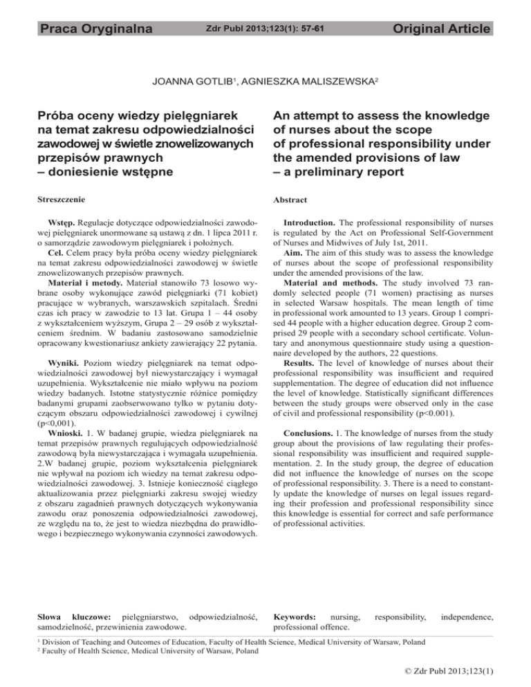 Praca Oryginalna Original Article Zdr Publ 2013;123(1): ������ ����� -61 JOANNA GOTLIB1, AGNIESZKA MALISZEWSKA2 Próba oceny wiedzy pielęgniarek na temat zakresu odpowiedzialności zawodowej w świetle znowelizowanych przepisów prawnych – doniesienie wstępne An attempt to assess the knowledge of nurses about the scope of professional responsibility under the amended provisions of law – a preliminary report Streszczenie Abstract Wstęp. Regulacje dotyczące odpowiedzialności zawodowej pielęgniarek unormowane są ustawą z dn. 1 lipca 2011 r. o samorządzie zawodowym pielęgniarek i położnych. Cel. Celem pracy była próba oceny wiedzy pielęgniarek na temat zakresu odpowiedzialności zawodowej w świetle znowelizowanych przepisów prawnych. Materiał i metody. Materiał stanowiło 73 losowo wybrane osoby wykonujące zawód pielęgniarki (71 kobiet) pracujące w wybranych, warszawskich szpitalach. Średni czas ich pracy w zawodzie to 13 lat. Grupa 1 – 44 osoby z wykształceniem wyższym, Grupa 2 – 29 osób z wykształceniem średnim. W badaniu zastosowano samodzielnie opracowany kwestionariusz ankiety zawierający 22 pytania. Introduction. The professional responsibility of nurses is regulated by the Act on Professional Self-Government of Nurses and Midwives of July 1st, 2011. Aim. The aim of this study was to assess the knowledge of nurses about the scope of professional responsibility under the amended provisions of the law. Material and methods. The study involved 73 randomly selected people (71 women) practising as nurses in selected Warsaw hospitals. The mean length of time in professional work amounted to 13 years. Group 1 comprised 44 people with a higher education degree. Group 2 comprised 29 people with a secondary school certificate. Voluntary and anonymous questionnaire study using a questionnaire developed by the authors, 22 questions. Results. The level of knowledge of nurses about their professional responsibility was insufficient and required supplementation. The degree of education did not influence the level of knowledge. Statistically significant differences between the study groups were observed only in the case of civil and professional responsibility (p<0.001). Wyniki. Poziom wiedzy pielęgniarek na temat odpowiedzialności zawodowej był niewystarczający i wymagał uzupełnienia. Wykształcenie nie miało wpływu na poziom wiedzy badanych. Istotne statystycznie różnice pomiędzy badanymi grupami zaobserwowano tylko w pytaniu dotyczącym obszaru odpowiedzialności zawodowej i cywilnej (p<0,001). Wnioski. 1. W badanej grupie, wiedza pielęgniarek na temat przepisów prawnych regulujących odpowiedzialność zawodową była niewystarczająca i wymagała uzupełnienia. 2.W badanej grupie, poziom wykształcenia pielęgniarek nie wpływał na poziom ich wiedzy na temat zakresu odpowiedzialności zawodowej. 3. Istnieje konieczność ciągłego aktualizowania przez pielęgniarki zakresu swojej wiedzy z obszaru zagadnień prawnych dotyczących wykonywania zawodu oraz ponoszenia odpowiedzialności zawodowej, ze względu na to, że jest to wiedza niezbędna do prawidłowego i bezpiecznego wykonywania czynności zawodowych. Słowa kluczowe: pielęgniarstwo, odpowiedzialność, samodzielność, przewinienia zawodowe. 1 2 Conclusions. 1. The knowledge of nurses from the study group about the provisions of law regulating their professional responsibility was insufficient and required supplementation. 2. In the study group, the degree of education did not influence the knowledge of nurses on the scope of professional responsibility. 3. There is a need to constantly update the knowledge of nurses on legal issues regarding their profession and professional responsibility since this knowledge is essential for correct and safe performance of professional activities. Keywords: nursing, professional offence. responsibility, independence, Division of Teaching and Outcomes of Education, Faculty of Health Science, Medical University of Warsaw, Poland Faculty of Health Science, Medical University of Warsaw, Poland © Zdr Publ 2013;123(1) Zdr Publ 2013;123(1) 58 INTRODUCTION Professional responsibility deals with responsibility for deeds and performance related to the profession [1]. Unlike other forms of liability, such as civil or criminal, professional responsibility is associated with strictly defined professional groups [2-4]. This concerns mainly medical professions, such as doctors, dentists, nurses, midwives, and pharmacists as well as other professions of public trust, including judges, prosecutors, advocates, and teachers [2-4]. Professional responsibility of health professionals is associated with violation of the principles of professional and ethical misconduct [5-8]. Rules infringement mainly involves incorrect performance of professional duties, lack of necessary knowledge to practice as a health professional, and lack of due diligence. It may also concern the issue of going beyond competences, breach of professional secrecy, disrespect for patients’ intimacy or dignity, and failure to properly inform patients about their rights, or professional activities that are being performed [5-8]. The violation of the principles also includes failure to notify proper authorities of medical errors conducted by other persons [5-8]. The profession of a nurse allows for great independence in planning, organizing, and providing patients with health care. A nurse is responsible for providing the utmost care with the use of proper techniques, protection of health and safety of a patient, providing patients with information and obtaining their consent on the suggested health care schedule, showing respect for patients’ intimacy or dignity, and observing professional secrecy [1,2,4,6-8]. A nurse can make a mistake while performing care. Such errors may be caused by a multitude of reasons, e.g. poor organisation of work, ergonomic conditions, and professio