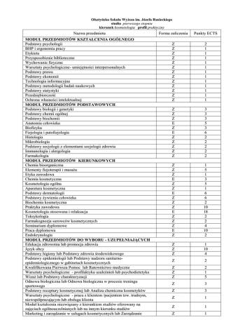 Olsztyńska Szkoła Wyższa im. Józefa Rusieckiego studia pierwszego stopnia kierunek kosmetologia profil praktyczny Nazwa przedmiotu MODUŁ PRZEDMIOTÓW KSZTAŁCENIA OGÓLNEGO Podstawy psychologii BHP i ergonomia pracy Etykieta Przysposobienie biblioteczne Wychowanie fizyczne Warsztaty psychologiczne- umiejętności interpersonalnych Podstawy prawa Podstawy ekonomii Technologia informacyjna Podstawy metodologii badań naukowych Podstawy statystyki Przedsiębiorczość Ochrona własności intelektualnej MODUŁ PRZEDMIOTÓW PODSTAWOWYCH Podstawy biologii i genetyki Podstawy chemii ogólnej Podstawy biochemii Anatomia człowieka Biofizyka Fizjologia i patofizjologia Histologia Mikrobiologia Podstawy socjologii z elementami socjologii zdrowia Immunologia i alergologia Farmakologia MODUŁ PRZEDMIOTÓW KIERUNKOWYCH Chemia bioorganiczna Elementy fizjoterapii i masażu Etyka zawodowa Chemia kosmetyczna Kosmetologia ogólna Aparatura kosmetyczna Podstawy dermatologii Podstawy żywienia człowieka Biochemia kosmetyczna Praktyka zawodowa Kosmetologia stosowana i relaksacja Toksykologia Farmakognozja surowców kosmetycznych Seminarium dyplomowe Praca dyplomowa Endokrynologia MODUŁ PRZEDMIOTÓW DO WYBORU - UZUPEŁNIAJĄCYCH Edukacja zdrowotna lub promocja zdrowia Język obcy Podstawy higieny lub Podstawy zdrowia środowiskowego Podstawy epidemiologii lub Podstawy nadzoru sanitarnoepidemiologicznego w gabinetach kosmetycznych Kwalifikowana Pierwsza Pomoc lub Ratownictwo medyczne Warsztaty psychologiczne - profilaktyka uzależnień lub psychodietetyka Wizaż lub Podstawy charakteryzacji Odnowa biologiczna lub Odnowa biologiczna w procesie treningu sportowego Podstawy receptury kosmetycznej lub Analiza chemiczna kosmetyków Warsztaty psychologiczne - praca z klientem /pacjentem tzw. trudnym, niewspółpracującym lub obsługa klienta Moduł kształcenia niezwiązany z kierunkiem studiów oferowany na zajęciach ogólnouczelnianych lub na innym kierunku studiów Marketing i zarządzanie w usługach kosmetycznych lub Zarządzanie Forma zaliczenia Punkty ECTS Z Z Z Z Z Z Z Z Z Z Z Z Z 2 1 1 1 1 1 1 1 1 1 1 1 1 Z Z Z E Z E Z Z Z Z Z 3 3 3 5 3 6 2 2 2 2 2 Z Z Z E Z Z E Z Z Z E Z Z Z E Z 1 5 1 3 5 1 6 6 2 10 18 2 2 4 10 2 Z Z Z 1 10 4 Z 2 Z Z Z 2 1 5 Z 3 Z 3 Z 1 Z 1 Z 1 jakością w usługach kosmetycznych MODUŁ PRZEDMIOTÓW DO WYBORU - SPECJANOŚCIOWYCH Nutrikosmetyka Profilaktyka żywieniowa Dietetyka Nutrikosmetyka Kosmetologia anti-aging Praktyki zawodowe Propedeutyka medycyny estetycznej Obrót kosmetykami i metody oceny kosmetyków Wellness & Spa Niekonwencjonalne terapie wellness Zabiegi w ośrodkach Spa Struktura funkcjonalno-usługowa wellness & spa Zarządzanie ośrodkami wellness &spa Balneologia Praktyki zawodowe Aromaterapia Fitness-wellness Z Z Z Z Z Z Z 1 3 2 3 10 1 1 Z Z Z Z Z Z Z Z 3 1 1 1 1 10 1 3