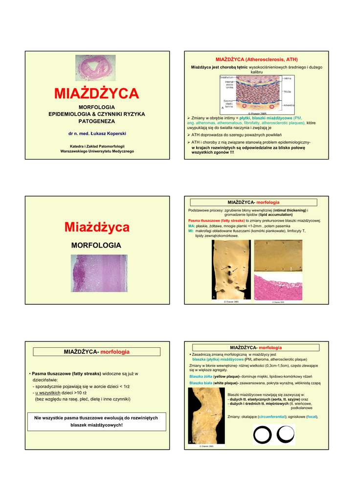 MIAśDśYCA (Atherosclerosis, ATH) MiaŜdŜyca jest chorobą tętnic wysokociśnieniowych średniego i duŜego kalibru MIAśDśYCA MORFOLOGIA EPIDEMIOLOGIA & CZYNNIKI RYZYKA PATOGENEZA dr n. med. Łukasz Koperski Katedra i Zakład Patomorfologii Warszawskiego Uniwersytetu Medycznego Zmiany w obrębie intimy = płytki, blaszki miaŜdŜycowe (PM, ang. atheromas, atheromatous, fibrofatty, atherosclerotic plaques), które uwypuklają się do światła naczynia i zwęŜają je ATH doprowadza do szeregu powaŜnych powikłań ATH i choroby z nią związane stanowią problem epidemiologicznyw krajach rozwiniętych są odpowiedzialne za blisko połowę wszystkich zgonów !!! MIAśDśYCA- morfologia Podstawowe procesy: zgrubienie błony wewnętrznej (intimal thickening) i gromadzenie lipidów (lipid accumulation) MiaŜdŜyca Pasma tłuszczowe (fatty streaks) to zmiany prekursorowe blaszki miaŜdŜycowej. MA: płaskie, Ŝółtawe, mnogie plamki <1-2mm , potem pasemka MI: makrofagi obładowane tłuszczami (komórki piankowate), limfocyty T, lipidy zewnątrzkomórkowe. MORFOLOGIA MIAśDśYCA- morfologia MIAśDśYCA- morfologia Zasadniczą zmianą morfologiczną w miaŜdŜycy jest blaszka (płytka) miaŜdŜycowa (PM, atheroma, atherosclerotic plaque) Zmiany w błonie wewnętrznej- róŜnej wielkości (0,3cm-1,5cm), często zlewające się w większe agregaty. • Pasma tłuszczowe (fatty streaks) widoczne są juŜ w dzieciństwie: - sporadycznie pojawiają się w aorcie dzieci < 1rŜ - u wszystkich dzieci >10 rŜ (bez względu na rasę, płeć, dietę i inne czynniki) Nie wszystkie pasma tłuszczowe ewoluują do rozwiniętych blaszek miaŜdŜycowych! Blaszka Ŝółta (yellow plaque)- dominuje miękki, lipidowo-komórkowy rdzeń Blaszka biała (white plaque)- zaawansowana, pokryta wyraźną, włóknistą czapą Blaszki miaŜdŜycowe rozwijają się zazwyczaj w: - duŜych tt. elastycznych (aorta, tt. szyjne) oraz - duŜych i średnich tt. mięśniowych (tt. wieńcowe, podkolanowe Zmiany: okalające (circumferential); ogniskowe (focal), MIAśDśYCA- dystrybucja zmian miaŜdŜycowych Typowo zmiany miaŜdŜycowe najbardziej nasilone są w aorcie brzusznej (bardziej niŜ w aorcie piersiowej). Największe zmiany widoczne są w okolicy ujść naczyń Po aorcie brzusznej -1, zmiany miaŜdŜycowe dotyczą (malejąco): 4 tt. wieńcowych - 2, 5 2 tt. podkolanowych - 3, tt. szyjnych - 4, 1 tt. koła tętniczego Willisa - 5. Tt. nerkowe i krezkowe- zazwyczaj ujścia Nasilenie zmian w jednej tętnicy nie determinuje nasilenia w innej lokalizacji. 3 W obrębie jednego naczynia mogą współwystępować zmiany o róŜnym nasileniu. MIAśDśYCA- morfologia Blaszki miaŜdŜycowe zbudowane są z 3 podstawowych komponentów: 1. komórkowy, SMCs, makrofagi i inne leukocyty; 2. macierz zewnątrzkomórkowa (ECM),kolagen, włókna spręŜyste, proteoglikany 3. lipidy, zewnątrz- i wewnątrzkomórkowe Składowe występują (w zaleŜności od zaawansowania zmian) w róŜnych proporcjach i konfiguracji MIAśDśYCA- morfologia PM ulegają zmianom i powiększają się poprzez: zmiany martwicze i zwyrodnieniowe, syntezę i degenerację (remodeling) matrix zewnątrzkomórkowego (ECM) Organizację zakrzepów. PM często ulegają WAPNIENIU (calcification) - Powierzchowna, włóknista pokrywa (superficial fibrous cap) SMCs, ECM. PoniŜej warstwa zawierająca makrofagi, SMCs, limfocyty T. - Miękki, martwiczy rdzeń (necrotic core), zawierający masy lipidowe (kryształy cholesterol i estry cholesterolu, masy martwicze, komórki piankowate, włóknik, skrzepliny. KK. Piankowate (foam cells) to duŜe komórki- makrofagi obładowane lipidami. BrzeŜnie widoczne cechy neowaskulogenezy (proliferujące kapilary). MIAśDśYCA- morfologia MIAśDśYCA- morfologia Zaawansowane PM ulegają licznym, klinicznie waŜnym zmianom: • Pęknięcie, owrzodzenie, nadŜerka powierzchni blaszki miaŜdŜycowej inicjuje proces ZAKRZEPICY (thrombosis). Tworzenie zakrzepów moŜe doprowadzić do częściowego lub całkowitego zamknięcie światła naczynia i doprowadzić do niedokrwienia. Zakrzep moŜe ulegać organizacji i wbudowania w powiększającą się PM • Krwawienie do PM. Pęknięcie pokrywy włóknistej lub pęknięcie naczynia w obszarze neowaskularyzacji moŜe doprowadzić do krwawienia do PM. Krwawienie w obrębie blaszki powoduje jej powiększenie czasami nagłe i moŜe być przyczyną jej pęknięcie. • Zatorowość. Masy kaszowate i wypełniające PM zakrzepy mogą odrywać się i prowadzić do mikrozatorowości from: http://www.aorte.ru/heart-attack.php MIAśDśYCA- morfologia MIAśDśYCA • Tworzenie tętniaka (aneurysm) Zmiany w medii pod PM mogą osłabić ścianę naczynia i prowadzić do powstania tętniaka w duŜych naczyniach elastycznych. Tętniak stwarza ryzyko pęknięcia ściany naczynia EPIDEMIOLOGIA & CZYNNIKI RYZYKA MIAśDśYCA- epidemiologia MIAśDśYCA (Atherosclerosis, ATH) • ATH jest odpowiedzialna za blisko połowę zgonów w krajach rozwiniętych • PoniewaŜ choroba niedokrwienna serca (IHD) jest najwaŜniejszą chorobą związaną z ATH wskaźniki epidemiologiczne odnoszone są do IHD • ATH jest chorobą powszechną w Ameryce Północnej, Europie , Australii, Nowej Zelandii i zdecydowanie rzadszą w centralnej i południowej Afryce i krajach Azji • Np. wskaźniki epidemiologiczne są 5-6 krotnie niŜsze u Japończyków niŜ Amerykanów, ale po emigracji podatność wyrównuje się (wyraźny wpływ czynników środowiskowych) MIAśDśYCA- CZYNNIKI RYZYKA MIAśDśYCA- epidemiologia Liczne badania: Framingham (Massachusetts) Heart Study, Multiple Risk Factor Intervention Trial, Atherosclerosis Risk in Communities Study Pomimo wciąŜ ogromnego problemu jaki stanowi ATH i choroby z nią związane w wielu krajach zachodnich w ciągu ostatnich dziesięcioleci nastąpiła znacząca poprawa wskaźników epidemiologicznych Np. od 1963 do dziś w USA wskaźniki śmiertelności z powodu IHD spadły o 50% Czynniki wpływa