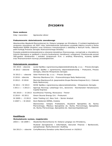 ŻYCIORYS Dane osobowe Imię i nazwisko: Agnieszka Libner Podsumowanie doświadczenia zawodowego Absolwentka Akademii Ekonomicznej im. Oskara Langego we Wrocławiu. Z rynkiem kapitałowym związana zawodowo od 2007 roku, doświadczenie zawodowe uzyskała międ zy innymi w Domu Maklerskim IDMSA (Kraków) oraz funduszu inwestycyjnym z siedzibą w Nowym Yorku. Obecnie pełni funkcję Prezesa Zarządu Autoryzowanego Doradcy. Posiada wieloletnie doświadczenie w obszarze doradztwa finansowego, zarząd zała w charakterze Interim Managera w spółkach z branży budowlanej, handlowej i us ługowej. Zrealizowała ponad 300 godzin seminariów i szkoleń związanych m.in. z analiz ą finansową, wyceną spółek oraz finansowaniem rozwoju przedsiębiorstw. Doświadczenie zawodowe XII 2015 – obecnie Levier Spółka z ograniczoną odpowiedzialnością Sp. z o.o. – Prezes Zarządu IX 2013 – obecnie Bafago Spółka z ograniczoną odpowiedzialnością – Prokurent, Prezes Zarządu, obecnie Wiceprezes Zarządu IV 2012 r. – obecnie Valor Partners Sp. z o.o. – Prezes Zarządu II 2016 – obecnie Mennica Skarbowa S.A. - Przewodnicząca Rady Nadzorczej II 2012 – II 2016 Mennica Skarbowa S.A. (poprzednio Grupa Mennice Krajowe S.A.)– Członek Rady Nadzorczej IX 2011 – IV 2013 WOW Spółka z ograniczoną odpowiedzialnością – Wiceprezes Zarządu I 2011 r. – I 2012 r. Agencja Rozwoju Lokalnego S.A., Jaworzno - Koordynator merytoryczny Capital Express VII 2010 r. – II 2013 Eurofinance Training, Warszawa - Trener II 2010 – XI 2011 Green Source Energy S.A. - Prokurent IX 2009 r. – II 2013 Valor Trading LLC, New York – Senior Analyst X 2007 r. – XI 2010 Dom Maklerski IDMSA, Kraków Stanowiska: kolejno Praktykant, Asystent Specjalisty ds. Rynku Pierwotnego, Młodszy Specjalista ds. Rynku Pierwotnego, Specjalista ds. Rynku Pierwotnego, Specjalista ds. Operacji Kapitałowych Kwalifikacje Wykształcenie wyższe, magisterskie 2003 r.– III 2009 r. Akademia Ekonomiczna im. Oskara Langego we Wrocławiu, Wydział Zarządzania i Informatyki, kierunek Finanse i Bankowość, specjalizacja: Rachunkowość i Auditing Od 2012 r. - obecnie Certyfikowany Doradca rynku NewConnect nr 19/2012 Języki Obce Język angielski biegle w mowie i w piśmie Język niemiecki komunikatywny w mowie i w piśmie Język japoński znajomość podstawowa Umiejętności Rynek finansowy restrukturyzacja przedsiębiorstw, analiza finansowa, wycena spółek, opracowanie strategii pozyskania finansowania i strategii rozwoju spółki, znajomość przepisów prawnych zw iązanych z rynkiem kapitałowym. Komputer MS Office w stopniu zaawansowanym Prawo jazdy kat. B OŚWIADCZENIE Pani Agnieszka Libner oświadczyła, iż: - nie została skazana prawomocnym wyrokiem za przestępstwo oszustwa oraz nie otrzymała sądowego zakazu działania jako członek organów zarządzających lub nadzorczych w spółkach prawa handlowego; - nie prowadzi działalności konkurencyjnej do działalności Mennicy Skarbowej S.A. oraz nie jest wspólnikiem konkurencyjnej spółki cywilnej lub osobowej albo członkiem organu spółki kapitałowej lub członkiem organu jakiejkolwiek konkurencyjnej osoby prawnej, poza udziałem w spółce Bafago Spółka z ograniczoną odpowiedzialnością, w której jest udziałowcem oraz Wiceprezesem Zarządu, a która to Spółka jest właścicielem większościowego pakietu akcji Mennicy Skarbowej S.A. Spółka Bafago prowadzi działalność tożsamą w zakresie PKD co Mennica Skarbowa S.A. - nie zaistniały przypadki ogłoszenia upadłości lub wprowad zenia zarządu komisarycznego, w okresie co najmniej pięciu lat, w odniesieniu do podmiotów, w których pełniła funkcję członka zarządu organu zarządzającego lub nadzorczego, - nie figuruje w Rejestrze Dłużników Niewypłacalnych prowadzonym na podstawie ustawy z dnia 20 sierpnia 1997 r. o Krajowym Rejestrze Sądowym. Warszawa, 4 luty 2016 r. 2