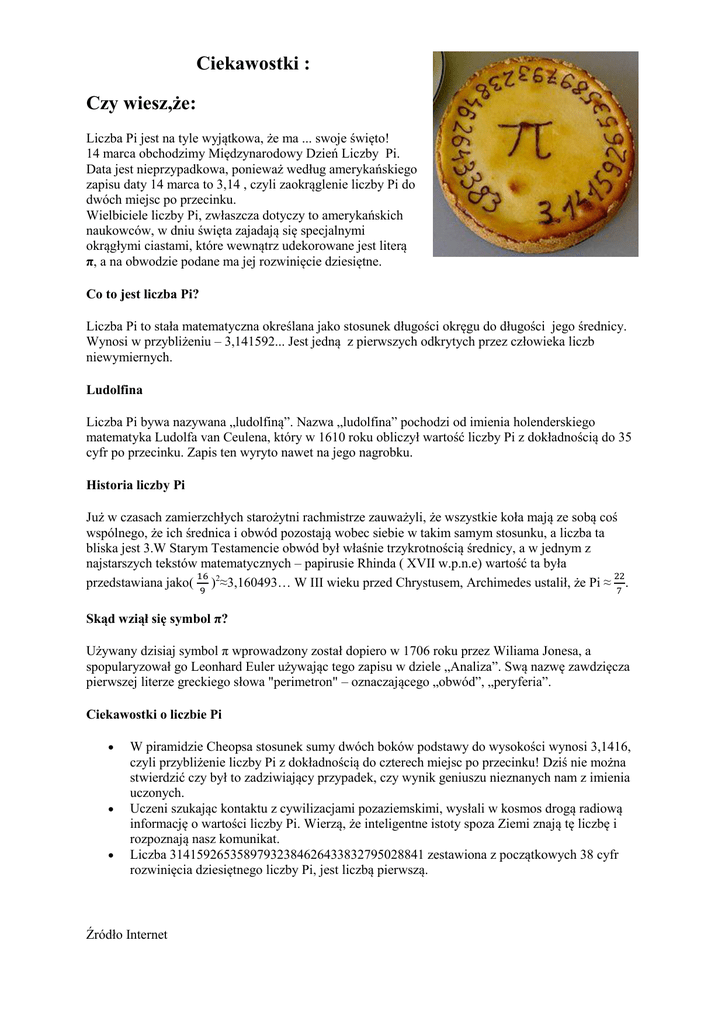 Ciekawostki : Czy wiesz,że: Liczba Pi jest na tyle wyjątkowa, że ma ... swoje święto! 14 marca obchodzimy Międzynarodowy Dzień Liczby Pi. Data jest nieprzypadkowa, ponieważ według amerykańskiego zapisu daty 14 marca to 3,14 , czyli zaokrąglenie liczby Pi do dwóch miejsc po przecinku. Wielbiciele liczby Pi, zwłaszcza dotyczy to amerykańskich naukowców, w dniu święta zajadają się specjalnymi okrągłymi ciastami, które wewnątrz udekorowane jest literą π, a na obwodzie podane ma jej rozwinięcie dziesiętne. Co to jest liczba Pi? Liczba Pi to stała matematyczna określana jako stosunek długości okręgu do długości jego średnicy. Wynosi w przybliżeniu – 3,141592... Jest jedną z pierwszych odkrytych przez człowieka liczb niewymiernych. Ludolfina Liczba Pi bywa nazywana „ludolfiną”. Nazwa „ludolfina” pochodzi od imienia holenderskiego matematyka Ludolfa van Ceulena, który w 1610 roku obliczył wartość liczby Pi z dokładnością do 35 cyfr po przecinku. Zapis ten wyryto nawet na jego nagrobku. Historia liczby Pi Już w czasach zamierzchłych starożytni rachmistrze zauważyli, że wszystkie koła mają ze sobą coś wspólnego, że ich średnica i obwód pozostają wobec siebie w takim samym stosunku, a liczba ta bliska jest 3.W Starym Testamencie obwód był właśnie trzykrotnością średnicy, a w jednym z najstarszych tekstów matematycznych – papirusie Rhinda ( XVII w.p.n.e) wartość ta była przedstawiana jako( )2≈3,160493… W III wieku przed Chrystusem, Archimedes ustalił, że Pi ≈ . Skąd wziął się symbol π? Używany dzisiaj symbol π wprowadzony został dopiero w 1706 roku przez Wiliama Jonesa, a spopularyzował go Leonhard Euler używając tego zapisu w dziele „Analiza”. Swą nazwę zawdzięcza pierwszej literze greckiego słowa "perimetron" – oznaczającego „obwód”, „peryferia”. Ciekawostki o liczbie Pi W piramidzie Cheopsa stosunek sumy dwóch boków podstawy do wysokości wynosi 3,1416, czyli przybliżenie liczby Pi z dokładnością do czterech miejsc po przecinku! Dziś nie można stwierdzić czy był to zadziwiający przypadek, czy wynik geniuszu nieznanych nam z imienia uczonych. Uczeni szukając kontaktu z cywilizacjami pozaziemskimi, wysłali w kosmos drogą radiową informację o wartości liczby Pi. Wierzą, że inteligentne istoty spoza Ziemi znają tę liczbę i rozpoznają nasz komunikat. Liczba 31415926535897932384626433832795028841 zestawiona z początkowych 38 cyfr rozwinięcia dziesiętnego liczby Pi, jest liczbą pierwszą. Źródło Internet