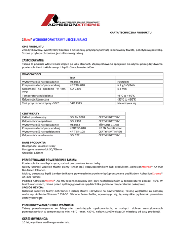 KARTA TECHNICZNA PRODUKTU: 2Sided® WODOODPORNE TAŚMY USZCZELNIAJĄCE OPIS PRODUKTU: Zmodyfikowany, syntetyczny kauczuk z doskonałą, przylepną formułą laminowany trwałą, polietylową powłoką. Strona przylepu chroniona jest silikonową taśmą. ZASTOSOWANIE: Taśma ta posiada właściwości klejące po obu stronach. Zaprojektowana specjalnie do użytku pomiędzy dwoma powierzchniami takich samych bądź różnych materiałów. WŁAŚCIWOŚCI Wytrzymałośd na rozciąganie Przepuszczalnośd pary wodnej Odpornośd na opadanie w tem. 70°C Temperatura nakładania Odpornośd termiczna Test przyczepności przy -30°C CERTYFIKATY Zakład produkcyjny Odpornośd na opadanie Wytrzymałośd na rozciąganie Przepuszczalnośd pary wodnej Wytrzymałośd na rozdzieranie Odpornośd na uderzenia Test MEL052 NF T30- 018 ISO 7390 >10N/cm ≈ 2 g/m²/24 h ≤ 3 mm D42 1313 +5°C to +40°C -30°C to +80°C Nie odrywa się ISO EN 9001 ISO 7390 MEL052 NFRT 30-018 NF T 54-108 ISO 527 CERTYFIKAT TÜV CERTYFIKAT TÜV TÜV DIN51 1485 NF EN Certification CERTYFIKAT NF EN CERTYFIKAT TÜV DANE PRODUKTU: Dostępnośd kolorów: szary Dostępne szerokości: 50/75mm Grubośd: 1.5mm PRZYGOTOWANIE POWIERZCHNI I TAŚMY: Powierzchnia musi byd czysta, sucha i pozbawiona kurzu i rdzy. Należy usunąd wszelkie tłuste plamy (smar itp.) rozpuszczalnikiem lub produktem AdhesionXtreme® AX-900 Bio-Based Cleaner. Mokre, porowate bądź bardzo delikatne powierzchnie powinny byd gruntowane podkładem AdhesionXtreme® AX-400 Primer. Podkład AdhesionXtreme® AX-400 rekomendowany jest przy nakładaniu taśm w temperaturze poniżej +5°C. W takich warunkach, taśma przed aplikacją powinna spędzid kilka godzin w temperaturze pokojowej. SPOSÓB UŻYCIA: Oderwad warstwę taśmy ochronnej z jednej strony i przykleid na powierzchnię. Taśmę wygładzad za pomocą wałka np. AdhesionXtreme ® SSR-50 Silicone Seam Roller, upewniając się, żę wszystkie pęcherzyki powietrza zostały usunięte. PRZECHOWYWANIE/ OKRES WAŻNOŚCI: Taśmy przechowywane w fabrycznie zamkniętych opakowaniach, w suchych dobrze wentylowanych pomieszczeniach w temperaturze min. +3°C - max. +30°C, należy zużyd w ciągu 24 miesięcy od daty produkcji. OKRES GWARANCJI: 10 lat, wymiana wadliwego materiału. UWAGI : Wszystkie wskazówki w w/w dokumencie są podane na podstawie naszych doświadczeo i praktyki z produktem. W kwestii użytkownika leży przeprowadzenie próby materiału oraz zalecanie się do obowiązujących przepisów dotyczących używania w/w produktu. AdhesionXtreme® 19 rue de la Chancellerie, 60300 Senlis, France Telephone - (33) 344 62 1702 Fax (33) 344 32 1977 26/09/11 Company Registration N° 498 233 196
