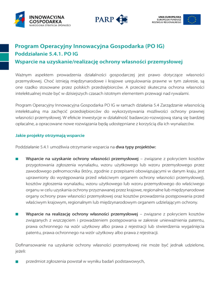 Program Operacyjny Innowacyjna Gospodarka (PO IG) Poddziałanie 5.4.1. PO IG Wsparcie na uzyskanie/realizację ochrony własności przemysłowej Ważnym aspektem prowadzenia działalności gospodarczej jest prawo dotyczące własności przemysłowej. Choć istnieją międzynarodowe i krajowe uregulowania prawne w tym zakresie, są one rzadko stosowane przez polskich przedsiębiorców. A przecież skuteczna ochrona własności intelektualnej może być w dzisiejszych czasach istotnym elementem przewagi nad rywalami. Program Operacyjny Innowacyjna Gospodarka PO IG w ramach działania 5.4 Zarządzanie własnością intelektualną ma zachęcić przedsiębiorców do wykorzystywania możliwości ochrony prawnej własności przemysłowej. W efekcie inwestycje w działalność badawczo-rozwojową staną się bardziej opłacalne, a opracowane nowe rozwiązania będą udostępniane z korzyścią dla ich wynalazców. Jakie projekty otrzymają wsparcie Poddziałanie 5.4.1 umożliwia otrzymanie wsparcia na dwa typy projektów: Wsparcie na uzyskanie ochrony własności przemysłowej – związane z pokryciem kosztów przygotowania zgłoszenia wynalazku, wzoru użytkowego lub wzoru przemysłowego przez zawodowego pełnomocnika (który, zgodnie z przepisami obowiązującymi w danym kraju, jest uprawniony do występowania przed właściwym organem ochrony własności przemysłowej), kosztów zgłoszenia wynalazku, wzoru użytkowego lub wzoru przemysłowego do właściwego organu w celu uzyskania ochrony przyznawanej przez krajowe, regionalne lub międzynarodowe organy ochrony praw własności przemysłowej oraz kosztów prowadzenia postępowania przed właściwym krajowym, regionalnym lub międzynarodowym organem udzielającym ochrony. Wsparcie na realizację ochrony własności przemysłowej – związane z pokryciem kosztów związanych z wszczęciem i prowadzeniem postępowania w zakresie unieważnienia patentu, prawa ochronnego na wzór użytkowy albo prawa z rejestracji lub stwierdzenia wygaśnięcia patentu, prawa ochronnego na wzór użytkowy albo prawa z rejestracji. Dofinansowanie na uzyskanie ochrony własności przemysłowej nie może być jednak udzielone, jeżeli: przedmiot zgłoszenia powstał w wyniku badań podstawowych, zgłoszenie dotyczy znaków towarowych, zgłoszenie do Urzędu Patentowego RP dotyczy uzyskania ochrony wyłącznie na terytorium RP. Z kolei dofinansowanie na realizację ochrony własności przemysłowej nie może być udzielone, jeżeli: przedmiot postępowania powstał w wyniku badań podstawowych, przedmiot postępowania dotyczy znaków towarowych. Kto może skorzystać z dofinansowania O dofinansowanie na projekty w ramach podziałania 5.4.1 mogą ubiegać się mikro, mali i średni przedsiębiorcy mający siedzibę, a w przypadku przedsiębiorcy będącego osobą fizyczną – miejsce zamieszkania na terytorium Rzeczypospolitej Polskiej. Firmy te muszą też spełniać warunki określone w Rozporządzeniu Ministra Rozwoju Regionalnego z dnia 7 kwietnia 2008 r. w sprawie udzielania przez PARP pomocy finansowej w ramach PO IG (Dz.U. z 2008 roku, Nr 68, poz. 414 z późn. zm.). Poziom dofinansowania Dofinansowanie na uzyskanie i realizację ochrony własności przemysłowej może wynosić od 2 tys. zł do 400 tys. zł. Więcej informacji na temat poddziałania 5.4.1 PO IG można znaleźć na stronie internetowej: http://poig.parp.gov.pl Polska Agencja Rozwoju Przedsiębiorczości ul. Pańska 81/83, 00-834 Warszawa tel.: + 48 22 432 80 80, faks: + 48 22 432 86 20 [email protected], www.parp.gov.pl Punkt informacyjny PARP tel.: + 48 22 432 89 91-93, 0 801 332 202 [email protected]