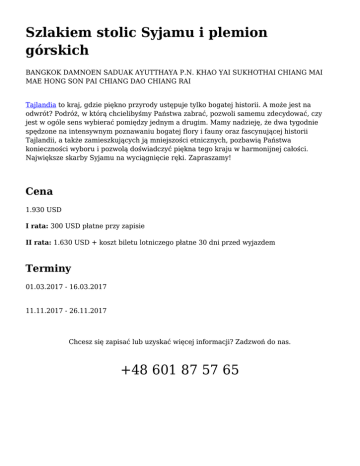 Szlakiem stolic Syjamu i plemion górskich BANGKOK DAMNOEN SADUAK AYUTTHAYA P.N. KHAO YAI SUKHOTHAI CHIANG MAI MAE HONG SON PAI CHIANG DAO CHIANG RAI Tajlandia to kraj, gdzie piękno przyrody ustępuje tylko bogatej historii. A może jest na odwrót? Podróż, w którą chcielibyśmy Państwa zabrać, pozwoli samemu zdecydować, czy jest w ogóle sens wybierać pomiędzy jednym a drugim. Mamy nadzieję, że dwa tygodnie spędzone na intensywnym poznawaniu bogatej flory i fauny oraz fascynującej historii Tajlandii, a także zamieszkujących ją mniejszości etnicznych, pozbawią Państwa konieczności wyboru i pozwolą doświadczyć piękna tego kraju w harmonijnej całości. Największe skarby Syjamu na wyciągnięcie ręki. Zapraszamy! Cena 1.930 USD I rata: 300 USD płatne przy zapisie II rata: 1.630 USD + koszt biletu lotniczego płatne 30 dni przed wyjazdem Terminy 01.03.2017 - 16.03.2017 11.11.2017 - 26.11.2017 Chcesz się zapisać lub uzyskać więcej informacji? Zadzwoń do nas. +48 601 87 57 65 Cena obejmuje zakwaterowanie w hotelach 3 lub 4* (w pokojach dwuosobowych z łazienkami), wyżywienie w formie śniadań, lunche w dniu 6 i 13, wszystkie transfery (prywatny minivan), przejazd pociągiem z Lampang do Chiang Mai, opiekę tajskich przewodników, opiekę polskiego lokalnego pilota, bilety wstępu wg programu wycieczki, ubezpieczenia KL, NNW, KR i bagażu. Cena nie obejmuje biletów lotniczych na trasie Warszawa-Bangkok; Chiang Rai-Bangkok-Warszawa; od 2500 PLN, zwyczajowych napiwków: ok. 80 USD, dopłaty do pokoju jednoosobowego: 450 USD Plan wyjazdu Dzień 1 Wylot z Warszawy, przelot do Bangkoku. Dzień 2 Przylot do Bangkoku, transfer do hotelu. Po południu zwiedzanie China Town; kolacja w China Town, czyli doskonała szansa na to, by spróbować najlepszych owoców morza w całym Bangkoku. Nocleg w Bangkoku. Dzień 3 Dalsze zwiedzanie Bangkoku. Rejs kanałami Thonburi pozwoli zapoznać się z codziennym życiem mieszkańców ubogich dzielnic Bangkoku, z pokładu łodzi będzie można obserwować pływające sklepy i domy na palach. Wizyta w najważniejszych świątyniach i zarazem największych zabytkach Bangkoku: skrywającej pod swoim dachem 46 metrowego „kolosa” Świątyni Leżącego Buddy oraz znajdującej się w słynnym Pałacu Królewskim Świątyni Szmaragdowego Buddy. Późnym popołudniem czas wolny, który można przeznaczyć na masaż bądź zakupy. Nocleg w Bangkoku. Dzień 4 Przejazd na południowy zachód od Bangkoku. Zwiedzanie słynnych w całej Azji południowowschodniej targów: targu wodnego i targu „na torach”. W obu miejscach nie zabraknie okazji do spróbowania egzotycznych owoców i miejscowych przysmaków. Następnie przejazd do Nakhon Pathom - najstarszego miasta w Tajlandii, gdzie można podziwiać najwyższą chedi w Tajlandii oraz zwiedzić Pałac Królewski Ramy VI. Przejazd w stronę Ayutthaya. Nocleg w Ayutthaya. Dzień 5 Poznawanie historii starej stolicy Królestwa Tajlandii - miasta Ayutthaya wpisanego na listę światowego dziedzictwa UNESCO. Zwiedzanie parku historycznego, w którym można poznać dzieje Syjamu aż do połowy XVIII wieku, kiedy stolica została przeniesiona w okolice dzisiejszego Bangkoku. Oglądanie Wat Mahatat, Wat Yai Chai, Wat Na Phra Men, tradycyjnego domu tajskiego... Przerwa na lunch, po którym będzie można odkryć roślinę pakwan, bardzo istotną w kuchni tajskiej i zapoznać się z potrawami przygotowanymi na jej bazie. Przejazd do Parku Narodowego Khao Yai. Nocleg w okolicy Parku. Dzień 6 Trekking „w poszukiwaniu dzikich słoni”, w najstarszym i zdecydowanie jednym z najpiękniejszych parków narodowych Tajlandii - Khao Yai. W czasie wyprawy nie zabraknie okazji, by podziwiać dziką florę i faunę, wspaniałe wodospady oraz bajeczne, pocztówkowe krajobrazy. Nocleg w okolicy Khao Yai. Dzień 7 Przejazd w kierunku północnym i dalsza część podróży poprzez dzieje Syjamu. Odwiedziny w Phitsanulok, gdzie w świątyni Wat Nang Phaya znajduje się wizerunek buddy uważany za najpiękniejszy w całej Tajlandii. W czasie lunchu na pewno nadarzy się sposobność, by spróbować tradycyjnej tajskiej zupy z makaronem. Przejazd do Sukhothai. Nocleg w Sukhothai. Dzień 8 Zwiedzanie parku historycznego w Sukhothai, podobnie jak Ayutthaya wpisanego na listę światowego dziedzictwa UNESCO. Sukhothai było pierwsza tajską stolicą. Aby mieć pełna swobodę w eksplorowaniu obszernego terenu tego wspaniałego miasta zwiedzanie będzie miało formę wycieczki rowerowej. Po południu transfer na stację kolejową w Lampang. Przejazd pociągiem przez piękne, górskie tereny północnej Tajlandii z Lampang do Chiang Mai. Wizyta na nocnym targu. Nocleg w Chiang Mai. Dzień 9 Zwiedzanie Chiang Mai, w planie: stare miasto, wybudowane w XII-XIII wieku świątynie Wat Chedi Luang oraz Wat Chiang Man, Pomnik Trzech Króli oraz położona na szczycie góry świątynia Doi Suthep, skąd można podziwiać panoramę miasta. W czasie obiadu „spotkanie” z tradycyjną zupą z regionu Chiang Mai, czyli Khao Soi. Wieczorem czas na zakupy, masaże i samodzielne zwiedzanie miasta. Nocleg w Chiang Mai. Dzień 10 Po śniadaniu przejazd do Parku Narodowego Doi Ithanon i wejście na szczyt o tej samej nazwie, najwyższy w Tajlandii. Podziwianie panoramy z punktu widokowego, później trekking szlakiem pośród dzikiej przyrody. Odwiedziny w wioskach plemion Shan i Meo oraz w górskiej wiosce Moo Ban Rak Thai. Przejazd do położonej w głębi górskiej dżungli, z dala od utartych szlaków wioski Mae Hong Son. Nocleg w Mae Hong Son. Dzień 11 Odwiedziny w wiosce plemienia Karen zwanego potocznie „długie szyje”. Nazwa ta wywodzi się od charakterystycznych miedzianych obręczy noszonych przez kobiety należące do tego plemienia. Zwiedzanie pól ryżowych, birmańskiej świątyni Wat Hua Wiang, świątyni Wat Phra That Doi Kong Mu. Przejazd na punkt widokowy Kiew Lom. Transfer do Pai. Nocleg w Pai. Dzień 12 Odwie
