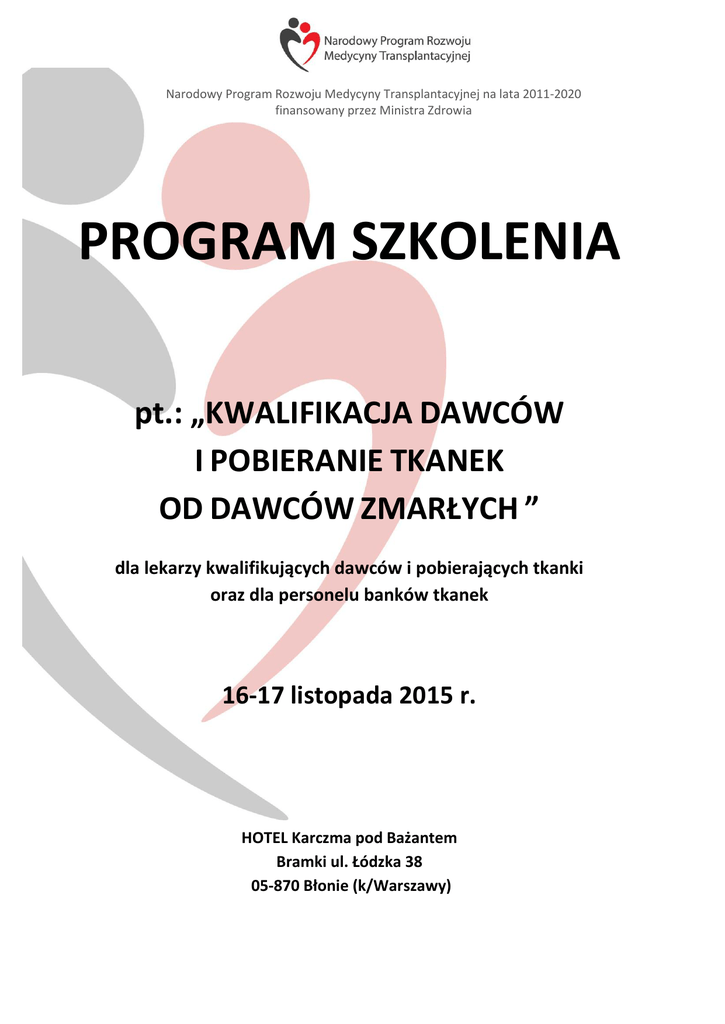 Narodowy Program Rozwoju Medycyny Transplantacyjnej na lata 2011-2020 finansowany przez Ministra Zdrowia PROGRAM SZKOLENIA pt.: „KWALIFIKACJA DAWCÓW I POBIERANIE TKANEK OD DAWCÓW ZMARŁYCH ” dla lekarzy kwalifikujących dawców i pobierających tkanki oraz dla personelu banków tkanek 16-17 listopada 2015 r. HOTEL Karczma pod Bażantem Bramki ul. Łódzka 38 05-870 Błonie (k/Warszawy) Poniedziałek – 17 listopada 2015 r. 900 - 1200 Rejestracja uczestników szkolenia 1200 - 1230 Aspekty prawne i etyczne dawstwa i pobierania tkanek od dawców zmarłych Artur Kamioski 1230 - 1300 Procedury dawstwa tkanek od dawcy zmarłego Artur Kamioski, Grzegorz Gut 1300 - 1330 Zasady koordynacji pobrao narządów od dawców zmarłych i możliwości powiązania z dawstwem tkanek Jarosław Czerwioski 1330 - 1430 Obiad 1430 - 1515 Procedury dawstwa narządów i możliwości powiązania z dawstwem tkanek od dawców ze śmiercią mózgową Jarosław Czerwioski 1515 - 1545 Dyskusja 1600 - 1630 Procedury ogólne kwalifikacji dawców tkanek Artur Kamioski, Grzegorz Gut 1630 – 1645 Przerwa kawowa 1645 - 1730 Procedury szczegółowe kwalifikacji dawców zmarłych: a) tkanki mięśniowo-szkieletowe Henryk Bursig b) tkanki układu sercowo – naczyniowego Mariusz Birbach, Maciej Fedorowicz c) tkanki oka Dorota Polak d) skóra Agnieszka Klama-Baryła 1730 - 1800 Różnice w kwalifikacji dawców tkanek i narządów Wojciech Czapiewski 1830 Dyskusja 1900 Kolacja Wtorek – 17 listopada 2015 r. 700 – 800 Śniadanie 800 - 830 Badania dawców tkanek i narządów Artur Kamioski 830 - 930 Procedury pobierania tkanek od dawców zmarłych a) tkanki mięśniowo-szkieletowe Henryk Bursig b) tkanki układu sercowo – naczyniowego Mariusz Birbach, Maciej Fedorowicz c) tkanki oka Dorota Polak d) skóra Agnieszka Klama-Baryła 930 - 1000 Dokumentacja dawcy i pobrania Artur Kamioski, Grzegorz Gut 1000 - 1030 Procedury transportu do banku pobranych tkanek i komórek Artur Kamioski 1030 - 1045 Przerwa kawowa 1045 - 1130 Procedury pobrania narządów, dokumentacja pobrania, zasady współpracy ze szpitalem dawcy Wojciech Czapiewski 1130 - 1200 Pobrane tkanki jako materiał wyjściowy do wytwarzania ATMP Izabela Uhrynowska-Tyszkiewicz 1200 - 1230 Istotne reakcje i zdarzenia niepożądane związane z pobieraniem tkanek Izabela Uhrynowska-Tyszkiewicz 1230 - 1315 Współpraca koordynatorów szpitalnych i regionalnych z bankami tkanek Artur Kamioski, Jarosław Czerwioski, Wojciech Czapiewski 1315 - 1345 Wypalenie zawodowe - cena za pracoholizm, altruizm czy niedofinansowanie całego systemu? Anna Bortkiewicz, Monika Jaroszyoska 1345 - 1400 Zakooczenie szkolenia/ certyfikaty Artur Kamioski, Izabela Uhrynowska-Tyszkiewicz 1400 - 1500 Obiad