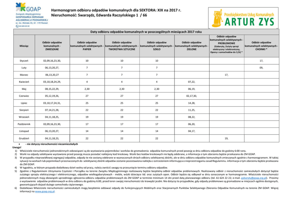 Harmonogram odbioru odpadów komunalnych dla SEKTORA: XIX na 2017 r. Nieruchomość: Swarzędz, Edwarda Raczyńskiego 1 / 66 Daty odbioru odpadów komunalnych w poszczególnych miesiącach 2017 roku Odbiór odpadów Odbiór odpadów Odbiór odpadów Odbiór odpadów komunalnych selektywnych - komunalnych selektywnych - komunalnych selektywnych - komunalnych selektywnych PAPIER TWORZYWA SZTUCZNE SZKŁO ZIELONE Odbiór odpadów komunalnych selektywnych PROBLEMOWE Miesiąc Odbiór odpadów komunalnych ZMIESZANE Odbiór odpadów Styczeń 02,09,16,23,30, 10 10 10 17, Luty 06,13,20,27, 7 7 7 09, Marzec 06,13,20,27 7 7 7 Kwiecień 03,10,18,24,29, 4 4 4 07,22, Maj 08,15,22,29, 2,30 2,30 2,30 06,19, Czerwiec 05,12,19,26, 27 27 27 02,17,30, Lipiec 03,10,17,24,31, 25 25 25 14,28, Sierpień 07,14,21,28, 22 22 22 11,25, Wrzesień 04,11,18,25, 19 19 19 08,22, Październik 02,09,16,23,30, 17 17 17 06,20, Listopad 06,13,20,27, 14 14 14 04,17, Grudzień 04,11,18,23, 22 22 22 komunalnych selektywnych (Gabaryty, Zużyty sprzęt elektryczny i elektroniczny, CHOINKI * Opony z samochodów do 3,5t) * 17, 19, - nie dotyczy nieruchomości niezamieszkałych Uwaga! 1) Właściciele nieruchomości jednorodzinnych zobowiązani są do wystawiania pojemników i worków do gromadzenia odpadów komunalnych przed posesję w dniu odbioru odpadów do godziny 6:00 rano. 2) Worki na odpady selektywne wystawione przed posesję musza posiadać naklejony kod kreskowy. Worki bez kodów kreskowych nie będą odebrane, a informacja o tym zdarzeniu będzie przekazana do ZM GOAP. 3) W przypadku nieprawidłowej segregacji odpadów, odpady te nie zostaną odebrane w wyznaczonych dniach odbioru selektywnej zbiórki, ale w dniu odbioru odpadów komunalnych zmieszanych zgodnie z harmonogramem. W takiej sytuacji na workach lub pojemnikach przeznaczonych do selektywnej zbiórki odpadów zostanie pozostawiona naklejka z ostrzeżeniem informująca o nieprzestrzeganiu zasad Regulaminu. informacja o tym zdarzeniu będzie przekazana do ZM GOAP. 4) W tygodniu, w którym przypada dodatkowy dzień wolny od pracy, należy zwrócić uwagę na przesunięcie terminu odbioru odpadów. 5) Zgodnie z Regulaminem Utrzymania Czystości i Porządku na terenie Związku Międzygminnego realizowany będzie bezpłatny odbiór odpadów problemowych. Realizowany odbiór z nieruchomości zamieszkałych dotyczył będzie zużytego sprzętu elektrycznego i elektronicznego, odpadów wielkogabarytowych - meble, wózki dziecięce itd. oraz zużytych opon. Odbiór będzie się odbywał w dniu oznaczonym w harmonogramie. Właściciele nieruchomości jednorodzinnych mają obowiązek uprzedniego zgłoszenia odbioru odpadów problemowych do ZM GOAP w terminie minimum 14 dni przed datą planowanego odbioru (tel. 61 624 22 22; e-mail. [email protected]). Prosimy o wystawienie odpadów problemowych w dniu odbioru do godziny 6:00, przed teren swojej nieruchomości do krawędzi jezdni. Nie dotyczy to przypadków, gdy odpady problemowe są gromadzone w miejscach ogólnie dostępnych, gwarantujących dojazd dużego samochodu ciężarowego. 6) Dodatkowo Właściciele nieruchomości zamieszkałych mogą bezpłatnie oddawać odpady do funkcjonujących Mobilnych oraz Stacjonarnych Punktów Selektywnego Zbierania Odpadów Komunalnych na terenie ZM GOAP. Więcej informacji na www.goap.org.pl.