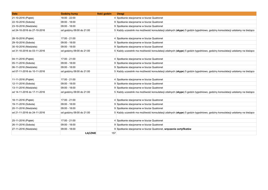 Data Godziny kursy 21-10-2016 (Piątek) 18:00 - 22:00 Ilość godzin 4 Spotkanie stacjonarne w biurze Quatronet Uwagi 22-10-2016 (Sobota) 09:00 - 18:00 9 Spotkanie stacjonarne w biurze Quatronet 23-10-2016 (Niedziela) 09:00 - 18:00 9 Spotkanie stacjonarne w biurze Quatronet od 24-10-2016 do 27-10-2016 od godziny 09:00 do 21:00 5 Każdy uczestnik ma możliwość konsulatacji zdalnych (skype) 5 godzin tygodniowo, godziny konsulatacji ustalamy na bieżąco 28-10-2016 (Piątek) 17:00 - 21:00 4 Spotkanie stacjonarne w biurze Quatronet 29-10-2016 (Sobota) 09:00 - 18:00 9 Spotkanie stacjonarne w biurze Quatronet 30-10-2016 (Niedziela) 09:00 - 18:00 9 Spotkanie stacjonarne w biurze Quatronet od 31-10-2016 do 03-11-2016 od godziny 09:00 do 21:00 5 Każdy uczestnik ma możliwość konsulatacji zdalnych (skype) 5 godzin tygodniowo, godziny konsulatacji ustalamy na bieżąco 04-11-2016 (Piątek) 17:00 - 21:00 4 Spotkanie stacjonarne w biurze Quatronet 05-11-2016 (Sobota) 09:00 - 18:00 9 Spotkanie stacjonarne w biurze Quatronet 06-11-2016 (Niedziela) 09:00 - 18:00 9 Spotkanie stacjonarne w biurze Quatronet od 07-11-2016 do 10-11-2016 od godziny 09:00 do 21:00 5 Każdy uczestnik ma możliwość konsulatacji zdalnych (skype) 5 godzin tygodniowo, godziny konsulatacji ustalamy na bieżąco 11-11-2016 (Piątek) 17:00 - 21:00 4 Spotkanie stacjonarne w biurze Quatronet 12-11-2016 (Sobota) 09:00 - 18:00 9 Spotkanie stacjonarne w biurze Quatronet 13-11-2016 (Niedziela) 09:00 - 18:00 9 Spotkanie stacjonarne w biurze Quatronet od 14-11-2016 do 17-11-2016 od godziny 09:00 do 21:00 5 Każdy uczestnik ma możliwość konsulatacji zdalnych (skype) 5 godzin tygodniowo, godziny konsulatacji ustalamy na bieżąco 18-11-2016 (Piątek) 17:00 - 21:00 4 Spotkanie stacjonarne w biurze Quatronet 19-11-2016 (Sobota) 09:00 - 18:00 9 Spotkanie stacjonarne w biurze Quatronet 20-11-2016 (Niedziela) 09:00 - 18:00 9 Spotkanie stacjonarne w biurze Quatronet od 21-11-2016 do 24-11-2016 od godziny 09:00 do 21:00 5 Każdy uczestnik ma możliwość konsulatacji zdalnych (skype) 5 godzin tygodniowo, godziny konsulatacji ustalamy na bieżąco 25-11-2016 (Piątek) 17:00 - 21:00 4 Spotkanie stacjonarne w biurze Quatronet 26-11-2016 (Sobota) 09:00 - 18:00 9 Spotkanie stacjonarne w biurze Quatronet 27-11-2016 (Niedziela) 09:00 - 18:00 9 Spotkanie stacjonarne w biurze Quatronet, wręczenie certyfikatów ŁĄCZNIE 157