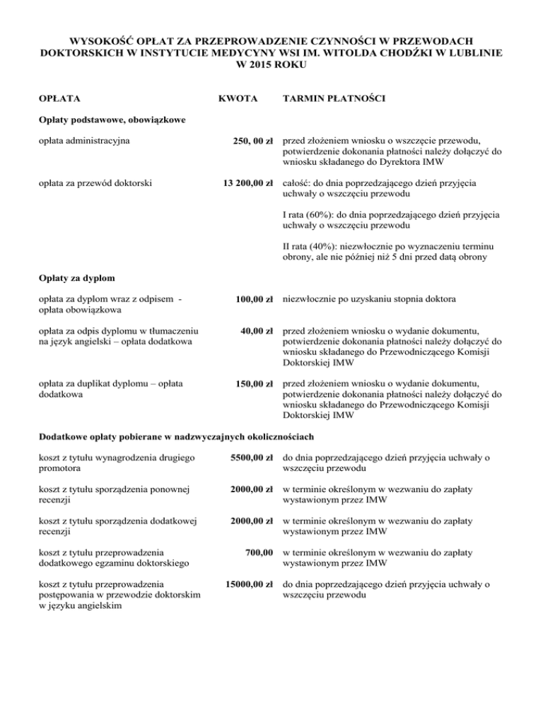 WYSOKOŚĆ OPŁAT ZA PRZEPROWADZENIE CZYNNOŚCI W PRZEWODACH DOKTORSKICH W INSTYTUCIE MEDYCYNY WSI IM. WITOLDA CHODŹKI W LUBLINIE W 2015 ROKU OPŁATA KWOTA TARMIN PŁATNOŚCI Opłaty podstawowe, obowiązkowe opłata administracyjna opłata za przewód doktorski 250, 00 zł przed złożeniem wniosku o wszczęcie przewodu, potwierdzenie dokonania płatności należy dołączyć do wniosku składanego do Dyrektora IMW 13 200,00 zł całość: do dnia poprzedzającego dzień przyjęcia uchwały o wszczęciu przewodu I rata (60%): do dnia poprzedzającego dzień przyjęcia uchwały o wszczęciu przewodu II rata (40%): niezwłocznie po wyznaczeniu terminu obrony, ale nie później niż 5 dni przed datą obrony Opłaty za dyplom opłata za dyplom wraz z odpisem opłata obowiązkowa opłata za odpis dyplomu w tłumaczeniu na język angielski – opłata dodatkowa opłata za duplikat dyplomu – opłata dodatkowa 100,00 zł niezwłocznie po uzyskaniu stopnia doktora 40,00 zł przed złożeniem wniosku o wydanie dokumentu, potwierdzenie dokonania płatności należy dołączyć do wniosku składanego do Przewodniczącego Komisji Doktorskiej IMW 150,00 zł przed złożeniem wniosku o wydanie dokumentu, potwierdzenie dokonania płatności należy dołączyć do wniosku składanego do Przewodniczącego Komisji Doktorskiej IMW Dodatkowe opłaty pobierane w nadzwyczajnych okolicznościach koszt z tytułu wynagrodzenia drugiego promotora 5500,00 zł do dnia poprzedzającego dzień przyjęcia uchwały o wszczęciu przewodu koszt z tytułu sporządzenia ponownej recenzji 2000,00 zł w terminie określonym w wezwaniu do zapłaty wystawionym przez IMW koszt z tytułu sporządzenia dodatkowej recenzji 2000,00 zł w terminie określonym w wezwaniu do zapłaty wystawionym przez IMW koszt z tytułu przeprowadzenia dodatkowego egzaminu doktorskiego koszt z tytułu przeprowadzenia postępowania w przewodzie doktorskim w języku angielskim 700,00 w terminie określonym w wezwaniu do zapłaty wystawionym przez IMW 15000,00 zł do dnia poprzedzającego dzień przyjęcia uchwały o wszczęciu przewodu Opłaty należy wnosić na rachunek bankowy Instytutu Medycyny Wsi im. Witolda Chodźki w Lublinie prowadzony przez Bank PEKAO S.A. Oddział w Lublinie, nr 66 1240 5497 1111 0010 3988 6955, wraz z odpowiednim dopiskiem. Za dzień płatności przyjmuje się datę wpływu środków na rachunek Instytutu.