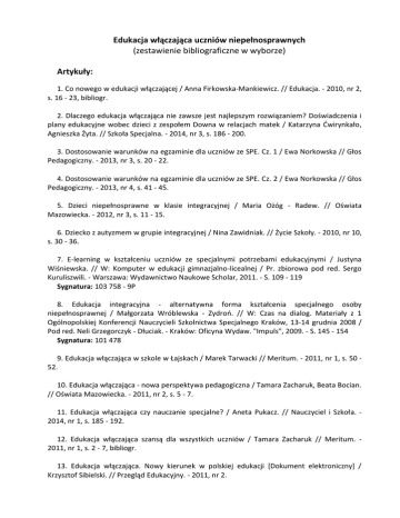 Edukacja włączająca uczniów niepełnosprawnych (zestawienie bibliograficzne w wyborze) Artykuły: 1. Co nowego w edukacji włączającej / Anna Firkowska-Mankiewicz. // Edukacja. - 2010, nr 2, s. 16 - 23, bibliogr. 2. Dlaczego edukacja włączająca nie zawsze jest najlepszym rozwiązaniem? Doświadczenia i plany edukacyjne wobec dzieci z zespołem Downa w relacjach matek / Katarzyna Ćwirynkało, Agnieszka Żyta. // Szkoła Specjalna. - 2014, nr 3, s. 186 - 200. 3. Dostosowanie warunków na egzaminie dla uczniów ze SPE. Cz. 1 / Ewa Norkowska // Głos Pedagogiczny. - 2013, nr 3, s. 20 - 22. 4. Dostosowanie warunków na egzaminie dla uczniów ze SPE. Cz. 2 / Ewa Norkowska // Głos Pedagogiczny. - 2013, nr 4, s. 41 - 45. 5. Dzieci niepełnosprawne w klasie integracyjnej / Maria Ożóg - Radew. // Oświata Mazowiecka. - 2012, nr 3, s. 11 - 15. 6. Dziecko z autyzmem w grupie integracyjnej / Nina Zawidniak. // Życie Szkoły. - 2010, nr 10, s. 30 - 36. 7. E-learning w kształceniu uczniów ze specjalnymi potrzebami edukacyjnymi / Justyna Wiśniewska. // W: Komputer w edukacji gimnazjalno-licealnej / Pr. zbiorowa pod red. Sergo Kuruliszwili. - Warszawa: Wydawnictwo Naukowe Scholar, 2011. - S. 109 - 119 Sygnatura: 103 758 - 9P 8. Edukacja integracyjna - alternatywna forma kształcenia specjalnego osoby niepełnosprawnej / Małgorzata Wróblewska - Zydroń. // W: Czas na dialog. Materiały z 1 Ogólnopolskiej Konferencji Nauczycieli Szkolnictwa Specjalnego Kraków, 13-14 grudnia 2008 / Pod red. Neli Grzegorczyk - Dłuciak. - Kraków: Oficyna Wydaw. "Impuls", 2009. - S. 145 - 154 Sygnatura: 101 478 9. Edukacja włączająca w szkole w Łajskach / Marek Tarwacki // Meritum. - 2011, nr 1, s. 50 52. 10. Edukacja włączająca - nowa perspektywa pedagogiczna / Tamara Zacharuk, Beata Bocian. // Oświata Mazowiecka. - 2011, nr 2, s. 5 - 7. 11. Edukacja włączająca czy nauczanie specjalne? / Aneta Pukacz. // Nauczyciel i Szkoła. 2014, nr 1, s. 185 - 192. 12. Edukacja włączająca szansą dla wszystkich uczniów / Tamara Zacharuk // Meritum. 2011, nr 1, s. 2 - 7, bibliogr. 13. Edukacja włączająca. Nowy kierunek w polskiej edukacji [Dokument elektroniczny] / Krzysztof Sibielski. // Przegląd Edukacyjny. - 2011, nr 2. 14. Klasy integrujące - dobrym rozwiązaniem / Elżbieta Bocheńska, Elżbieta Zborowska // Meritum. - 2011, nr 1, s. 58 - 63. 15. Kształcenie integracyjne - korzyści i bariery / Anna Zamkowska. // Życie Szkoły. - 2010, nr 10, s. 5 - 10. 16. Kształcenie uczniów niepełnosprawnych w szkole ogólnodostępnej / Małgorzata Łoskot // Głos Pedagogiczny. - 2013, nr 12, s. 50 - 53. 17. Metody aktywizujące w nauczaniu zintegrowanym uczniów niepełnosprawnych intelektualnie / Monika Gęga. // Nowa Szkoła. - 2013, nr 4, s. 31 - 33. 18. Metody pracy lekcyjnej z uczniem niepełnosprawnymi intelektualnie w stopniu lekkim / Małgorzata Łoskot // Głos Pedagogiczny. - 2014, nr 5, s. 17 - 20. 19. Nauczanie uczniów ze społecznymi, emocjonalnymi i behawioralnymi trunościami / Carmel Cefai // Język Polski w Szkole IV - VI. - 2013/2014, nr 1, s. 17 - 31. 20. Nauczyciele szkoły ogólnodostępnej o swoim przygotowaniu do pracy z uczniem niepełnosprawnym w kontekście przemian pierwszej dekady XXI wieku / Zenon Gajdzica. // Chowanna. - 2013, t. 2, s. 17 - 265 - 273, bibliogr. 21. Nauczyciele szkoły ogólnodostępnej o swojej pracy z dzieckiem lekko niepełnosprawnym intelektualnie - wyniki badań podłużnych / Zenon Gajdzica. // Ruch Pedagogiczny. - 2012, nr 4, s. 155 - 164. 22. "Otwarci na świat" - program dotyczący włączania dzieci i młodzieży upośledzonej umysłowo w stopniu umiarkowanym, znacznym lub głębokim (w tym z deficytami wzroku) w życie kulturalne społeczności lokalnej / Anita Małecka. // Szkoła Specjalna. - 2010, nr 1, s. 51 64. 23. Podstawowe założenia edukacji inkluzyjnej / Tamara Zacharuk. // Opieka Wychowanie Terapia. - 2011, nr 3/4, s. 5 - 10. 24. Praca z rodzicami / Katarzyna Leśniewska. // Dyrektor Szkoły. - 2014, nr 4, s. 77 - 89. 25. Procedura organizacji kształcenia specjalnego w szkole ogólnodostępnej / Małgorzata Łoskot // Głos Pedagogiczny. - 2012, nr 11, s. 30 - 31. 26. Rola rodziców / Katarzyna Leśniewska. // Dyrektor Szkoły. - 2014, nr 4, s. 74 - 76. 27. Rozwój koncepcji pomocy psychologiczno-pedagogicznej uczniom ze specjalnymi potrzebami edukacyjnymi / Ewa Skrzetuska. // Nowa Szkoła. - 2014, nr 6, s. 12 - 21. 28. Scenariusz indywidualnych zajęć rewalidacyjnych / Małgorzata Łoskot // Głos Pedagogiczny. - 2014, nr 5, s. 37 - 39. 29. Tacy sami, a ściana między nami... : praca z uczniem ze SPE / Małgorzata Łoskot // Głos Pedagogiczny. - 2012, nr 11, s. 16 - 18. 30. Uczeń z ADHD, czyli jazda bez hamulców / Małgorzata Łoskot // Głos Pedagogiczny. 2014, nr 3, s. 13 - 15. 31. Uczeń z umiarkowanym stopniem niepełnosprawności intelektualnej w polskiej szkole / Lidia Klaro-Celej. // Dyrektor Szkoły. - 2012, nr 6, s. 53 - 56. 32. Uczniowie ze specjalnymi potrzebami edukacyjnymi - integracja edukacyjna procesem złożonym i trudnym / Joanna Głodkowska. // Szkoła Specjalna. - 2013, nr 1, s. 5 - 16. 33. Włączanie wyzwaniem dla szkoły / Katarzyna Leśniewska. // Dyrektor Szkoły. - 2014, nr 4, s. 70 - 73. 34. Wyrównywanie szans edukacyjnych - atut czy miraż reformy oświaty? / Mirosław J. Szymański. // Edukacja. - 2013, nr 5, s. 38 - 51, bibliogr. 35. Wyrównywanie szans edukacyjnych - atut czy miraż reformy oświaty? / Mirosław J. Szymański. // Edukacja. - 2013, nr 5, s. 97 - 104, bibliogr. 36. Zabawy integracyjne na lekcji wychowania fizycznego / Piotr Winczewski. // Wychowanie Fizyczne i Zdrowotne. - 2012, nr 10, s. 27 - 31. Książki: 1. Diagnoza rozwoju ucznia z niepełnosprawnością intelektualną w stopniu umiarkowanym: Indywidualny program edukacyjno-terapeutyczny / Alicja Tanajewska, Renata Naprawa- Gdańsk : Wydawnictwo Harmonia, 2014. Sygnatura: 108788 P 2. Dzieci i młodzież z niepełnosprawnoś