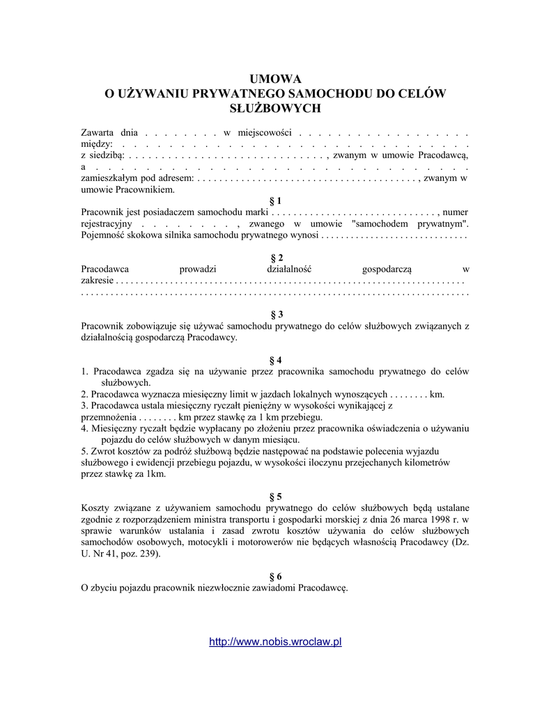 UMOWA O UŻYWANIU PRYWATNEGO SAMOCHODU DO CELÓW SŁUŻBOWYCH Zawarta dnia . . . . . . . . w miejscowości . . . . . . . . . . . . . . . . . . między: . . . . . . . . . . . . . . . . . . . . . . . . . . . . . . z siedzibą: . . . . . . . . . . . . . . . . . . . . . . . . . . . . . . , zwanym w umowie Pracodawcą, a . . . . . . . . . . . . . . . . . . . . . . . . . . . . . . zamieszkałym pod adresem: . . . . . . . . . . . . . . . . . . . . . . . . . . . . . . . . . . . . . . . . , zwanym w umowie Pracownikiem. §1 Pracownik jest posiadaczem samochodu marki . . . . . . . . . . . . . . . . . . . . . . . . . . . . . . , numer rejestracyjny . . . . . . . . , zwanego w umowie "samochodem prywatnym". Pojemność skokowa silnika samochodu prywatnego wynosi . . . . . . . . . . . . . . . . . . . . . . . . . . . . . . §2 Pracodawca prowadzi działalność gospodarczą w zakresie . . . . . . . . . . . . . . . . . . . . . . . . . . . . . . . . . . . . . . . . . . . . . . . . . . . . . . . . . . . . . . . . . . . . . . . ............................................................................... §3 Pracownik zobowiązuje się używać samochodu prywatnego do celów służbowych związanych z działalnością gospodarczą Pracodawcy. §4 1. Pracodawca zgadza się na używanie przez pracownika samochodu prywatnego do celów służbowych. 2. Pracodawca wyznacza miesięczny limit w jazdach lokalnych wynoszących . . . . . . . . km. 3. Pracodawca ustala miesięczny ryczałt pieniężny w wysokości wynikającej z przemnożenia . . . . . . . . km przez stawkę za 1 km przebiegu. 4. Miesięczny ryczałt będzie wypłacany po złożeniu przez pracownika oświadczenia o używaniu pojazdu do celów służbowych w danym miesiącu. 5. Zwrot kosztów za podróż służbową będzie następować na podstawie polecenia wyjazdu służbowego i ewidencji przebiegu pojazdu, w wysokości iloczynu przejechanych kilometrów przez stawkę za 1km. §5 Koszty związane z używaniem samochodu prywatnego do celów służbowych będą ustalane zgodnie z rozporządzeniem ministra transportu i gospodarki morskiej z dnia 26 marca 1998 r. w sprawie warunków ustalania i zasad zwrotu kosztów używania do celów służbowych samochodów osobowych, motocykli i motorowerów nie będących własnością Pracodawcy (Dz. U. Nr 41, poz. 239). §6 O zbyciu pojazdu pracownik niezwłocznie zawiadomi Pracodawcę. http://www.nobis.wroclaw.pl §7 Umowa obowiązuje od . . . . . . . . i może być rozwiązana przez obie strony z zachowaniem tygodniowego okresu wypowiedzenia. §8 W sprawach nie uregulowanych niniejszą umową mają zastosowanie przepisy rozporządzenia ministra transportu i gospodarki morskiej z dnia 26 marca 1998 r. w sprawie warunków ustalania i zasad zwrotu kosztów używania do celów służbowych samochodów osobowych, motocykli i motorowerów nie będących własnością Pracodawcy (Dz. U. Nr 41, poz. 239). §9 Umowę sporządzono w . . . . . . . . jednobrzmiących egzemplarzach, po jednym dla każdej ze stron. ............. ............. (Pracodawca) (Pracownik) http://www.nobis.wroclaw.pl