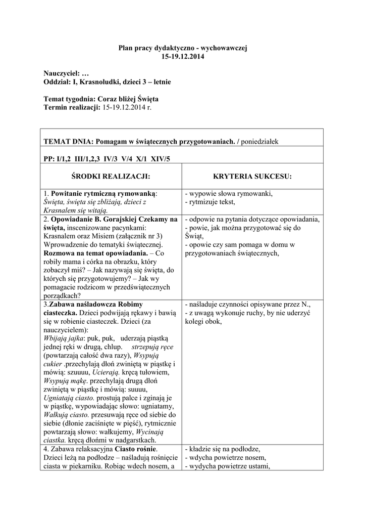 Plan pracy dydaktyczno - wychowawczej 15-19.12.2014 Nauczyciel: … Oddział: I, Krasnoludki, dzieci 3 – letnie Temat tygodnia: Coraz bliżej Święta Termin realizacji: 15-19.12.2014 r. TEMAT DNIA: Pomagam w świątecznych przygotowaniach. / poniedziałek PP: I/1,2 III/1,2,3 IV/3 V/4 X/1 XIV/5 ŚRODKI REALIZACJI: 1. Powitanie rytmiczną rymowanką: Święta, święta się zbliżają, dzieci z Krasnalem się witają. 2. Opowiadanie B. Gorajskiej Czekamy na święta, inscenizowane pacynkami: Krasnalem oraz Misiem (załącznik nr 3) Wprowadzenie do tematyki świątecznej. Rozmowa na temat opowiadania. – Co robiły mama i córka na obrazku, który zobaczył miś? – Jak nazywają się święta, do których się przygotowujemy? – Jak wy pomagacie rodzicom w przedświątecznych porządkach? 3.Zabawa naśladowcza Robimy ciasteczka. Dzieci podwijają rękawy i bawią się w robienie ciasteczek. Dzieci (za nauczycielem): Wbijają jajka: puk, puk, uderzają piąstką jednej ręki w drugą, chlup. strzepują ręce (powtarzają całość dwa razy), Wsypują cukier .przechylają dłoń zwiniętą w piąstkę i mówią: szuuuu, Ucierają. kręcą tułowiem, Wsypują mąkę. przechylają drugą dłoń zwiniętą w piąstkę i mówią: suuuu, Ugniatają ciasto. prostują palce i zginają je w piąstkę, wypowiadając słowo: ugniatamy, Wałkują ciasto. przesuwają ręce od siebie do siebie (dłonie zaciśnięte w pięść), rytmicznie powtarzają słowo: wałkujemy, Wycinają ciastka. kręcą dłońmi w nadgarstkach. 4. Zabawa relaksacyjna Ciasto rośnie. Dzieci leżą na podłodze – naśladują rośnięcie ciasta w piekarniku. Robiąc wdech nosem, a KRYTERIA SUKCESU: - wypowie słowa rymowanki, - rytmizuje tekst, - odpowie na pytania dotyczące opowiadania, - powie, jak można przygotować się do Świąt, - opowie czy sam pomaga w domu w przygotowaniach świątecznych, - naśladuje czynności opisywane przez N., - z uwagą wykonuje ruchy, by nie uderzyć kolegi obok, - kładzie się na podłodze, - wdycha powietrze nosem, - wydycha powietrze ustami, wydech ustami, obserwują podnoszenie się i opadanie swojego brzucha. 5. Zabawa z masą solną: Świąteczne pierniczki. Dzieci otrzymują tacki oraz kulki z masy solnej. N. na środku stołu kładzie plastikowe foremki (zamiast foremek mogą być plastikowe zakrętki różnej wielkości). Powtarzając rymowankę przypominającą kolejne etapy przygotowania ciasta, zachęca dzieci do wykonywania poszczególnych czynności. Dzieci: Najpierw ciasto ugniatamy. ugniatają kulkę masy solnej raz jedną, raz drugą ręką, Teraz – wałkujemy. formują placek (przesuwając po cieście dłonią zaciśniętą w pięść), No a potem z tego ciasta ciasteczka wytniemy. wyciskają foremkami różne wzory ciasteczek. Nauczyciel umieszcza dziecięce wytwory na tacach, aby wyschły. (Po wyschnięciu i pomalowaniu farbami umieści je w kąciku kuchennym, gdzie posłużą do zabawy). - obserwuje swój brzuch, - siada przy stole, - podwija rękawy, - ugniata kulkę z masy solnej, - wałkuje kulkę, - formuje placek, - wycina foremką wybrany kształt ciasteczka, - samodzielnie myje ręce, - maluje farbą swoje ciasteczko, TEMAT DNIA: Wesoła choinka. / wtorek PP: I/1,2 III/1,3 V/3,4 XI/1 XII/1 XIV/2,3,5 ŚRODKI REALIZACJI: 1. Zabawa inhibicyjno-incytacyjna Bombka choinkowa. Dzieci poruszają się po sali w rytmie wystukiwanym przez nauczyciela na bębenku. Podczas przerwy w grze z obu rąk formują przed sobą okrąg – choinkową bombkę. Zabawę powtarzamy kilka razy. 2. Zabawa z wierszem T. Kubiaka Wesoła choinka. Rozmowa na temat zbliżających się świąt. Przedstawienie choinki, omówienie jej wyglądu. 3. Oglądanie gałązek świerka i sosny; dotykanie ich, wąchanie, porównywanie wyglądu igieł; zwrócenie uwagi, z jakich drzew pochodzą gałązki i gdzie można je zobaczyć; umieszczenie ich w kąciku przyrody. KRYTERIA SUKCESU: - porusza się po Sali w rytm muzyki zachowując zasady bezpieczeństwa, - reaguje na przerwę w wystukiwanym rytmie, - formuje okrąg z rąk, - odpowie na pytania dotyczące wiersza, - podzieli się swoimi spostrzeżeniami związanymi ze Świętami, - opisze wygląd choinki, - dotknie prezentowane gałązki, - powącha gałązki i opisze ich zapach, - nazwie drzewa, z których one pochodzą: świerk i sosna, - opisze wygląd igieł gałązek i wskaże różnice, - umieści gałązki w kąciku przyrody, 4. Zabawa ruchowa przy choince (CD – Witaj, choinko!) Podczas zwrotek dzieci poruszają się naokoło choinki, trzymając się za ręce. W trakcie refrenów stają twarzą do środka koła, łączą wyprostowane ręce nad głową (pokazują choinkę ubraną w czubek) i lekko się kołyszą. 5. Różnice między choinkami. Każde dziecko otrzymuje kartkę przedstawiającą 2 choinki. Zadaniem dzieci będzie przy drugiej choince dorysować brakujące elementy. 6. Zestaw zabaw ruchowych z rekwizytem (duża koperta) dla dzieci 3-4 letnich. 7. Wyjście na spacer alejkami osiedlowymi. Poszukiwanie choinek: świerków, sosen. Opisywanie wyglądu drzew. Zwrócenie uwagi na fakt, iż drzewa iglaste nie pozbywają się igieł na zimę. Opisuje pogodę oraz zjawiska atmosferyczne. - porusza się rytmicznie wokół choinki, - tańczy zachowując zasady bezpieczeństwa, - podczas refrenu łączy ręce nad głową, - lekko się kołysze, - podejmie próbę śpiewu refrenu piosenki, - wskaże czym różnią się przedstawione na rysunku choinki, - dorysuje brakujące elementy drugiej choince, - pokoloruje rysunek, - schowa kredki po skończonej zabawie, - biegnie slalomem między kopertami, - unosi do góry kopertę, - kładzie kopertę przed stopami, - w leżeniu na ziemi kładzie kopertę na brzuchu, - oddycha mocno: wdycha powietrze nosem, wydycha ustami, - maszeruje z kopertą po Sali w rytm bębenka, - na hasło: „list” podnosi kopertę jak najwyżej, stając na palcach. - samodzielnie założy obuwie, - schowa pantofle do p