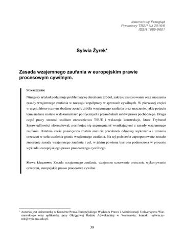 Internetowy Przegląd Prawniczy TBSP UJ 2016/6 ISSN 1689-9601 Sylwia Żyrek Zasada wzajemnego zaufania w europejskim prawie procesowym cywilnym. Streszczenie Niniejszy artykuł podejmuje problematykę określenia źródeł, zakresu zastosowania oraz znaczenia zasady wzajemnego zaufania w rozwoju współpracy w sprawach cywilnych. W pierwszej części w ujęciu historycznym zbadane zostały źródła wzajemnego zaufania oraz znaczenie, jakie pojęciu temu nadane zostało w dokumentach politycznych i preambułach aktów prawa pochodnego. Druga część pracy stanowi studium orzecznictwa TSUE i wskazuje konstrukcje, które Trybunał Sprawiedliwości sformułował, posiłkując się argumentami wynikającymi z zasady wzajemnego zaufania. Ostatnia część poświęcona została analizie przesłanek odmowy wykonania i uznania orzeczeń w celu ustalenia granic wzajemnego zaufania. Na tej podstawie zaproponowane zostało znaczenie zasady wzajemnego zaufania i cel, w jakim powinna być ona podnoszona w procesie wykładni europejskiego prawa procesowego cywilnego. Słowa kluczowe: Zasada wzajemnego zaufania, wzajemne uznawanie orzeczeń, wykonywanie orzeczeń, europejskie prawo procesowe cywilne. Autorka jest doktorantką w Katedrze Prawa Europejskiego Wydziału Prawa i Administracji Uniwersytetu Warszawskiego oraz aplikantką przy Okręgowej Radzie Adwokackiej w Warszawie; kontakt: [email protected]. 38 1. Wstęp Wzajemne zaufanie stało się jednym ze słów kluczowych w dyskusji nad przyszłością europejskiego prawa procesowego cywilnego1. Już od lat siedemdziesiątych odwołują się do niego raporty interpretujące2, programy strategiczne, preambuły aktów prawa pochodnego, jak również orzecznictwo TSUE. Jednocześnie w dyskusji nad zaufaniem do wymiaru sprawiedliwości wskazuje się, że obywatele państw członkowskich UE nie tylko dostrzegają istotne różnice jakościowe pomiędzy krajowymi organami władzy sądowniczej w takich kategoriach, jak kompetencje sędziów, sprawiedliwość rozstrzygnięć, niezależność sądownictwa, lecz wielu z nich nie ufa nawet swoim krajowym judykatywom3. Rodzi to pytania o cel, znaczenie i funkcje, jakie wzajemne zaufanie pełni w budowaniu przestrzeni wolności, bezpieczeństwa i sprawiedliwości (PWBiS). Problemom tym ograniczonym do współpracy w sprawach cywilnych poświęcona została niniejsza praca. W jej pierwszej części w ujęciu historycznym zbadane zostały źródła wzajemnego zaufania oraz znaczenie, jakie pojęciu temu nadane zostało w dokumentach politycznych i preambułach aktów prawa pochodnego. Druga część pracy stanowi studium orzecznictwa TSUE i wskazuje konstrukcje prawne, które Trybunał sformułował, posiłkując się argumentami wynikającymi z zasady wzajemnego zaufania. Ostatnia część poświęcona została analizie przesłanek odmowy wykonania i uznania orzeczeń w celu ustalenia granic wzajemnego zaufania. Na tej podstawie zaproponowane zostało znaczenie zasady wzajemnego zaufania i cel, w jakim powinna być ona podnoszona w procesie wykładni europejskiego prawa procesowego cywilnego. 2. Geneza i źródła zasady wzajemnego zaufania w europejskim prawie procesowym cywilnym Komisja Europejska, “Building Trust in Justice Systems in Europe: ‘Assises de la Justice’ Forum to Shape the Future of EU Justice Policy”, 21 listopada 2013; Komisja Europejska, “Towards a True European Area of Justice: Strengthening Trust, Mobility and Growth”, Press Release IP/14/233 z 11 marca 2014. 1 Sprawozdanie na temat konwencji z dnia 27 września 1968 r. o jurysdykcji i wykonywaniu orzeczeń sądowych w sprawach cywilnych i handlowych, Dz. Urz. UE C 59, 5 marca 1979, s. 46. 2 Komisja Europejska, Flash Eurobarometer 385, “Justice in the EU”, Report conducted by TNS Political & Social at the request of the European Commission, Directorate-General for Justice (DG JUST), listopad 2013 za: M. Weller, Mutual Trust: In Search of the Future of European Private International Law, „Journal of Private International Law” 2015, nr 1, s. 66. 3 39 Źródeł zasady wzajemnego zaufania we współpracy w sprawach cywilnych należy upatrywać w genezie Konwencji brukselskiej (1968)4, która uregulowała podstawowe instrumenty międzynarodowego procesu cywilnego pomiędzy członkami Wspólnot Europejskich. Bez istnienia odpowiedniego poziomu wzajemnego zaufania między umawiającymi się państwami niemożliwe byłoby uzgodnienie jednolitych przepisów dotyczących jurysdykcji oraz wzajemnego uznawania i wykonywania orzeczeń w sprawach cywilnych. Jego wysoki poziom uzasadnił ograniczenie przesłanek odmowy uznania oraz wykonania orzeczenia, zwłaszcza wyeliminowanie przesłanki „braku jurysdykcji krajowej”. Przyjęto wówczas, że zaufanie do sądu państwa pochodzenia wymaga założenia, że sąd ten prawidłowo będzie stosować postanowienia konwencji dotyczące jurysdykcji5. Założenie to pozwoliło na uniknięcie ponownego podnoszenia problemu zgodności orzeczenia z przepisami o jurysdykcji krajowej na etapie zezwalania na wykonanie6. Drugi etap rozwoju współpracy w sprawach cywilnych, na którym ujawniła się rola wzajemnego zaufania, łączył się z włączeniem działań podejmowanych w zakresie współpracy w sprawach cywilnych do kompetencji UE. W ten sposób w Traktacie z Amsterdamu nastąpiło odejście od formalnego określenia współpracy jako dziedzin wzajemnego zainteresowania na rzecz ustanowienia nowego celu UE – utworzenia PWBiS7. Manifestację politycznej woli wykorzystania w pełnym zakresie kompetencji, jakie przyznał instytucjom UE w zakresie PWBiS Trakt Amsterdamski, stanowiły konkluzje spotkania Rady Europejskiej z Tampere z 1999 r.8 Uznano w nich, że aby możliwe było korzystanie z pełni wolności, niezbędne jest ukształtowanie prawdziwego obszaru sprawiedliwości, tj. osiągnięcie stanu, w którym obywatele jakiegokolwiek państwa członkowskiego będą mieli tak samo łatwy do