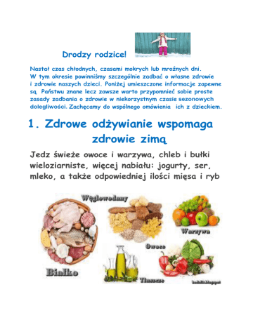 Drodzy rodzice! Nastał czas chłodnych, czasami mokrych lub mroźnych dni. W tym okresie powinniśmy szczególnie zadbać o własne zdrowie i zdrowie naszych dzieci. Poniżej umieszczone informacje zapewne są Państwu znane lecz zawsze warto przypomnieć sobie proste zasady zadbania o zdrowie w niekorzystnym czasie sezonowych dolegliwości. Zachęcamy do wspólnego omówienia ich z dzieckiem. 1. Zdrowe odżywianie wspomaga zdrowie zimą Jedz świeże owoce i warzywa, chleb i bułki wieloziarniste, więcej nabiału: jogurty, ser, mleko, a także odpowiedniej ilości mięsa i ryb 2. Dbaj o Higienę zimą Brak higieny to możliwość atakowania nas przez bakterie i wirusy. Pamiętaj ,aby zawsze myć ręce. Zużyte chusteczki od razu wyrzucaj. Zakrywaj usta, gdy kichasz czy kaszlesz i nie zarażaj innych. Rodzicu- chore dziecko pozostaw w domu. 3. Ubieraj się odpowiednio do pogody Ubieraj się odpowiednio do chłodnej temperatury, najlepiej na cebulkę. W razie potrzeby ściągniesz jedną warstwę. W zimie zakładaj czapkę aby chronić głowę, szalik oraz rękawiczki na dłonie. 4. Zimą uprawiaj regularny ruch na świeżym powietrzu Nawet jeśli pogoda nie jest najlepsza, wychodź na świeże powietrze przynajmniej raz dziennie. Ruch jest bardzo ważny dla dobrego stanu zdrowia, nawet spacery. 5. Zimą wypijaj wiele płynów W pokojach zimą z powodu ogrzewania powietrze jest wyjątkowo suche. Pij więc dużo herbaty, również ziołowe, wodę i soki. Płyny nawilżą błony śluzowe. 6. Zimą Sen bardzo dobrze wpływa na zdrowie Sen wzmacnia system odpornościowy i szczególnie zimą należy się wysypiać. Przed snem wywietrz pokój i pamiętaj, aby nie było w nim za ciepło. 7. Relaks Potrzebujesz odpoczynku, aby przetworzyć różne wydarzenia dnia. Dobre samopoczucie będzie wspierać czas spędzony z przyjaciółmi i aktywność na świeżym powietrzu. 8. Pielęgnacja twarzy i ciała zimą Zimą nawilżaj twarz i wargi kremem, a gdy jest mróz stosuj krem ochronny. 9.Zdrowy klimat w pomieszczeniach Temperatura w pomieszczeniach nie powinna przekraczać 22 stopni, a nocą zmniejsz lub wyłącz ogrzewanie. Używaj nawilżaczy powietrza Pamiętaj aby regularnie wietrzyć pokoje. 10. Hartowanie zapewni zdrowie zimą Zmiany temperatur z ciepłej na zimną poprawiają krążenie i korzystnie wpływają na zdrowie dziecka i osoby dorosłej. Naprzemienne mocz stopy w zimnej wodzie (pięć sekund) i w ciepłej wodzie (około pięć minut). Powtórz zamianę trzy razy i zakończ zimną wodą. Ważne są też codzienne spacery ZIMA MOŻE BYĆ WESOŁĄ I ZDROWĄ PORĄ ROKU ! pedgog Barbara Bulczak