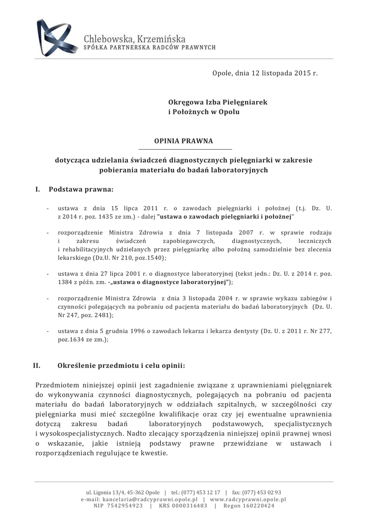 Opole, dnia 12 listopada 2015 r. Okręgowa Izba Pielęgniarek i Położnych w Opolu OPINIA PRAWNA dotycząca udzielania świadczeń diagnostycznych pielęgniarki w zakresie pobierania materiału do badań laboratoryjnych I. II. Podstawa prawna: - ustawa z dnia 15 lipca 2011 r. o zawodach pielęgniarki i położnej ( t.j. Dz. U. z 2014 r. poz. 1435 ze zm.) - dalej ”ustawa o zawodach pielęgniarki i położnej” - rozporządzenie Ministra Zdrowia z dnia 7 listopada 2007 r. w sprawie rodzaju i zakresu świadczeń zapobiegawczych, diagnostycznych, leczniczych i rehabilitacyjnych udzielanych przez pielęgniarkę albo położną samodzielnie bez zlecenia lekarskiego (Dz.U. Nr 210, poz.1540); - ustawa z dnia 27 lipca 2001 r. o diagnostyce laboratoryjnej (tekst jedn.: Dz. U. z 2014 r. poz. 1384 z późn. zm. -„ustawa o diagnostyce laboratoryjnej”); - rozporządzenie Ministra Zdrowia z dnia 3 listopada 2004 r. w sprawie wykazu zabiegów i czynności polegających na pobraniu od pacjenta materiału do badań laboratoryjnych (Dz. U. Nr 247, poz. 2481); - ustawa z dnia 5 grudnia 1996 o zawodach lekarza i lekarza dentysty (Dz. U. z 2011 r. Nr 277, poz.1634 ze zm.); Określenie przedmiotu i celu opinii: Przedmiotem niniejszej opinii jest zagadnienie związane z uprawnieniami pielęgniarek do wykonywania czynności diagnostycznych, polegających na pobraniu od pacjenta materiału do badań laboratoryjnych w oddziałach szpitalnych, w szczególności czy pielęgniarka musi mieć szczególne kwalifikacje oraz czy jej ewentualne uprawnienia dotyczą zakresu badań laboratoryjnych podstawowych, specjalistycznych i wysokospecjalistycznych. Nadto zlecający sporządzenia niniejszej opinii prawnej wnosi o wskazanie, jakie istnieją podstawy prawne przewidziane w ustawach i rozporządzeniach regulujące te kwestie. ul. Ligonia 13/4, 45-362 Opole | tel.: (077) 453 12 17 | fax: (077) 453 02 93 e-mail: [email protected] | www.radcyprawni.opole. pl NIP 7542954923 | KRS 0000316483 | Regon 160220424 III. Ocena prawna: Omawiając tematykę będącą przedmiotem niniejszej opinii, poprzedzając rozważania odnoszące się wprost do wyrażonych wątpliwości związanych z wykonywaniem świadczeń diagnostycznych, celowe jest poczynienie uwag natury ogólnej, związanych z wykonywaniem czynności przez pielęgniarki samodzielnie i na zlecenie lekarza. 3.1. Wykonywanie zlecenia lekarskiego - obowiązek ustawowy Nie budzi wątpliwości fakt, że w procesie terapeutycznym główną rolę odgrywa lekarz, który na podstawie postawionej przez siebie diagnozy wydaje pielęgniarce 1, zlecenie lekarskie będące istotnym elementem tego procesu. Zasadniczo zatem wszelkie świadczenia zdrowotne udzielane przez pielęgniarkę są wykonywane na podstawie zleceń, chyba że dane świadczenie jest określone w przepisach jako te, które może być wykonywane samodzielnie bez zlecenia. Istotną kwestią jest wskazanie działań medycznych, które pielęgniarka może wykonywać na zlecenie lekarskie. Brak jest jednak katalogu takich czynności, także gdy chodzi o świadczenia diagnostyczne. Nie ma przepisów, które określałyby go w sposób wyczerpujący. Ustawodawca określa jedynie zakres i rodzaj świadczeń medycznych wykonywanych przez pielęgniarkę samodzielnie, bez zlecenia lekarskiego. Zatem każde świadczenie medyczne, jeżeli tylko pozostaje w zakresie kwalifikacji zawodowych pielęgniarki może być przez nią podejmowane ale tylko po uzyskaniu zlecenia lekarskiego. I tutaj pojawia się zasadnicza kwestia - zakresu posiadanych kwalifikacji pielęgniarki. Obowiązek wykonania zlecenia lekarskiego jest nakazem ustawowym, nie ma on jednak charakteru bezwzględnego, i w pewnych sytuacjach zlecenie nie powinno być realizowane. Mianowicie, pielęgniarce przysługuje prawo odmowy jego realizacji jeżeli zakres tego świadczenia przekracza zakres posiadanych kwalifikacji. Jeżeli zatem dane świadczenie wymaga wiedzy i umiejętności, których pielęgniarka nie posiada - nie nabyła ich w procesie kształcenia - winna odmówić jego realizacji (art. 12 ustawy o zawodach pielęgniarki i położnej). Odmowa realizacji nie może nastąpić jedynie w sytuacji, gdy zwłoka w jej udzieleniu mogłaby spowodować stan nagłego zagrożenia zdrowotnego. 3.2. Wykonywanie świadczeń diagnostycznych - przepisy ogólne Pobranie materiałów do badań diagnostycznych od pacjenta należy niewątpliwie uznać za rodzaj świadczenia zdrowotnego. Świadczenia zdrowotne mogą być udzielane tylko przez uprawniony personel medyczny. w dalszej części niniejszej opinii prawnej przez pojęcie pielęgniarki (w formie liczby pojedynczej i mnogiej) należy również rozumieć pielęgniarza (w formie liczby pojedynczej i mnogiej) 1 2 Kwestię osób uprawnionych do pobierania materiałów do badań najdokładniej określają przepisy dotyczące diagnostyki laboratoryjnej. Związane jest to z celem i przedmiotem działalności diagnostyki laboratoryjnej. Czynności diagnostyki laboratoryjnej obejmują przede wszystkim badania laboratoryjne mające na celu określenie właściwości fizycznych, chemicznych i biologicznych oraz składu płynów ustrojowych, wydzielin, wydalin i tkanek pobranych dla celów profilaktycznych, diagnostycznych i leczniczych lub sanitarno -epidemiologicznych (art. 2 pkt 1 ustawy z dnia 27 lipca 2001 r. o diagnostyce laboratoryjnej; tekst jedn.: Dz. U. z 2004 r. Nr 144, poz. 1529 z późn. zm.) – dalej „ustawa o diagnostyce laboratoryjnej”. Zgodnie z art. 6 tej ustawy osobą uprawnioną do samodzielnego wykonywania czynności diagnostyki laboratoryjnej w laboratorium jest: 1) diagnosta laboratoryjny; 2) osoba posiadająca tytuł zawodowy lekarza i prawo wykonywania zawodu lekarza oraz wiedzę i umiejętności w zakresie wykonywania czynności diagnostyki laboratoryjnej, uzyskane w ramach specjalizacji, lub posiadająca umiejętności z zakresu węższych dziedzin medycyny. Zgodnie z art. 6b do ustawy o diagnostyce l