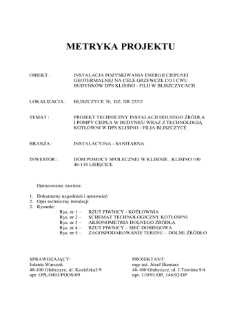 METRYKA PROJEKTU OBIEKT : INSTALACJA POZYSKIWANIA ENERGII CIEPLNEJ GEOTERMALNEJ NA CELE GRZEWCZE CO I CWU BUDYNKÓW DPS KLISINO - FILII W BLISZCZYCACH LOKALIZACJA : BLISZCZYCE 76, DZ. NR 255/2 TEMAT : PROJEKT TECHNICZNY INSTALACJI DOLNEGO ŹRÓDŁA I POMPY CIEPŁA W BUDYNKU WRAZ Z TECHNOLOGIĄ KOTŁOWNI W DPS KLISINO - FILIA BLISZCZYCE BRANŻA : INSTALACYJNA - SANITARNA INWESTOR : DOM POMOCY SPOŁECZNEJ W KLISINIE , KLISINO 100 48-118 LISIĘCICE Opracowanie zawiera: 1. Dokumenty uzgodnień i uprawnień 2. Opis techniczny instalacji 3. Rysunki: Rys. nr 1 – RZUT PIWNICY - KOTŁOWNIA Rys. nr 2 – SCHEMAT TECHNOLOGICZNY KOTŁOWNI Rys. nr 3 – AKSONOMETRIA DOLNEGO ŹRÓDŁA Rys. nr 4 – RZUT PIWNICY – SIEĆ DOBIEGOWA Rys. nr 5 – ZAGOSPODAROWANIE TERENU – DOLNE ŹRÓDŁO SPRAWDZAJĄCY: Jolanta Warczok 48-100 Głubczyce, ul. Kozielska3/9 upr. OPL/0493/POOS/09 PROJEKTANT: mgr inż. Józef Bieniarz 48-100 Głubczyce, ul. J.Tuwima 9/4 upr. 110/91/OP, 146/92/OP 1. Podstawa opracowania : - Zlecenie Inwestora z dnia 2012-04-11 Projekt budowlany termomodernizacji budynku Audyt energetyczny budynku Uzgodnienia z Inwestorem, Ustawa Prawo budowlane z dnia 7 lipca 1994 r z późniejszymi zmianami (Dz.U. Nr 106/00 poz. 1126, Dz.U.06.156.1118 j.t. 2008.01.19 zm. Dz.U.07.191.1373). - Rozporządzenie Ministra Infrastruktury z dnia 12 kwietnia 2002 r. w sprawie warunków technicznych jakim powinny odpowiadać budynki i ich usytuowanie (Dz.U. Nr 75/02 poz. 690, Nr 33/03 poz. 270, Nr 109/04 poz. nr1156). - Wytyczne projektowe i zeszyty fachowe opisujące zasady budowy instalacji pomp ciepła opracowane przez producentów. 2. Zakres opracowania. Niniejszy projekt określa sposób wykonania instalacji pozyskiwania energii cieplnej geotermalnej za pomocą pompy ciepła zasilającej w wodę grzewczą instalację cen t ralnego ogrzewania oraz instalację produkcji ciepłej wody użytkowej dla potrzeb budynków Domu Pomocy Społecznej w Klisinie Filii w Bliszczycach. 3. Charakterystyka obiektu. Obiekty DPS Klisino filia w Bliszczycach to dwa budynki. Budynek Główny składa się z trzech kondygnacji. Konstrukcja budynku tradycyjna. Budynek z dachem płaskim. Budynek posiada dużą powierzchnię przegród przeszklonych. W części piwnicznej budynku znajdują się pomieszczenia użytkowe, kotłownia pralnia i inne pomieszczenia gospodarcze. Na parterze budynku znajdują się pomieszczenia stołówki kierownika i personelu oraz pomieszczenia pokoi pensjonariuszy. Na piętrze pokoje pensjonariuszy. Kotłownia wyposażona jest w trzy kotły stalowe opalane olejem opałowym. Dwa kotły typu: DXN127 oraz jeden kocioł typu DXN 100. Kotły odpowiednio mają moce 127 kW oraz 100 kW. Kotłownia produkuje energię cieplną na potrzeby ogrzewania budynku Głównego oraz budynku Pomocniczego zlokalizowanego obok. Kotły pracują z instalacją CO w układzie zamkniętym i obiegiem wymuszonym pompowym. Naczynie wzbiorcze zamknięte przeponowe znajduje się w kotłowni. Instalacja CO wykonana jest z rur stalowych, które współpracują z grzejnikami stalowymi panelowymi. Instalacja dwururowa z odpowietrzeniami na pionach. Na instalacji przed grzejnikami zamontowane są zawory termostatyczne. Pomieszczenie kotłowni posiada wentylację grawitacyjną, studzienkę schładzającą podłączoną do kanalizacji. W kotłowni produkowana jest również ciepła woda użytkowa w pojemnościowych podgrzewaczach wody. Ciepła woda podawana jest do instalacji wody użytkowej budynku Głównego jak i Pomocniczego. Obydwa budynki połączone są kanałem ciepłowniczym wykonanym metodą tradycyjną. Budynek Pomocniczy składa się z trzech kondygnacji. Konstrukcja budynku tradycyjna. Budynek z dachem płaskim. W części piwnicznej budynku znajdują się pomieszczenia użytkowe, kuchnia i inne pomieszczenia gospodarcze. Na parterze budynku znajdują się pomieszczenia personelu i pomieszczenia pokoi pensjonariuszy. Na piętrze pokoje pensjonariuszy. Instalacja CO wykonana jest z rur stalowych, które współpracują z grzejnikami stalowymi panelowymi i członowymi żeliwnymi. Instalacja dwururowa z odpowietrzeniami na pionach. Na instalacji przed grzejnikami zamontowane są zawory termostatyczne. Obydwa budynki zostaną poddane termomodernizacji zgodnie z wytycznymi audytu energetycznego. Między innymi zmodernizowane zostanie instalacja źródła wody grzewczej. Wykonane zostanie ocieplenie ścian budynku poprzez obłożenie z zewnątrz warstwą styropianu wg wytycznych osobnego opracowania w tym zakresie. Istniejące źródło ciepła zostanie zastąpione ekologicznym jakim jest pompa ciepła odzyskująca energię z ziemi oraz kolektorami słonecznymi pozyskującymi energię słoneczną. 4. Charakterystyka energetyczna obiektu. a. Źródło ciepła. Budynek posiada własną kotłownię opalaną olejem opałowym. Woda grzewcza wytwarzana jest w trzech kotłach. Dwa kotły typu: DXN127 oraz jeden kocioł typu DXN 100. Razem całkowita moc zainstalowana w kotłowni wynosi 354 kW. Kotłownia wytwarza wodę grzewczą dla potrzeb centralnego ogrzewania i produkcji ciepłej wody użytkowej. Kotłownia obsługiwana jest przez gospodarza obiektu oraz serwisanta w formie zlecenia. Projektuje się do celów ogrzewania budynku oraz dostarczania energii do produkcji ciepłej wody użytkowej wykorzystanie pompy ciepła. Projektowana pompa ciepła będzie pozyskiwała energię cieplną z ziemi. Moc zainstalowanej pompy ciepła wynosić będzie 120 kW. Projektuje się odzyskiwanie ciepła ziemi poprzez pionowe sondy rurowe. Sondy w kształcie litery U zostaną zanurzone w otworach pionowych o średnicy 110 mm i głębokości 100 m każdy. Dolne źródło składa się z 24 otworów z sondami. Dolne źródło z pompą ciepła dostarczać będzie energię cieplną o parametrach 70°C na 50°C. Taka konfiguracja pozwoli na pokrycie potrzeb energii cieplnej budynków do temperatury -12°C. Pozostała część energii potrzebnej na pokrywanie strat ciepl