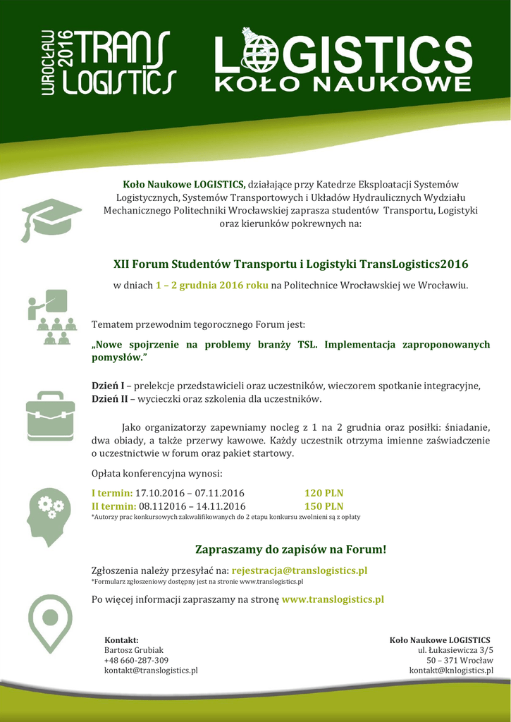 Koło Naukowe LOGISTICS, działające przy Katedrze Eksploatacji Systemów Logistycznych, Systemów Transportowych i Układów Hydraulicznych Wydziału Mechanicznego Politechniki Wrocławskiej zaprasza studentów Transportu, Logistyki oraz kierunków pokrewnych na: XII Forum Studentów Transportu i Logistyki TransLogistics2016 w dniach 1 – 2 grudnia 2016 roku na Politechnice Wrocławskiej we Wrocławiu. Tematem przewodnim tegorocznego Forum jest: „Nowe spojrzenie na problemy branży TSL. Implementacja zaproponowanych pomysłów.” Dzień I – prelekcje przedstawicieli oraz uczestników, wieczorem spotkanie integracyjne, Dzień II – wycieczki oraz szkolenia dla uczestników. Jako organizatorzy zapewniamy nocleg z 1 na 2 grudnia oraz posiłki: śniadanie, dwa obiady, a także przerwy kawowe. Każdy uczestnik otrzyma imienne zaświadczenie o uczestnictwie w forum oraz pakiet startowy. Opłata konferencyjna wynosi: I termin: 17.10.2016 – 07.11.2016 II termin: 08.112016 – 14.11.2016 120 PLN 150 PLN *Autorzy prac konkursowych zakwalifikowanych do 2 etapu konkursu zwolnieni są z opłaty Zapraszamy do zapisów na Forum! Zgłoszenia należy przesyłać na: [email protected] *Formularz zgłoszeniowy dostępny jest na stronie www.translogistics.pl Po więcej informacji zapraszamy na stronę www.translogistics.pl Kontakt: Bartosz Grubiak +48 660-287-309 [email protected] Koło Naukowe LOGISTICS ul. Łukasiewicza 3/5 50 – 371 Wrocław [email protected]