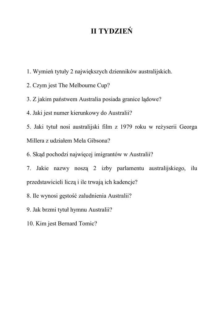 II TYDZIEŃ 1. Wymień tytuły 2 największych dzienników australijskich. 2. Czym jest The Melbourne Cup? 3. Z jakim państwem Australia posiada granice lądowe? 4. Jaki jest numer kierunkowy do Australii? 5. Jaki tytuł nosi australijski film z 1979 roku w reżyserii Georga Millera z udziałem Mela Gibsona? 6. Skąd pochodzi najwięcej imigrantów w Australii? 7. Jakie nazwy noszą 2 izby parlamentu australijskiego, ilu przedstawicieli liczą i ile trwają ich kadencje? 8. Ile wynosi gęstość zaludnienia Australii? 9. Jak brzmi tytuł hymnu Australii? 10. Kim jest Bernard Tomic?