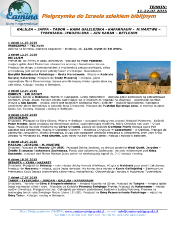 TERMIN: 11-22.07.2015 Pielgrzymka do Izraela szlakiem biblijnym GALILEA – JAFFA - TABOR – KANA GALILEJSKA - KAFARNAUM - M.MARTWE – TYBERIADA- JEROZOLIMA – AIN KARIM – BETLEJEM 1 dzień 11.07.2015 WARSZAWA – TEL AVIV zbiórka na lotnisku, odprawa bagażowo – biletowa, ok. 22.00. wylot do Tel Avivu. 2 dzień 12.07.2015 BETLEJEM Przylot do Tel Awiwu w godz. porannych. Przejazd na Pole Pasterzy, miejsce gdzie Anioł Pasterzom obwieszcza nowinę o Narodzeniu Jezusa. Przejazd do sklepu z dewocjonaliami z możliwością zakupu pamiątek, sklep prowadzony jest od lat przez palestyńskich chrześcijan. Nawiedzenie Bazyliki Narodzenia Pańskiego – Grota Narodzenia. Wizyta w Kościele Świętej Katarzyny. Przejście do Groty Mlecznej – miejsce, gdzie najświętsza Maria Pana karmiąc Jezusa uroniła kroplę mleka i grota stała się cała biała. Kolacja i nocleg w Betlejem. 3 dzień 13.07.2015 HEBRON – EIN KAREM Śniadanie. Dzień w Hebronie. Wizyta w Synagodze. Grota Patriarchów – miejscu gdzie pochowani są patriarchowie Abraham, Izaak, Jakub. Miejsce często pojawiające się w mediach ze względu na izraelsko – palestyński konflikt. Wizyta w Ein Karem – wiosce, która jest miejscem spotkania Marii i Elżbiety – Kościół Nawiedzenia. Następnie odczytamy słowa Benedictus w kościele Jana Chrzciciela. Przejazd do Pustelni Świętego Jana, w tradycji miejsce Grobu św. Elżbiety. Kolacja i nocleg w Betlejem. 4 dzień 14.07.2015 JEROZOLIMA Śniadanie. Przejazd na Górę Oliwną. Wizyta w Betfage – początek tradycyjnej procesji Niedzieli Palmowej. Kościół Pater Noster, gdzie znajdują się maloikowe tablice, upamiętniające modlitwę, którą Chrystus nas uczy – Ojcze Nasz. Przejście na pole widokowe na Górze Oliwnej. Zejście do kościoła Dominus Flevit miejsca gdzie Pan zapłakał nad Jerozolimą. Wizyta w Ogrodzie Oliwnym – modlitwa Chrystusa w Getsemanii – w Ogrójcu. Przejazd do zachodniej Jerozolimy. Wielka Synagoga, druga pod względem wielkości synagoga w Jerozolimie, przy ulicy króla Jerzego VI Windsora 58. Mea Sharim, czas wolny na Ben Yehuda street. Kolacja i nocleg w Betlejem. 5 dzień 15.07.2015 MASADA - JERYCHO – M. MARTWE Śniadani. Przejazd do Masady (24 USD). Przejazd Doliną Jordanu, po drodze pustynia Wadi Quelt, Jerycho – Źródło Elizeusza i sykomora Zacheusza. Postój pod sykomorą Zacheusza i na polu widokowym pod Górą Kuszenia, przejazd nad Morze Martwe (czas wolny na relaksacyjną kąpiel ok. 3 h) kolacja i nocleg. 6 dzień 16.07.2015 SEBASTA – KANA - NAZARET Śniadanie. Przejazd do Sebasty – ruin miasta chluby Heroda Wielkiego. Wizyta w Nablusie przy studni Jakubowej. Przejazd do Nazaretu – miasta, gdzie Jezus dorastał. Na koniec dnia wizyta w Kanie Galilejskiej – Sanktuarium Pierwszego Cudu Jezusa (odnowienie sakramentu małżeństwa). Obiadokolacja i nocleg w Nazarecie/ Tyberiadzie. 7 dzień 17.07.2015 TABOR - TYBERIADA - JORDAN - GALILEA - KAFARNAUM Śniadanie. Transfer na Górę 8 Błogosławieństw – miejsce Kazania na Górze. Przejazd do Tabgha – miejsce gdzie Jezus rozmnożył chleb i ryby. Przejście do Kościoła Prymatu Świętego Piotra. Przejazd do Kafarnaum – miasta cudów Chrystusa. Przejazd nad Jez. Galilejskie po którym podróżować będziemy Łodzią Piotrową. Przerwa na tradycyjny lunch ryba Świętego Piotra (około 18 USD). Przejazd na Górę Przemienienia Pańskiego – wjazd na Górę Tabor. Kolacja i nocleg w Betlejem. Biuro Pielgrzymkowe CAMINO, www.camino-pielgrzymki.pl , e-mail: [email protected] tel: 0048 512 666 103, NIP: 637 189 66 95, REGON: 243151529 8 dzień 18.07.2015 JEROZOLIMA Śniadanie. Przejazd do Kościoła Świętej Anny. Przejście Drogi Krzyżowej. Modlitwa i zwiedzenie Bazyliki Grobu Pańskiego. Czas wolny na starym mieście. Kolacja i nocleg w Betlejem. 9 dzień 19.07.2015 Śniadanie. Przejazd do Tel Awiwu, odpoczynek na plaży. Popołudnie w Jaffie. Wizyta w Kościele Świętego Piotra. Kolacja i nocleg. 10 dzień 20.07.2015 Śniadanie. Wizyta pod Ścianą Płaczu. Wejście na Wzgórze Moria gdzie stała Świątynia Jerozolimska, a dziś znajdują się meczety Al Aksa i Kopuła na Skale. Przejazd na Syjon Chrześcijański, gdzie mieści się Wieczernik, Synagoga, Grób Króla Dawida. Przejście do Kościoła Il Galicantu, gdzie znajduje się więzienie, w którym przetrzymywano Pana Jezusa przed sądem Piłata. Kolacja i Nocleg. 11 dzień 21.07.2015 Śniadanie. Msza Święta u Sióstr Karmelitanek w Betlejem. Wizyta w Abu Gosh - miejscu nazywanym przez niektórych Emaus. Kolacja i nocleg w Betlejem. 12 dzień 22.07.2015 Śniadanie. Wylot do Polski. CENA: 45 osób płacących – 3100 PLN 40 osób płacących – 3200 PLN 35 osób płacących – 3300 PLN CENA ZAWIERA: • Przelot lotem czarterowym • Transport komfortowym autobusem na terenie Izraela (lotnicze siedzenia) • 10 noclegów – Hotel 3*** w pok. 2, 3- os. (jedynki za dopłatą – 160 USD) • śniadania, obiadokolacje • Ubezpieczenie KL, NNW, bagaż • Koszty zwiedz. wg programu • Opieka duchowa Kapłana • Przewodnik z jęz. polskim CENA NIE ZAWERA: • Tzw. Koszy realizacji programu: 100 USD dla obsługi na miejscu i koszty realizacji programu • Ubezpieczenia od kosztów rezygnacji • Ubezpieczenia od chorób przewlekłych ORGANIZATOR ZASTRZEGA SOBIE MOŻLIWOŚĆ ZMIAN W PROGRAMIE. Z uwagi na zmiany w cenach paliw oraz opłat lotniskowych, cena pielgrzymki może ulec zmianie. Przy lotach czarterowych godziny przelotów mogą ulec zmianie UWAGA! Cena kalkulowana przy kursie 1$ = 3,10 przy wzroście kursu waluty cena zostanie ponownie przeliczona na 30 dni przed wylotem Paszport ważny minimum 6 miesięcy – proszę podać datę ważności przed odlotem. ZAPRASZAMY Biuro Pielgrzymkowe CAMINO, www.camino-pielgrzymki.pl , e-mail: [email protected] tel: 0048 512 666 103, NIP: 637 189 66 95, REGON: 243151529