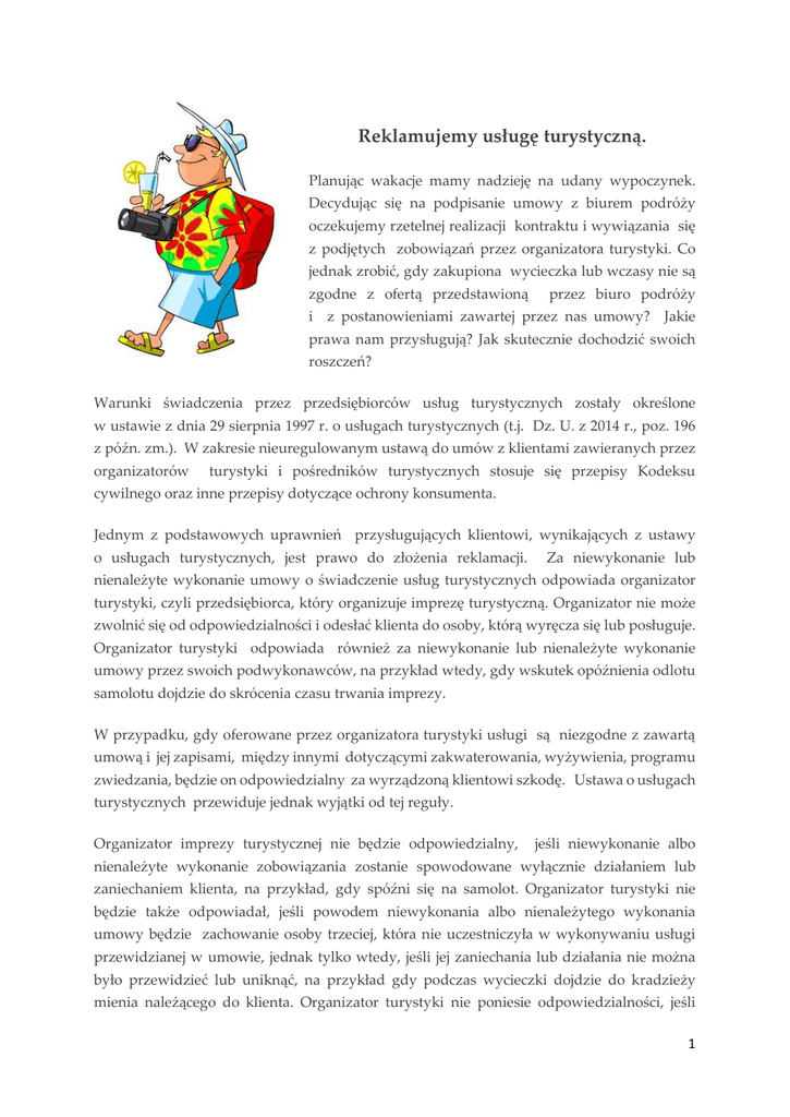 Reklamujemy usługę turystyczną. Planując wakacje mamy nadzieję na udany wypoczynek. Decydując się na podpisanie umowy z biurem podróży oczekujemy rzetelnej realizacji kontraktu i wywiązania się z podjętych zobowiązań przez organizatora turystyki. Co jednak zrobić, gdy zakupiona wycieczka lub wczasy nie są zgodne z ofertą przedstawioną przez biuro podróży i z postanowieniami zawartej przez nas umowy? Jakie prawa nam przysługują? Jak skutecznie dochodzić swoich roszczeń? Warunki świadczenia przez przedsiębiorców usług turystycznych zostały określone w ustawie z dnia 29 sierpnia 1997 r. o usługach turystycznych (t.j. Dz. U. z 2014 r., poz. 196 z późn. zm.). W zakresie nieuregulowanym ustawą do umów z klientami zawieranych przez organizatorów turystyki i pośredników turystycznych stosuje się przepisy Kodeksu cywilnego oraz inne przepisy dotyczące ochrony konsumenta. Jednym z podstawowych uprawnień przysługujących klientowi, wynikających z ustawy o usługach turystycznych, jest prawo do złożenia reklamacji. Za niewykonanie lub nienależyte wykonanie umowy o świadczenie usług turystycznych odpowiada organizator turystyki, czyli przedsiębiorca, który organizuje imprezę turystyczną. Organizator nie może zwolnić się od odpowiedzialności i odesłać klienta do osoby, którą wyręcza się lub posługuje. Organizator turystyki odpowiada również za niewykonanie lub nienależyte wykonanie umowy przez swoich podwykonawców, na przykład wtedy, gdy wskutek opóźnienia odlotu samolotu dojdzie do skrócenia czasu trwania imprezy. W przypadku, gdy oferowane przez organizatora turystyki usługi są niezgodne z zawartą umową i jej zapisami, między innymi dotyczącymi zakwaterowania, wyżywienia, programu zwiedzania, będzie on odpowiedzialny za wyrządzoną klientowi szkodę. Ustawa o usługach turystycznych przewiduje jednak wyjątki od tej reguły. Organizator imprezy turystycznej nie będzie odpowiedzialny, jeśli niewykonanie albo nienależyte wykonanie zobowiązania zostanie spowodowane wyłącznie działaniem lub zaniechaniem klienta, na przykład, gdy spóźni się na samolot. Organizator turystyki nie będzie także odpowiadał, jeśli powodem niewykonania albo nienależytego wykonania umowy będzie zachowanie osoby trzeciej, która nie uczestniczyła w wykonywaniu usługi przewidzianej w umowie, jednak tylko wtedy, jeśli jej zaniechania lub działania nie można było przewidzieć lub uniknąć, na przykład gdy podczas wycieczki dojdzie do kradzieży mienia należącego do klienta. Organizator turystyki nie poniesie odpowiedzialności, jeśli 1 powodem niewykonania albo nienależytego wykonania umowy będzie tzw. siła wyższa, czyli działanie zewnętrzne niemożliwe do przewidzenia, na przykład: złe warunki atmosferyczne, które trudno było przewidzieć - wybuch wulkanu, który zanieczyścił atmosferę pyłem i zablokował możliwość przelotu nad określonym rejonem, huragan lub powódź. Podkreślić należy jednak, że wyłączenie odpowiedzialności w związku z zaistnieniem wyżej wskazanych sytuacji nie zwolni organizatora z obowiązku udzielenia w czasie trwania imprezy pomocy klientowi. Ponadto w przypadku złożonej reklamacji, to organizator imprezy turystycznej powinien wykazać, że zaszła okoliczność, która wyłącza jego odpowiedzialność. Klient może złożyć reklamację również w sytuacji, gdy w czasie trwania imprezy turystycznej organizator nie wykonuje przewidzianych w umowie usług stanowiących istotną część programu, a w zamian proponuje tzw. świadczenie zastępcze. Zgodnie z ustawą o usługach turystycznych, gdy jakość świadczenia zastępczego jest niższa od jakości usługi określonej w programie imprezy turystycznej, na przykład gdy zamiast w hotelu pięciogwiazdkowym klient zostanie zakwaterowany w hotelu czterogwiazdkowym, będzie on uprawniony do żądania obniżenia ceny. Innym uprawnieniem klienta w takiej sytuacji jest odstąpienie od umowy z żądaniem, aby organizator zapewnił mu powrót na miejsce rozpoczęcia imprezy lub do innego uzgodnionego miejsca oraz z żądaniem naprawienia szkody wynikłej z niewykonania umowy. Terminy składania reklamacji oraz terminy ich rozpatrzenia przez organizatora turystyki zostały wyraźnie wskazane w ustawie o usługach turystycznych. Jeżeli w trakcie imprezy turystycznej klient stwierdza wadliwe wykonywanie umowy, to powinien o tym niezwłocznie zawiadomić wykonawcę usługi oraz organizatora turystyki, w sposób odpowiedni dla rodzaju usługi. Podkreślić należy, że w umowie powinien być zamieszczony jednoznaczny zapis przypominający klientowi o tym obowiązku. Niezależnie od zawiadomienia, klient może złożyć do organizatora turystyki reklamację. W reklamacji należy wskazać uchybienia w sposobie wykonania umowy oraz żądanie. Klient może złożyć reklamację w terminie nie dłuższym niż 30 dni od zakończenia imprezy turystycznej. W przypadku odmowy uwzględnienia reklamacji, organizator imprezy ma obowiązek szczegółowego uzasadnienia na piśmie jej przyczyny. Jeśli reklamacja zostanie złożona przez klienta w trakcie imprezy, to organizator jest zobowiązany pisemnie się do niej ustosunkować w ciągu 30 dni od zakończenia imprezy. Jeśli nie wywiąże się z tego obowiązku w ciągu 30 dni, to uważa się, że uznał reklamację za uzasadnioną. Gdy reklamacja zostanie zgłoszona po zakończeniu wyjazdu, to organizator ma na ustosunkowanie się do niej 30 dni od daty złożenia. Również w przypadku braku wywiązania się przez organizatora imprezy z tego obowiązku w terminie 30 dni, uważa się, że uznał reklamację za zasadną. Ewentualne odmienne w tym zakresie zapisy w umowach o świadczenie usług turystycznych, na przykład, że niezłożenie przez klienta reklamacji w ciągu 14 dni spowoduje wygaśnięcie 2 jego roszczeń, należy traktować jak niedozwolone postanowienia umowne, które nie wią