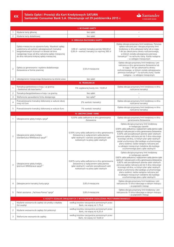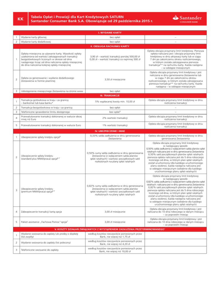 KK Tabela Opłat i Prowizji dla Kart Kredytowych SATURN Santander Consumer Bank S.A. Obowiązuje od 29 października 2015 r. I. WYDANIE KARTY 1 Wydanie karty głównej bez opłat – 2 Wydanie karty dodatkowej bez opłat – II. OBSŁUGA RACHUNKU KARTY 1 Opłata miesięczna za używanie karty. Wysokość opłaty uzależniona od wartości zaksięgowanych transakcji bezgotówkowych liczonych w okresie od dnia następnego licząc od dnia naliczenia opłaty miesięcznej do dnia naliczenia kolejnej opłaty miesięcznej 2 Opłata za generowanie i wysłanie dodatkowego Zestawienia w formie pisemnej 3 Udostępnienie miesięcznego Zestawienia na stronie www 1 Transakcja gotówkowa w kraju i za granicą – bankomat lub kasa banku* 3,90 zł – wartość transakcji poniżej 500,00 zł 0,00 zł – wartość transakcji co najmniej 500 zł 3,50 zł miesięcznie Opłata obciąża przyznany limit kredytowy. Pierwsza opłata naliczana jest i obciąża przyznany limit kredytowy w dniu aktywacji karty lub w ciągu 7 dni po zakończeniu okresu rozliczeniowego, w którym została zaksięgowana pierwsza transakcja** na rachunku karty. Każda następna – w odstępie miesięcznym Opłata obciąża przyznany limit kredytowy i jest naliczana w dniu generowania Zestawienia lub w ciągu 7 dni po zakończeniu okresu rozliczeniowego, w którym została zaksięgowana pierwsza transakcja** na rachunku karty. Każda następna – w odstępie miesięcznym bez opłat III. TRANSAKCJE 5% wypłacanej kwoty min. 10,00 zł Opłata obciąża przyznany limit kredytowy w dniu rozliczenia transakcji – 2 Transakcja bezgotówkowa w kraju i za granicą bez opłat 3 Telefoniczne sprawdzenie limitu dostępnego bez opłat5 – 4 Przewalutowanie transakcji dokonanej w walucie obcej innej niż Euro 2% wartości transakcji Opłata obciąża przyznany limit kredytowy w dniu rozliczenia transakcji 5 Przewalutowanie transakcji dokonanej w walucie Euro 1% wartości transakcji Opłata obciąża przyznany limit kredytowy w dniu rozliczenia transakcji IV. UBEZPIECZENIE I INNE 1 2 Ubezpieczenie spłaty kredytu opcja8 Ubezpieczenie spłaty kredytu (standard plus NNW/praca) opcja8 7 0,33% salda zadłużenia w dniu generowania Zestawienia Opłata obciąża przyznany limit kredytowy w dniu generowania Zestawienia 0,50% sumy salda zadłużenia w dniu generowania Zestawienia (z wyłączeniem salda planów spłat ratalnych) i wartości początkowych sald rozłożonych na plany spłat ratalnych Opłata obciąża przyznany limit kredytowy w następujący sposób: 0,50% salda zadłużenia z wyłączeniem salda planów spłat ratalnych naliczana jest w dniu generowania Zestawienia 0,50% sald początkowych planów spłat ratalnych: pierwsza opłata naliczana jest do 5 dnia roboczego liczonego od dnia, w którym plan spłat ratalnych został uruchomiony (dla każdego uruchomionego planu osobno), każda następna naliczana jest w odstępie miesięcznym (odrębnie dla każdego uruchomionego planu spłat ratalnych) 0,82% sumy salda zadłużenia w dniu generowania Zestawienia (z wyłączeniem salda planów spłat ratalnych) i wartości początkowych sald rozłożonych na plany spłat ratalnych Opłata obciąża przyznany limit kredytowy w następujący sposób: 0,82% salda zadłużenia z wyłączeniem salda planów spłat ratalnych: naliczana jest w dniu generowania Zestawienia 0,82% sald początkowych planów spłat ratalnych: pierwsza opłata naliczana jest do 5 dnia roboczego liczonego od dnia, w którym plan spłat ratalnych został uruchomiony (dla każdego uruchomionego planu osobno), każda następna naliczana jest w odstępie miesięcznym (odrębnie dla każdego uruchomionego planu spłat ratalnych) 3 Ubezpieczenie spłaty kredytu (premium NNW/praca) opcja8 7 4 Zabezpieczenie transakcji kartą opcja 3,00 zł miesięcznie Opłata obciąża przyznany limit kredytowy i jest naliczana do 10 dnia roboczego w danym miesiącu – za poprzedni miesiąc 5 Pakiet assistance „Fachowa Pomoc”opcja7 3,00 zł miesięcznie Opłata obciąża przyznany limit kredytowy i jest naliczana do 10 dnia roboczego w danym miesiącu – za poprzedni miesiąc V. KOSZTY DZIAŁAŃ ZWIĄZANYCH Z WYSTĄPIENIEM ZADŁUŻENIA PRZETERMINOWANEGO1 1 Wysłanie wezwania do zapłaty lub prośby o dopłatę (list zwykły) według kosztów rzeczywiście poniesionych przez Bank, nie więcej niż 1,75 zł 2 Wysłanie wezwania do zapłaty (list polecony) według kosztów rzeczywiście poniesionych przez Bank, nie więcej niż 4,20 zł 3 Telefoniczne wezwanie do zapłaty według kosztów rzeczywiście poniesionych przez Bank, nie więcej niż 10,00 zł KK Tabela Opłat i Prowizji dla Kart Kredytowych SATURN Santander Consumer Bank S.A. Obowiązuje od 29 października 2015 r. Działania wykonane przez firmę windykacyjną na zlecenie Banku, polegające na kierowaniu do POSIADACZA KARTY wezwań do zapłaty w formie pisemnej lub telefonicznej Według kosztów rzeczywiście poniesionych przez Bank w danym miesiącu kalendarzowym, w związku z działaniami firmy windykacyjnej, nie więcej niż: 9,00 zł za personalizację oraz wysłanie wezwania do zapłaty listem zwykłym 19,00 zł za telefoniczne wezwanie do zapłaty Limit kosztów za działania firmy windykacyjnej wynosi 50,00 zł w miesiącu kalendarzowym. Bank nie obciąży POSIADACZA KARTY kwotą stanowiącą różnicę pomiędzy kwotą rzeczywiście poniesionych kosztów a kwotą w/w limitu2 5 Działania wykonane przez firmę windykacyjną polegające na kierowaniu do POSIADACZA KARTY wezwań do zapłaty w drodze wizyty terenowej Według kosztów rzeczywiście poniesionych przez Bank w danym miesiącu kalendarzowym, w związku z działaniami firmy windykacyjnej nie więcej niż 140,00 zł za wykonaną wizytę terenową3 Limit kosztów za działania firmy windykacyjnej wynosi 140 zł w miesiącu kalendarzowym. Bank nie obciąży POSIADACZA KARTY kwotą stanowiącą różnicę pomiędzy kwotą rzeczywiście poniesionych kosztów a kwotą w/w l