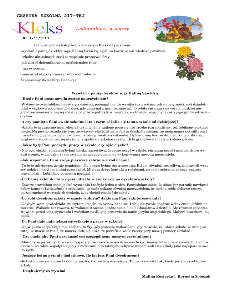 GAZETKA SZKOLNA 217—TEJ Listopadowy, jesienny... Nr 1/11/2013 I oto już połowa listopada, a w naszym Kleksie tym razem: -wywiad z panią dyrektor mgr Haliną Sawicką, czyli, co każdy uczeń wiedzieć powinien, -szkolne aktualności, czyli co wspólnie przeżywaliśmy, -jak zostać dziennikarzem, profesjonalne rady, - nasza poezja, -inne artykuły, czyli nasza twórczość radosna. Zapraszamy do lektury- Redakcja Wywiad z panią dyrektor mgr Haliną Sawicką: - Kiedy Pani postanowiła zostać nauczycielem? -W dzieciństwie lubiłam bawić się z dziećmi, pomagać im. To wynika też z rodzinnych umiejętności, mój dziadek miał wyjątkowe podejście do dzieci, gdy zaczynał z nimi rozmawiać, to robiła się cisza i nawet najbardziej niegrzeczne ananasy z naszej rodziny po prostu patrzyły w niego jak w obrazek, więc chyba coś z jego genów odziedziczyłam -A czy pamięta Pani swoje szkolne lata i czym różniła się tamta szkoła od dzisiejszej? -Szkoła była zupełnie inna, chociaż też mieliśmy szalone pomysły, też trochę rozrabialiśmy, też lubiliśmy ciekawe lekcje. Na pewno różniła się tym, że wszyscy chodziliśmy w fartuszkach. Pamiętam, że moja mama potrafiła szyć i uszyła mi (chyba już byłam w liceum) taką granatową sukienkę. Byłam z niej bardzo dumna, bo była śliczna, wyglądała zupełnie inaczej niż inne, a spełniała szkolne zasady. Była granatowa z białym kołnierzykiem. -Jakie były Pani początki pracy w szkole, czy było ciężko? -Nie było ciężko, ponieważ byłam bardzo szczęśliwa, że mogę uczyć w szkole, chciałam uczyć i miałam dobre wykształcenie, w związku z tym czułam się przygotowana do wykonywania zawodu nauczyciela. -Jak wspomina Pani swoje pierwsze zebranie z rodzicami? -To było tak dawno, że nie pamiętam. Na pewno byłam zestresowana. Byłam również szczęśliwa, że przyszli wszyscy rodzice i mogłam z nimi rozmawiać. Miałam dobry kontakt z rodzicami, na moje zebrania zawsze wszyscy przychodzili. Lubiliśmy po prostu pogadać. . -Co Panią skłoniło do wzięcia udziału w konkursie na dyrektora szkoły? -Zawsze stawiałam sobie jakieś wyzwania i to było jedno z nich. Pomyślałam sobie, że skoro już potrafię nawiązać dobry kontakt i z dziećmi i z rodzicami, to może pokażę również nauczycielom, że można robić ciekawe rzeczy, można zachęcić wszystkich dookoła, żeby chcieli chodzić do szkoły -Co robi dyrektor szkoły w czasie wolnym? Jakie ma Pani zainteresowania? -Gdybym wam powiedziała, że czytam książki, to byłoby banalne. Lubię aktywnie spędzać wolny czas i jeździć na rowerze. Wakacje bez roweru, to wakacje stracone, jeżdżę około 30-40 kilometrów dziennie. Ale również cały czas stawiam przed sobą wyzwania i wróciłam po długiej przerwie do nauki języka angielskiego. Małymi kroczkami się udaje. -Co Pani daje największą satysfakcję z pracy w szkole? -Największa satysfakcja moi kochani to Wy, gdy jesteście zadowoleni, gdy mówicie, że lubicie szkołę, że miło jest tutaj, że macie co robić, że nauczyliście się dużo, że potraficie wiele rzeczy przy naszej pomocy zdziałać. - Czy chciałaby Pani przekazać coś szczególnego naszym czytelnikom? -Może to, że jesteśmy do waszej dyspozycji, że zawsze możecie na nas liczyć, mówię tutaj o nauczycielach, ale i rodzicach, bo także współpracujemy z rodzicami i chciałabym, żebyście wspominali lata szkoły jako najlepsze w swoim życiu -Jeszcze jedno pytanie dodatkowe. Ile lat jest Pani dyrektorem? -Kobietom nie zadaje się takich pytań, ha, ha, żartuję oczywiście. To już trzynasty rok, kiedy jestem dyrektorem szkoły. -Dziękujemy za wywiad. Malina Kostecka i Kornelia Sobczak Działo się w naszej szkole... Z radością zawiadamiamy, że znaleźliśmy się w szczęśliwej 150 szkół, biorących aktywny udział w programie „WF z klasą”, do którego zapraszamy wszystkich naszych Uczniów, Nauczycieli i Rodziców. Koordynatorem programu jest p.Andrzej Chomiuk, zespołem wspomagającym pozostali nauczyciele WF-u naszej szkoły, a w gronie ekspertów znalazła się p.Lucyna Milewska-Moneta. Program jest realizowany dzięki wsparciu finansowemu Ministerstwa Sportu i Turystyki, pod honorowym patronatem Minister Sportu i Turystyki oraz Minister Edukacji Narodowej. Więcej wiadomości znajdziecie na stronie internetowej szkoły w zakładce SPORT. Zapraszamy do czytania. *** 18 października pierwszoklasiści byli pasowani na pełnoprawnych uczniów naszej szkoły. Ślubowali sumiennie wypełniać swoje obowiązki, uczyć się pilnie, być dobrymi kolegami, dbać o honor szkoły i ojczyzny. Życzymy sukcesów w nauce!! *** W sobotę 9 listopada reprezentacja uczniów naszej szkoły miała przyjemność gościć w Pałacu Prezydenckim. Uczniowie z całej Polski i słynni sportowcy w towarzystwie pary prezydenckiej szykowali biało-czerwone kotyliony na uroczystości związane ze Świętem Niepodległości. Nasza delegacja nie tylko świetnie pracowała, ale udzielała wywiadów dla TV, zbierała autografy od znakomitych gości i pozowała do zdjęć z Panem Prezydentem i Pierwszą Damą. Na koniec goście zostali zaproszeni na poczęstunek w ogrodzie zimowym, gdzie największym powodzeniem cieszył się ogromny i pyszny tort oczywiście w barwach narodowych. Galerię zdjęć można obejrzeć na stronie internetowej szkoły. *** Jak co roku uczestniczyliśmy w akcji charytatywnej "Pola Nadziei". Dzięki życzliwości rodziców i uczniów naszej szkoły zebraliśmy 713,39 złotych. Zgromadzone fundusze wesprą Hospicjum Domowe przy ul. Tykocińskiej w Warszawie. *** 13 listopada odbyły się mistrzostwa dzielnicy Rembertów w „Od zabawy do sportu”. Wspaniały doping kibiców oraz cudowna walka ze strony uczniów sprawiły, że zajęliśmy I miejsce i awansowaliśmy do półfinałów warszawskich , które odbędą się 28 listopada w hali sportowej na "Kole". BRAWO!!! *** 15 listopada