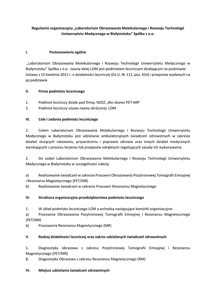 Regulamin organizacyjny „Laboratorium Obrazowania Molekularnego i Rozwoju Technologii Uniwersytetu Medycznego w Białymstoku” Spółka z o.o. I. Postanowienia ogólne „Laboratorium Obrazowania Molekularnego i Rozwoju Technologii Uniwersytetu Medycznego w Białymstoku” Spółka z o.o. zwany dalej LOM jest podmiotem leczniczym działającym na podstawie: Ustawy z 15 kwietnia 2011 r. o działalności leczniczej (Dz.U. Nr 112, poz. 654) i przepisów wydanych na jej podstawie II. Firma podmiotu leczniczego 1. 2. Podmiot leczniczy działa pod firmą: NZOZ „Bio-skaner PET-MR” Podmiot leczniczy używa nazwy skróconej: LOM III. Cele i zadania podmiotu leczniczego 1. Celem Laboratorium Obrazowania Molekularnego i Rozwoju Technologii Uniwersytetu Medycznego w Białymstoku jest udzielanie ambulatoryjnych świadczeń zdrowotnych w zakresie działań służących ratowaniu, przywróceniu i poprawie zdrowia oraz innych działań medycznych wynikających z procesu leczeniu lub przepisów odrębnych regulujących zasady ich wykonywania. 2. Do zadań Laboratorium Obrazowania Molekularnego i Rozwoju Technologii Uniwersytetu Medycznego w Białymstoku w szczególności należą: a) Realizowanie świadczeń w zakresie Pracowni Obrazowania Pozytronowej Tomografii Emisyjnej i Rezonansu Magnetycznego (PET/MR) b) Realizowanie świadczeń w zakresie Pracowni Rezonansu Magnetycznego IV. Struktura organizacyjna przedsiębiorstwa podmiotu leczniczego 1. W skład podmiotu leczniczego LOM a wchodzą następujące komórki organizacyjne: a) Pracownia Obrazowania Pozytronowej Tomografii Emisyjnej i Rezonansu Magnetycznego (PET/MR) b) Pracowania Rezonansu Magnetycznego (MR) V. Rodzaj działalności leczniczej oraz zakres udzielanych świadczeń zdrowotnych 1. Diagnostyka obrazowa z zakresu Pozytronowej Tomografii Emisyjnej i Rezonansu Magnetycznego (PET/MR) 2. Diagnostyka Obrazowa z zakresu Rezonansu Magnetycznego (RM) VI. Miejsce udzielania świadczeń zdrowotnych Siedzibą Laboratorium Obrazowania Molekularnego i Rozwoju Technologii Uniwersytetu Medycznego w Białymstoku jest budynek na terenie Białostockiego Parku Naukowo-Technologicznego, przy ul. Żurawiej 71A, 15-540 Białystok VII. Przebieg procesu udzielania świadczeń zdrowotnych w jednostkach i komórkach i organizacyjnych podmiotu leczniczego 1. Świadczenia zdrowotne udzielane są wyłącznie przez pracowników medycznych, który posiadają odpowiednie kwalifikacje do wykonywania świadczeń, potwierdzone dyplomami, certyfikatami i spełniających odpowiednie wymagania zdrowotne. 2. Rejestracji na badanie obrazowe PET/MR i/lub MR można dokonać: 1/ w sposób bezpośredni w Rejestracji placówki, 2/ poprzez kontakt telefoniczny – nr telefonu 85 686 5094 lub 737 48 00 41, 3/ drogą e-mailową przesyłając mailem zgłoszenie wraz ze skanem skierowania i danymi kontaktowymi na adres: [email protected] 3. Proces udzielania świadczeń zdrowotnych rozpoczyna się w Rejestracji, gdzie pacjenci zgłaszają się w celu umówienia wizyty u lekarza i/lub wykonania badania diagnostycznego PET/MR i/lub MR 4. W Rejestracji pacjent zobowiązany jest okazać: - skierowanie od lekarza - dokument tożsamości, PESEL - adres i numer telefonu kontaktowego 5. W pierwszej kolejności przyjmowani są pacjenci zgłaszający się w stanie wymagającym natychmiastowego udzielenia świadczenia zdrowotnego. 6. Po wcześniejszym ustaleniu terminu wizyty lekarskiej (kwalifikacyjnej) lub badania obrazowego (PET/MR lub MR) pacjent w umówionym dniu i o określonej godzinie zgłasza się do Rejestracji 7. Po zarejestrowaniu się pacjent wypełnia ankietę „Ankieta pacjenta przed badaniem rezonansu magnetycznego” i zapoznaje się z informacją na temat badania pt.: „Instrukcja postępowania pacjenta po badaniu” 8. Po wypełnieniu ankiety i zapoznaniu się z instrukcją pacjent przechodzi do Gabinetu Lekarskiego, w którym odbywa się badanie lekarskie i kwalifikacja do badania obrazowego. Lekarz może skierować pacjenta na badania w pokoju prób wysiłkowych 9. Pacjent, który nie przejdzie pozytywnie kwalifikacji lekarskiej do badania opuszcza obiekt 10. Pacjent zakwalifikowany do badania obrazowego PET/MR kierowany jest do pomieszczenia szatni zimnej pacjenta, gdzie na rzeczy osobiste otrzymuje mobilną zamykana kodem szafkę. Następnie przechodzi wraz z personelem do Gabinetu Aplikacji, personel przewozi przyznaną pacjentowi szafkę mobilną do szatni gorącej. W Gabinecie Aplikacji pacjent ma oznaczany poziom glikemii z krwi włośniczkowej, a następnie ma podawany znacznik izotopowy, po czym przechodzi lub jest przewożony na wózku do Pomieszczenia – Poczekalni „Gorącej”. 11. Dzięki kamerom przemysłowym i instalacji przyzywowej jest pod stałą obserwacją i kontrolą personelu medycznego. Po określonym czasie oczekiwania zgodnym z procedurą znacznika pacjent przechodzi do pomieszczenia z urządzeniem „Biograph mMR”, gdzie technik pod nadzorem lekarza wykonuje procedurę diagnostyczną PET/MR. W sterowni przebywa pracownik obsługujący urządzenie i obserwujący pacjenta. Po badaniu pacjent przechodzi do pomieszczenia wypoczynkowego, które opuszcza po określonym procedurą badania czasie kwarantanny. 12. Pacjent zakwalifikowany do badania obrazowego MR, po uprzednim pozostawieniu części garderoby zawierającej element metalowe i rzeczy osobistych w szafce w szatni gorącej przechodzi na badanie do pomieszczenia z urządzeniem „Biograph mMR”, gdzie technik pod nadzorem lekarza wykonuje procedurę diagnostyczną MR. 13. W trakcie udzielania świadczenia zdrowotnego pacjent ma prawo do uzyskania niezbędnych wyjaśnień, dotyczących postawionej diagnozy. 14. Na każdym etapie udzielania świadczenia zdrowotnego pacjent ma prawo do złożenia skargi/zażalenia na zachowanie lub czynności personelu LOM Skargi/zażalenia przyjmuje codziennie w godzinach 16.00-17.00 Koordynator: Dorota Jurgilewicz tel. 795 11 32 43 15. Skarga/zażalenie m