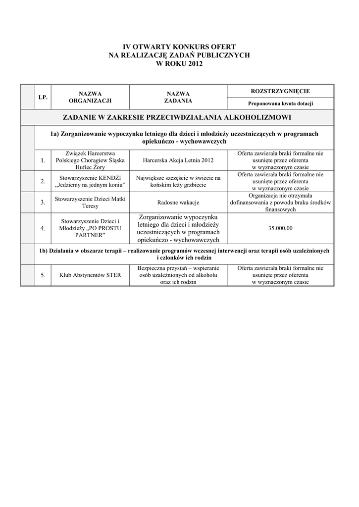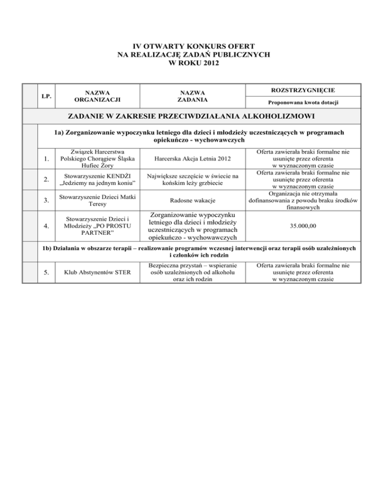 IV OTWARTY KONKURS OFERT NA REALIZACJĘ ZADAŃ PUBLICZNYCH W ROKU 2012 LP. NAZWA ORGANIZACJI NAZWA ZADANIA ROZSTRZYGNIĘCIE Proponowana kwota dotacji ZADANIE W ZAKRESIE PRZECIWDZIAŁANIA ALKOHOLIZMOWI 1a) Zorganizowanie wypoczynku letniego dla dzieci i młodzieży uczestniczących w programach opiekuńczo - wychowawczych 1. Związek Harcerstwa Polskiego Chorągiew Śląska Hufiec Żory Harcerska Akcja Letnia 2012 2. Stowarzyszenie KENDŻI „Jedziemy na jednym koniu” Największe szczęście w świecie na końskim leży grzbiecie 3. Stowarzyszenie Dzieci Matki Teresy Radosne wakacje 4. Stowarzyszenie Dzieci i Młodzieży „PO PROSTU PARTNER” Zorganizowanie wypoczynku letniego dla dzieci i młodzieży uczestniczących w programach opiekuńczo - wychowawczych Oferta zawierała braki formalne nie usunięte przez oferenta w wyznaczonym czasie Oferta zawierała braki formalne nie usunięte przez oferenta w wyznaczonym czasie Organizacja nie otrzymała dofinansowania z powodu braku środków finansowych 35.000,00 1b) Działania w obszarze terapii – realizowanie programów wczesnej interwencji oraz terapii osób uzależnionych i członków ich rodzin 5. Klub Abstynentów STER Bezpieczna przystań – wspieranie osób uzależnionych od alkoholu oraz ich rodzin Oferta zawierała braki formalne nie usunięte przez oferenta w wyznaczonym czasie