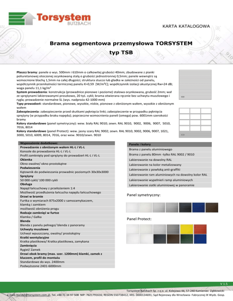 KARTA KATALOGOWA Brama segmentowa przemysłowa TORSYSTEM typ TSB Płaszcz bramy: panele o wys. 500mm i 610mm o całkowitej grubości 40mm; zbudowane z pianki poliuretanowej otoczonej ocynkowaną stalą o grubości jednostronnej 0,5mm; panele wewnątrz są wzmocnione blachą 1,5mm na całej długości; struktura stucco lub gładka w zależności od panelu, współczynnik przenikalności termicznej panelu K≈0,59 [W/m²C]; współczynnik izolacji akustycznej Rw≈24 dB; waga panelu 11,1 kg/m² System prowadzenia: konstrukcja (prowadnice pionowe i poziome) stalowa ocynkowana, grubość 2mm; wał ze sprężynami lakierowanymi proszkowo, 20 tyś. cykli; brama otwierana ręcznie bez uchwytu muszlowego i rygla; prowadzenie normalne SL (wys. nadproża 42-1000 mm) Typy prowadzeń: standardowe, pionowe, wysokie, niskie, pionowe z obniżonym wałem, wysokie z obniżonym wałem Zabezpieczenia: zabezpieczenie przed skutkami pęknięcia linki; zabezpieczenie w przypadku pęknięcia sprężyny (w przypadku braku napędu); poprzeczne wzmocnienia paneli (omega) pow. 6001mm szerokości bramy Kolory standardowe (panel symetryczny): wew. biały RAL 9010; zewn. RAL 9010, 9002, 9006, 9007, 5010, 7016, 8014 Kolory standardowe (panel Protect): wew. jasny szary RAL 9002; zewn. RAL 9010, 9002, 9006, 9007, 1021, 3000, 5010, 6009, 8014, 7016, oraz wew. 9010/zewn. 9010 Wyposażenie dodatkowe: Prowadzenie z obniżonym wałem HL-L i VL-L Konsole do prowadzenia HL-L i VL-L Profil zamknięty pod sprężyny do prowadzeń HL-L i VL-L Okienka Okno owalne/ okno prostokątne Podwieszenia Kątownik do podwieszania prowadnic poziomych 30x30x3000 Sprężyny 50 000 cykli/ 100 000 cykli Obsługa Napęd łańcuchowy z przełożeniem 1:4 Możliwość przedłużenia łańcucha napędu łańcuchowego Drzwi w bramie Furtka o wymiarach 875x2000 z samozamykaczem, klamką i zamkiem możliwość obniżenia progu Rodzaje zamknięć w furtce Klamka / Gałka Blenda Blenda z panelu pełnego/ blenda z panoramy Uchwyty muszlowe Uchwyt wpuszczany, owalny/ prostokątny Kratki wentylacyjne Kratka plastikowa/ Kratka plastikowa, zamykana Zamknięcia Rygiel/ Zamek Drzwi obok bramy (max. szer. 1200mm) klamki, zamek z kluczem, profil do montażu Standardowe do wys. 2400mm Podwyższone 2401-6000mm Panele i kolory Brama z panelu aluminiowego Brama z panelu 80mm -tylko RAL 9002 / 9010 Lakierowanie na dowolny RAL Lakierowanie na kolor metalizowany Lakierowanie z powłoką anti-graffiti Lakierowanie ram aluminiowych na dowolny kolor RAL Lakierowanie wypełnień ramp aluminiowych Lakierowanie siatki aluminiowej w panoramie Panel symetryczny: Panel Protect: V 1.5 Torsystem Butzbach Sp. z o.o. ul. Kolejowa 44, 57-240 Kamieniec Ząbkowicki V 1.0 e-mail: [email protected], Tel. +48 71 34 97 508 NIP: 7621791616; REGON:550738412; KRS: 0000134691; Sąd Rejonowy dla Wrocławia- Fabrycznej IX Wydz. Gosp.