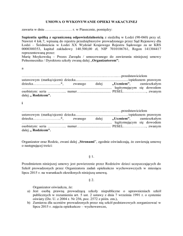 UMOWA O WYKONYWANIE OPIEKI WAKACYJNEJ zawarta w dniu ………….……… r. w Piasecznie, pomiędzy: Sapientia spółką z ograniczoną odpowiedzialnością z siedzibą w Łodzi (90-060) przy ul. Nawrot 4 lok.7, wpisaną do rejestru przedsiębiorców prowadzonego przez Sąd Rejonowy dla Łodzi – Śródmieścia w Łodzi XX Wydział Krajowego Rejestru Sądowego za nr KRS 0000300353, kapitał zakładowy 140.500,00 zł, NIP 7010106761, Regon 141304417 reprezentowaną przez: Marię Moykowską – Prezes Zarządu / umocowanego do zawierania niniejszej umowy Pełnomocnika / Dyrektora szkoły zwaną dalej „Organizatorem”; a …………………………………………………………..………..…przedstawicielem ustawowym (matką/ojcem) dziecka........................................................./opiekunem prawnym dziecka…………………..*, zwanego dalej „Uczniem”, zamieszkałym .................................................................................................. legitymującym się dowodem osobistym: seria ………….... numer…................................. PESEL………………., zwanym dalej „ Rodzicem”. i …………………………………………………………..………..…przedstawicielem ustawowym (matką/ojcem) dziecka........................................................./opiekunem prawnym dziecka…………………..*, zwanego dalej „Uczniem”, zamieszkałym .................................................................................................. legitymującym się dowodem osobistym: seria ………….... numer…................................. PESEL………………., zwanym dalej „ Rodzicem”. Organizator oraz Rodzic, zwani dalej „Stronami”, zgodnie oświadczają, że zawierają umowę o następującej treści: § 1. Przedmiotem niniejszej umowy jest powierzenie przez Rodziców dzieci uczęszczających do Szkół prowadzonych przez Organizatora zadań opiekuńczo wychowawczych w miesiącu lipcu 2015 r. na warunkach określonych niniejszą umową. § 2. Organizator oświadcza, że: a) Jest osobą prawną prowadzącą szkoły niepubliczne o uprawnieniach szkół publicznych w rozumieniu art. 5 ust. 2 ustawy z dnia 7 września 1991 r. o systemie oświaty (Dz. U. z 2004 r. Nr 256, poz. 2572 z późn. zm.), b) Zamierza dla uczniów prowadzonych przez nią szkół podstawowych zorganizować w lipcu 2015 r. zajęcia opiekuńczo – wychowawcze, § 3. Rodzic oświadcza/ - ją, że: a) przysługuje mu władza rodzicielska wobec/jest prawnym opiekunem Ucznia i jest uprawniony do zawarcia niniejszej umowy, b) działa za zgodą i w porozumieniu z pozostałymi przedstawicielami ustawowymi Ucznia, c) zawierając niniejszą umowę ma zamiar powierzyć opiekę nad Uczniem w miesiącu lipcu 2015 r. Organizatorowi na zasadach określonych niniejszą umową. § 4. 1. Na mocy niniejszej umowy Rodzic zleca a Organizator przyjmuje zlecenie świadczenia na rzecz Ucznia usług wychowawczo - opiekuńczych w okresie wskazanym w Zgłoszeniu, stanowiącym załącznik nr 1 do niniejszej umowy. 2. Organizator zobowiązany jest do wykonywania niniejszej umowy z należytą starannością i najwyższą dbałością o dobro Ucznia. § 5. Organizator oświadcza, że w ramach niniejszej umowy zobowiązuje się do: a) zapewnienia organizacji zajęć opiekuńczo – wychowawczych Ucznia o okresie wskazanym w Zgłoszeniu w dni powszednie w godzinach od 8.00 – 18.00. Zajęcia opiekuńczo – wychowawcze będą odbywały się w budynku Organizatora w Jazgarzewszczyźnie, przy ul. Okrężnej 25A; b) zapewnienia wykwalifikowanej kadry nauczycielskiej sprawującej pieczę w trakcie pobytu Ucznia na zajęciach opiekuńczo – wychowawczych; c) zapewnienia Uczniowi wyżywienia w postaci codziennego obiadu oraz podwieczorku; d) zawarcia umowy ubezpieczenia Ucznia od następstw nieszczęśliwych wypadków mogących wystąpić w trakcie organizacji zajęć opiekuńczo – wychowawczych. § 6. a) b) c) d) Rodzic zobowiązuje się do: wyposażenia ucznia w stroje sportowe jak również materiały pomocnicze, zgodnie z planem zajęć opiekuńczo – wychowawczych oraz wytycznymi nauczycieli sprawujących opiekę i imieniu organizatora, poniesienia odpowiedzialności materialnej za szkody wyrządzone przez ucznia, przestrzegania warunków niniejszej umowy, a w szczególności wnoszenia w terminie opłat, ustalonych niniejszą umową, udzielania informacji o stanie zdrowia Ucznia, mogących mieć wpływ na bezpieczeństwo Ucznia i innych uczniów w Szkole, . § 7. 1. Usługi opiekuńczo – wychowawcze, o których mowa w niniejszej umowie będą świadczone przez Organizatora w ramach opłat czesnego uiszczanego przez Rodzica 2. 3. 4. 5. 6. 7. 8. 9. w związku powierzeniem kształcenia dziecka w szkołach Organizatora z zastrzeżeniem ustępów poniższych niniejszego paragrafu. Warunkiem przyjęcia dziecka na zajęcia opiekuńczo – wychowawcze, o których mowa w niniejszej umowie, jest brak zaległości Rodzica w opłacie czesnego. Rodzic jest zobowiązany jednak do pokrycia kosztów posiłków, transportu na ww. zajęcia oraz z powrotem, wycieczek oraz ubezpieczenia. W związku z koniecznością podjęcia przez Organizatora zobowiązań związanych z zapewnieniem kadry, Rodzic zobowiązany jest do uiszczenia kaucji w wysokości 300 zł za korzystanie z opieki za każdy zadeklarowany tydzień sprawowania opieki. Uiszczona kaucja zostanie zwrócona do dnia 15 sierpnia 2015 r., pod warunkiem, wywiązania się z zobowiązań wynikających z niniejszej umowy w szczególności uczestnictwa ucznia w zajęciach zgodnie ze złożoną deklaracją. Uiszczona kaucja może zostać zaliczona przez Organizatora na poczet zaległości w zapłacie czesnego bądź też na poczet czesnego za kolejny rok nauki dziecka w szkole prowadzonej przez Organizatora. W przypadku braku uczestnictwa dziecka w zajęciach opiekuńczo – wychowawczych pomimo wcześni