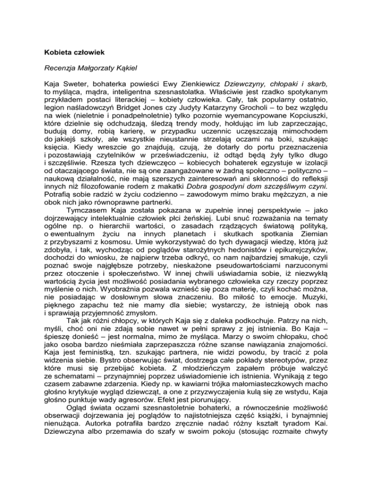 Kobieta człowiek Recenzja Małgorzaty Kąkiel Kaja Sweter, bohaterka powieści Ewy Zienkiewicz Dziewczyny, chłopaki i skarb, to myśląca, mądra, inteligentna szesnastolatka. Właściwie jest rzadko spotykanym przykładem postaci literackiej – kobiety człowieka. Cały, tak popularny ostatnio, legion naśladowczyń Bridget Jones czy Judyty Katarzyny Grocholi – to bez względu na wiek (nieletnie i ponadpełnoletnie) tylko pozornie wyemancypowane Kopciuszki, które dzielnie się odchudzają, śledzą trendy mody, hołdując im lub zaprzeczając, budują domy, robią karierę, w przypadku uczennic uczęszczają mimochodem do jakiejś szkoły, ale wszystkie nieustannie strzelają oczami na boki, szukając księcia. Kiedy wreszcie go znajdują, czują, że dotarły do portu przeznaczenia i pozostawiają czytelników w przeświadczeniu, iż odtąd będą żyły tylko długo i szczęśliwie. Rzesza tych dziewczęco – kobiecych bohaterek egzystuje w izolacji od otaczającego świata, nie są one zaangażowane w żadną społeczno – polityczno – naukową działalność, nie mają szerszych zainteresowań ani skłonności do refleksji innych niż filozofowanie rodem z makatki Dobra gospodyni dom szczęśliwym czyni. Potrafią sobie radzić w życiu codzienno – zawodowym mimo braku mężczyzn, a nie obok nich jako równoprawne partnerki. Tymczasem Kaja została pokazana w zupełnie innej perspektywie – jako dojrzewający intelektualnie człowiek płci żeńskiej. Lubi snuć rozważania na tematy ogólne np. o hierarchii wartości, o zasadach rządzących światową polityką, o ewentualnym życiu na innych planetach i skutkach spotkania Ziemian z przybyszami z kosmosu. Umie wykorzystywać do tych dywagacji wiedzę, którą już zdobyła, i tak, wychodząc od poglądów starożytnych hedonistów i epikurejczyków, dochodzi do wniosku, że najpierw trzeba odkryć, co nam najbardziej smakuje, czyli poznać swoje najgłębsze potrzeby, nieskażone pseudowartościami narzuconymi przez otoczenie i społeczeństwo. W innej chwili uświadamia sobie, iż niezwykłą wartością życia jest możliwość posiadania wybranego człowieka czy rzeczy poprzez myślenie o nich. Wyobraźnia pozwala wznieść się poza materię, czyli kochać można, nie posiadając w dosłownym słowa znaczeniu. Bo miłość to emocje. Muzyki, pięknego zapachu też nie mamy dla siebie; wystarczy, że istnieją obok nas i sprawiają przyjemność zmysłom. Tak jak różni chłopcy, w których Kaja się z daleka podkochuje. Patrzy na nich, myśli, choć oni nie zdają sobie nawet w pełni sprawy z jej istnienia. Bo Kaja – śpieszę donieść – jest normalna, mimo że myśląca. Marzy o swoim chłopaku, choć jako osoba bardzo nieśmiała zaprzepaszcza różne szanse nawiązania znajomości. Kaja jest feministką, tzn. szukając partnera, nie widzi powodu, by tracić z pola widzenia siebie. Bystro obserwując świat, dostrzega całe pokłady stereotypów, przez które musi się przebijać kobieta. Z młodzieńczym zapałem próbuje walczyć ze schematami – przynajmniej poprzez uświadomienie ich istnienia. Wynikają z tego czasem zabawne zdarzenia. Kiedy np. w kawiarni trójka małomiasteczkowych macho głośno krytykuje wygląd dziewcząt, a one z przyzwyczajenia kulą się ze wstydu, Kaja głośno punktuje wady agresorów. Efekt jest piorunujący. Ogląd świata oczami szesnastoletnie bohaterki, a równocześnie możliwość obserwacji dojrzewania jej poglądów to najistotniejsza część książki, i bynajmniej nienużąca. Autorka potrafiła bardzo zręcznie nadać różny kształt tyradom Kai. Dziewczyna albo przemawia do szafy w swoim pokoju (stosując rozmaite chwyty oratorskie, mające wywrzeć wrażenie na wirtualnych słuchaczach ukrytych w meblu), albo do siebie jako codziennej pasażerki pociągu wiozącego ją do szkoły i z powrotem, wreszcie przekonuje do swoich poglądów kolegów. Czasami zagadnienia na mgnienie pokazują swoją drugą, mniej uświadamianą stronę – w kontrargumentacji babci bohaterki. Dziewczyny, chłopaki i skarb w tle mają sensacyjny wątek poszukiwania skarbów, pełen qui pro quo, zaskakujących zbiegów okoliczności i humanistycznego przesłania. Współczesnego czytelnika może zdziwić czas akcji – początek lat 70. XX wieku. Realia są dość egzotyczne: np. tylko nieliczni mają telefon (a za granicą to podobno każda rodzina cieszy się tą zdobyczą techniki), w pomorskim miasteczku Bukowiec stacjonuje radzieckie wojsko. Ponieważ dzieli nas od tego okresu prawie czterdzieści lat, powieść trzeba uznać za historyczną i dostrzec jej wartości poznawcze. Zwłaszcza że są to czasy wkraczającego również do Polski ruchu hipisowskiego z jego ideologią miłości, pacyfizmem, swobodą obyczajową, kwiecistą, zamaszystą modą, kultem młodości. Ów ruch odegrał dużą społeczną rolę – nawet jeśli był marginalizowany czy wyśmiewany; gdyby nie on, prawdopodobnie trochę inaczej wyglądałby bunt takich dziewcząt jak Kaja. Wybór czasu akcji powieści nie jest przypadkowy z jeszcze innego względu – to lata nastoletniej młodości autorki. Książka zawiera więcej elementów autobiograficznych – widzimy podobieństwo losów Kai i faktów z życia pisarki (na okładce znajduje się krótki biogram, wewnątrz zaś posłowie). Także w opisie świata dokonywanym przez główną bohaterkę (a zarazem narratorkę) dostrzec można sposób patrzenia architekta – a jest to wykształcenie Ewy Zienkiewicz. Mamy tu więc dach kryty szarym łupkiem ułożonym w romby, elewacje dzielone w poziomie, więźby, wykusze, lukarny itp. Nic dziwnego, Kaja jest uczennicą technikum budowlanego. Autentyczne przeżycia i fikcja przenikają się tu wzajemnie i dopełniają, tworząc przemyślany w każdym elemencie obraz świata skonstruowanego z precyzją architektonicznego projektu. Tu nie ma niedopowiedzeń. Autorka w przypisie pełniącym funkcję epilogu popr