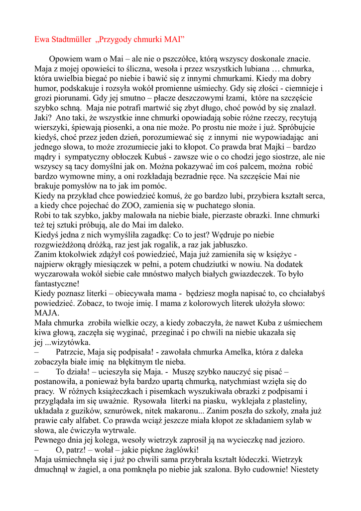Ewa Stadtmüller „Przygody chmurki MAI” Opowiem wam o Mai – ale nie o pszczółce, którą wszyscy doskonale znacie. Maja z mojej opowieści to śliczna, wesoła i przez wszystkich lubiana … chmurka, która uwielbia biegać po niebie i bawić się z innymi chmurkami. Kiedy ma dobry humor, podskakuje i rozsyła wokół promienne uśmiechy. Gdy się złości - ciemnieje i grozi piorunami. Gdy jej smutno – płacze deszczowymi łzami, które na szczęście szybko schną. Maja nie potrafi martwić się zbyt długo, choć powód by się znalazł. Jaki? Ano taki, że wszystkie inne chmurki opowiadają sobie różne rzeczy, recytują wierszyki, śpiewają piosenki, a ona nie może. Po prostu nie może i już. Spróbujcie kiedyś, choć przez jeden dzień, porozumiewać się z innymi nie wypowiadając ani jednego słowa, to może zrozumiecie jaki to kłopot. Co prawda brat Majki – bardzo mądry i sympatyczny obłoczek Kubuś - zawsze wie o co chodzi jego siostrze, ale nie wszyscy są tacy domyślni jak on. Można pokazywać im coś palcem, można robić bardzo wymowne miny, a oni rozkładają bezradnie ręce. Na szczęście Mai nie brakuje pomysłów na to jak im pomóc. Kiedy na przykład chce powiedzieć komuś, że go bardzo lubi, przybiera kształt serca, a kiedy chce pojechać do ZOO, zamienia się w puchatego słonia. Robi to tak szybko, jakby malowała na niebie białe, pierzaste obrazki. Inne chmurki też tej sztuki próbują, ale do Mai im daleko. Kiedyś jedna z nich wymyśliła zagadkę: Co to jest? Wędruje po niebie rozgwieżdżoną dróżką, raz jest jak rogalik, a raz jak jabłuszko. Zanim ktokolwiek zdążył coś powiedzieć, Maja już zamieniła się w księżyc najpierw okrągły miesiączek w pełni, a potem chudziutki w nowiu. Na dodatek wyczarowała wokół siebie całe mnóstwo małych białych gwiazdeczek. To było fantastyczne! Kiedy poznasz literki – obiecywała mama - będziesz mogła napisać to, co chciałabyś powiedzieć. Zobacz, to twoje imię. I mama z kolorowych literek ułożyła słowo: MAJA. Mała chmurka zrobiła wielkie oczy, a kiedy zobaczyła, że nawet Kuba z uśmiechem kiwa głową, zaczęła się wyginać, przeginać i po chwili na niebie ukazała się jej ...wizytówka. – Patrzcie, Maja się podpisała! - zawołała chmurka Amelka, która z daleka zobaczyła białe imię na błękitnym tle nieba. – To działa! – ucieszyła się Maja. - Muszę szybko nauczyć się pisać – postanowiła, a ponieważ była bardzo upartą chmurką, natychmiast wzięła się do pracy. W różnych książeczkach i pisemkach wyszukiwała obrazki z podpisami i przyglądała im się uważnie. Rysowała literki na piasku, wyklejała z plasteliny, układała z guzików, sznurówek, nitek makaronu... Zanim poszła do szkoły, znała już prawie cały alfabet. Co prawda wciąż jeszcze miała kłopot ze składaniem sylab w słowa, ale ćwiczyła wytrwale. Pewnego dnia jej kolega, wesoły wietrzyk zaprosił ją na wycieczkę nad jezioro. – O, patrz! – wołał – jakie piękne żaglówki! Maja uśmiechnęła się i już po chwili sama przybrała kształt łódeczki. Wietrzyk dmuchnął w żagiel, a ona pomknęła po niebie jak szalona. Było cudownie! Niestety całą zabawę popsuł jakiś obcy, bardzo silny i niebezpieczny wiatr. Na szczęście Maja w jednej chwili zamieniła się w chorągiewkę i wietrzysko mogło sobie wiać ile wlezie. Niestety żaglówki pływające po jeziorze, nie umiały pójść w jej ślady, więc jedna za drugą uciekały do brzegu. Po chwili została już tylko jedna mała łódeczka, którą złośliwy podmuch wypchnął na sam środek jeziora. Na domiar złego łódeczka nabrała wody i przechyliła się niebezpiecznie. – Ojej! – przestraszył się kolega Mai. - Ona zatonie! Ratunku! Ratunku!!!! Niestety szum fal zagłuszał jego głos. Maja chciała napisać na niebie słowo: RATUNKU, ale zapomniała jak wygląda literka R. Na szczęście przypomniała sobie, że gdy ktoś potrzebuje pomocy, może wysłać sygnał SOS. Nie namyślając się długo, przybrała kształt trzech prostych literek. – SOS! - zawołał ktoś z brzegu i natychmiast tonącej żaglówce ruszyła na pomoc bardzo szybka motorówka. – Musicie się jeszcze wiele nauczyć – usłyszeli młodzi żeglarze, gdy bezpiecznie znaleźli na brzegu – ale ten pomysł ze znakiem na niebie, doskonały! – Jakim znakiem? - chłopcy jak na komendę zadarli głowy w górę, ale nie zobaczyli nic, bo Maja zdążyła już powrócić do swojej zwykłej postaci. – Zasługujesz na medal – zaśmiał się wietrzyk - nawet gdybyś mogła opowiedzieć o tym, co się stało, nie wiem, czy ktoś by ci uwierzył... – Opowiedzieć nie opowiem – pomyślała Maja - ale niech no ja się nauczę porządnie pisać.... A teraz – niespodzianka. Powiem Wam w sekrecie, że znam prawdziwą Maję – śliczną i wesołą dziewczynkę, która nie może mówić, chociaż wszystko doskonale słyszy i rozumie. Powiem więcej, ona naprawdę ma brata Kubę i kuzynkę Amelkę, z którymi świetnie się „dogaduje”. Ma też koleżanki i kolegów z klasy. Bo Maja, tak jak inne dziewczynki w jej wieku, chodzi do szkoły, a po obiedzie zasiada do odrabiania lekcji. Kiedy ma czas, lubi oglądać bajki, jeździć na rowerze i … pozować do zdjęć. Można powiedzieć, że to jej praca. W ten sposób wysyła sygnał SOS w imieniu dzieci, które tak jak ona potrzebują opieki hospicjum. Bo Maja jest chora, choć na zdjęciach widać najpierw jej uśmiech, a dopiero później rurkę pomagającą jej oddychać. Ps. DLA DOROSŁYCH! O potyczkach z losem, który nie zawsze gra fair opowiada film pod tytułem „Z rurką przez życie”. Warto go zobaczyć co najmniej z dwóch powodów. Po pierwsze jest pełen nadziei, a po drugie - Maja gra w nim główną rolę.