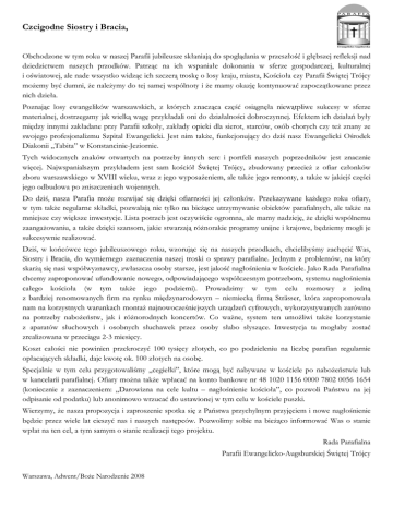 Czcigodne Siostry i Bracia, Obchodzone w tym roku w naszej Parafii jubileusze skłaniają do spoglądania w przeszłość i głębszej refleksji nad dziedzictwem naszych przodków. Patrząc na ich wspaniałe dokonania w sferze gospodarczej, kulturalnej i oświatowej, ale nade wszystko widząc ich szczerą troskę o losy kraju, miasta, Kościoła czy Parafii Świętej Trójcy moŜemy być dumni, Ŝe naleŜymy do tej samej wspólnoty i Ŝe mamy okazję kontynuować zapoczątkowane przez nich dzieła. Poznając losy ewangelików warszawskich, z których znacząca część osiągnęła niewątpliwe sukcesy w sferze materialnej, dostrzegamy jak wielką wagę przykładali oni do działalności dobroczynnej. Efektem ich działań były między innymi zakładane przy Parafii szkoły, zakłady opieki dla sierot, starców, osób chorych czy teŜ znany ze swojego profesjonalizmu Szpital Ewangelicki. Jest nim takŜe, funkcjonujący do dziś nasz Ewangelicki Ośrodek Diakonii „Tabita” w Konstancinie-Jeziornie. Tych widocznych znaków otwartych na potrzeby innych serc i portfeli naszych poprzedników jest znacznie więcej. Najwspanialszym przykładem jest sam kościół Świętej Trójcy, zbudowany przecieŜ z ofiar członków zboru warszawskiego w XVIII wieku, wraz z jego wyposaŜeniem, ale takŜe jego remonty, a takŜe w jakiejś części jego odbudowa po zniszczeniach wojennych. Do dziś, nasza Parafia moŜe rozwijać się dzięki ofiarności jej członków. Przekazywane kaŜdego roku ofiary, w tym takŜe regularne składki, pozwalają nie tylko na bieŜące utrzymywanie obiektów parafialnych, ale takŜe na mniejsze czy większe inwestycje. Lista potrzeb jest oczywiście ogromna, ale mamy nadzieję, Ŝe dzięki wspólnemu zaangaŜowaniu, a takŜe dzięki szansom, jakie stwarzają róŜnorakie programy unijne i krajowe, będziemy mogli je sukcesywnie realizować. Dziś, w końcówce tego jubileuszowego roku, wzorując się na naszych przodkach, chcielibyśmy zachęcić Was, Siostry i Bracia, do wymiernego zaznaczenia naszej troski o sprawy parafialne. Jednym z problemów, na który skarŜą się nasi współwyznawcy, zwłaszcza osoby starsze, jest jakość nagłośnienia w kościele. Jako Rada Parafialna chcemy zaproponować ufundowanie nowego, odpowiadającego współczesnym potrzebom, systemu nagłośnienia całego kościoła (w tym takŜe jego podziemi). Prowadzimy w tym celu rozmowy z jedną z bardziej renomowanych firm na rynku międzynarodowym – niemiecką firmą Strässer, która zaproponowała nam na korzystnych warunkach montaŜ najnowocześniejszych urządzeń cyfrowych, wykorzystywanych zarówno na potrzeby naboŜeństw, jak i róŜnorodnych koncertów. Co waŜne, system ten umoŜliwi takŜe korzystanie z aparatów słuchowych i osobnych słuchawek przez osoby słabo słyszące. Inwestycja ta mogłaby zostać zrealizowana w przeciągu 2-3 miesięcy. Koszt całości nie powinien przekroczyć 100 tysięcy złotych, co po podzieleniu na liczbę parafian regularnie opłacających składki, daje kwotę ok. 100 złotych na osobę. Specjalnie w tym celu przygotowaliśmy „cegiełki”, które mogą być nabywane w kościele po naboŜeństwie lub w kancelarii parafialnej. Ofiary moŜna takŜe wpłacać na konto bankowe nr 48 1020 1156 0000 7802 0056 1654 (koniecznie z zaznaczeniem: „Darowizna na cele kultu – nagłośnienie kościoła”, co pozwoli Państwu na jej odpisanie od podatku) lub anonimowo wrzucać do ustawionej w tym celu w kościele puszki. Wierzymy, Ŝe nasza propozycja i zaproszenie spotka się z Państwa przychylnym przyjęciem i nowe nagłośnienie będzie przez wiele lat cieszyć nas i naszych następców. Pozwolimy sobie na bieŜąco informować Was o stanie wpłat na ten cel, a tym samym o stanie realizacji tego projektu. Rada Parafialna Parafii Ewangelicko-Augsburskiej Świętej Trójcy Warszawa, Adwent/BoŜe Narodzenie 2008