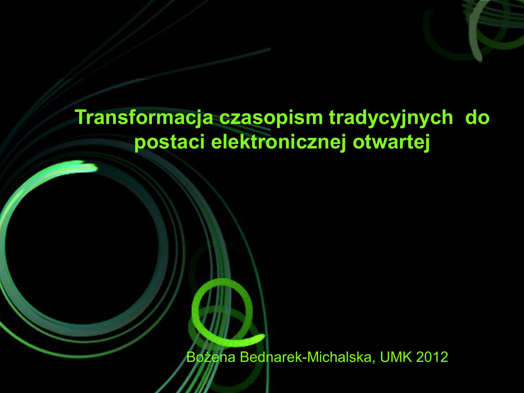 Transformacja czasopism tradycyjnych do postaci elektronicznej otwartej Bożena Bednarek-Michalska, UMK 2012 Czasy transformacji? Zmiany w komunikacji naukowej od lat 90. Globalizacja przepływu wiedzy – Internet Wzrost liczby czasopism elektronicznych lub hybrydowych – (Lista regensburska http://ezb.uni-regensburg.de/about.phtml?bibid=UBR&colors=7&lang=en ma 65139 tytułów czasopism naukowych ze wszystkich dziedzin wiedzy, w tym 10257 tylko online. 36771darmowe). Pojawienie się alternatyw dla czasopism (repozytoria) Pojawienie się nowego nurtu i modelu publikowania naukowego open access Wzrost liczby czasopism otwartych – ponad 36 tys. Oxford Open Access • Figure 2. The development of open access publishing 1993–2009. Wzrost liczby czasopism otwartych od 2007 roku Heather Morrison, Dramatic Growth of Open Access (seria publikacji), October 2012. Simon Fraser University School of Communication. Tryb dostępu: http://poeticeconomics.blogspot.ca/2012/10/thank-you-open-access-movement.html. 9 ważnych kroków w transformacji 1. 2. 3. 4. 5. 6. 7. 8. 9. Uzmysłowienie sobie problemu i decyzja o kierunku zmian, zaangażowanie wszystkich zainteresowanych stron i wyjaśnienie sobie rozbieżności. Podjęcie decyzji co do formy czasopisma – hybrydowe czy tylko elektroniczne, otwarte czy zamknięte? Przyjęcie odpowiedniego modelu biznesowego i zapewnienie stabilności finansowej czasopisma. Zdecydowanie o usługach, jakie chcemy prowadzić i ich funkcjonalnościach (profil dla autorów, profil dla recenzentów, udostępniania dla czytelników, promocja i marketing, itp.) Przyjęcie rozwiązań technicznych (obsługa uczelniania, outsourcing), wybór oprogramowania (open source bezpłatny, komercyjne narzędzie odpłatne) Utrzymanie standardów jakościowych (recenzowanie, korekta wielostopniowa, metadane, archiwizacja długoterminowa, formaty plików itp.) Wzmocnienie widoczności czasopisma w Internecie i świecie nauki (wyszukiwarki naukowe, bazy cytowań, bazy naukowe, repozytoria). Zapewnienie długoterminowej dostępności czasopisma – wybór archiwum lub repozytorium dla wieczystego przechowywania Analiza trendów i przyszłych zmian dla czasopisma Określenie problemu i decyzja 1 krok •uzmysłowienie sobie problemu (mało czytelników, niski impact factor, nieciekawy design, kosztowne przedsięwzięcie, brak rąk do pracy); • decyzja o przyszłości czasopisma (zmieniamy wszystko i nadal publikujemy czasopismo czy zamykamy interes?); Jeśli decyzja będzie na TAK – to jak działamy? • zaangażowanie wszystkich zainteresowanych stron do zmian (debatujemy ze wszystkimi, szukamy sojuszników i doradców); • wyjaśnienie sobie rozbieżności i przygotowania planu działania na najbliższe 5 lat (tyle potrzebuje czasopismo, żeby się sprawdzić). Pytanie, na które trzeba sobie odpowiedzieć podczas dyskusji Czy nasi czytelnicy są gotowi na transformację? Czy nasz wydawca jest gotowy do zmian? Jaki model zechce przyjąć? Czy my jesteśmy gotowi na zmianę wydawcy w razie rozbieżnych poglądów? Czy nasi redaktorzy dadzą sobie radę z nową formą i modelem? Czy będziemy udostępniali wszystko w sposób otwarty? Czy zdigitalizujemy wcześniejsze numery? Gdzie będziemy całość archiwizować? Czy mamy jakieś modele do naśladowania? Na kim się wzorować? I znacznie więcej… Hybrydowe czy tylko elektroniczne, otwarte czy zamknięte? 2 krok • Hybrydowe – częściowo drukowane, (np. na życzenie czytelnika, dla bibliotek, dla subskrybentów) ale z pełną wersją elektroniczną. Dwie równoległe formy dla zachowania ciągłości. • Tylko elektroniczne – likwidujemy druk, przechodzimy na platformę dedykowaną dla czasopism elektronicznych (open source lub komercyjną lub własną) • Otwarte – open access – dostępne w Internecie dla wszystkich bez ograniczeń (dostępne nie oznacza wolne) z klauzulą copyright lub na wolnych licencjach. Zamknięte – toll access – dostępne tylko dla subskrybentów, z klauzulą copyright. Wiley open access Formy publikowania współczesnych czasopism Tradycyjna - zamknięta Nowoczesna - otwarta Hybrydowa (mieszana) Wszystkie zasoby płatne Wszystkie zasoby darmowe Część zasobów bezpłatna Wszystkie prawa zastrzeżone Niektóre prawa zastrzeżone - wolne licencje Copyright + inne swobodniejsze licencje Za produkcję płaci wydawca Za produkcję płaci autor, instytucja, fundacja, sponsor Za produkcję płaci wydawca + autor i inni donatorzy Recenzowanie ukryte, eksperckie Recenzowanie jawne + komentarze czytelnicze Recenzowanie ukryte, eksperckie + jawne + komentarze czytelnicze Modele biznesowe stosowane w świecie 3 krok • Advertising – przychody z reklam; • Endowments – stałe dotacje; • Fund-raising – granty z różnych fundacji; • Hybrid OA journals – przygody od autorów i ich instytucji + fundusze wydawcy; • Institutional subsidies – bezpośrednie lub pośrednie dopłaty instytucji naukowej; • Membership dues – przychody ze składek członkowskich; • Priced editions – fundusze wydawcy (większość numerów jest odpłatna, niektóre • numery są otwarte, np. starsze); • Publication fees – autorzy lub instytucje naukowe pokrywają koszty produkcji po publikacji; • Submission fees – autorzy i instytucje wnoszą opłaty za przesłanie tekstu do redakcji, nie jest to jednoznaczne z przyjęciem do druku; • Volunteer effort – publikowane wysiłkiem społecznym. lub mieszane Springer open Usługi i funkcjonalności systemu 4 krok • Odrębne moduły dla autorów, recenzentów, redaktorów i korektorów; • RSS, Alert, Newsletter – powiadamianie o nowych numerach, o artykułach, które lubią czytelnicy; • Indeksy: słów kluczowych, autorski, tytułów; • Wyszukiwanie: proste, zaawansowane; • Komentarze otwarte przy każdym artykule; • Przewodnik i instrukcja dla użytkowników systemu; • Statystyki użytkowania zasobu. Rozwiązania technologiczne 5 k