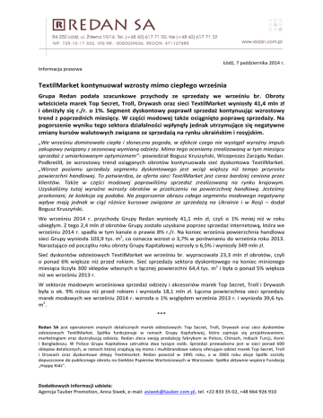 Łódź, 7 października 2014 r. Informacja prasowa TextilMarket kontynuował wzrosty mimo ciepłego września Grupa Redan podała szacunkowe przychody ze sprzedaży we wrześniu br. Obroty właściciela marek Top Secret, Troll, Drywash oraz sieci TextilMarket wyniosły 41,4 mln zł i obniżyły się r./r. o 1%. Segment dyskontowy poprawił sprzedaż kontynuując wzrostowy trend z poprzednich miesięcy. W części modowej także osiągnięto poprawę sprzedaży. Na pogorszenie wyniku tego sektora działalności wpłynęły jednak utrzymujące się negatywne zmiany kursów walutowych związane ze sprzedażą na rynku ukraińskim i rosyjskim. „We wrześniu dominowała ciepła i słoneczna pogoda, w efekcie czego nie wystąpił wyraźny impuls zakupowy związany z sezonową wymianą odzieży. Mimo tego oceniamy zrealizowaną w tym miesiącu sprzedaż z umiarkowanym optymizmem”- powiedział Bogusz Kruszyński, Wiceprezes Zarządu Redan. Podkreślił, że wzrostowy trend osiąganych obrotów kontynuowała sieć dyskontowa TextilMarket. „Wzrost poziomu sprzedaży segmentu dyskontowego jest wciąż większy niż tempo przyrostu powierzchni handlowej. To potwierdza, że oferta sieci TextilMarket jest coraz bardziej ceniona przez klientów. Także w części modowej poprawiliśmy sprzedaż zrealizowaną na rynku krajowym. Uzyskaliśmy tutaj wyraźne wzrosty obrotów w przeliczeniu na powierzchnię handlową. Jesteśmy przekonani, że kolekcja się podoba. Na pogorszenie obrazu całego segmentu modowego negatywny wpływ mają jednak w ciąż różnice kursowe związane ze sprzedażą na Ukrainie i w Rosji – dodał Bogusz Kruszyński. We wrześniu 2014 r. przychody Grupy Redan wyniosły 41,1 mln zł, czyli o 1% mniej niż w roku ubiegłym. Z tego 2,4 mln zł obrotów Grupy zostało uzyskane poprzez sprzedaż internetową, która we wrześniu 2014 r. spadła w tym kanale o prawie 8% r./r. Na koniec września powierzchnia handlowa sieci Grupy wyniosła 103,9 tys. m2, co oznacza wzrost o 3,7% w porównaniu do września roku 2013. Narastająco od początku roku obroty Grupy Kapitałowej wzrosły o 6,5% i wyniosły 349 mln zł. Sieć dyskontów odzieżowych TextilMarket we wrześniu br. wypracowała 23,3 mln zł obrotów, czyli o ponad 6% większe niż przed rokiem. Sieć sprzedaży sektora dyskontowego na koniec minionego miesiąca liczyła 300 sklepów własnych o łącznej powierzchni 64,4 tys. m2 i była o ponad 5% większa niż we wrześniu 2013 r. W sektorze modowym wrześniowa sprzedaż odzieży i akcesoriów marek Top Secret, Troll i Drywash była o ok. 9% niższa niż przed rokiem i wyniosła 18,1 mln zł. Łączna powierzchnia sieci sprzedaży marek modowych we wrześniu 2014 r. wzrosła o 1% względem września 2013 r. i wyniosła 39,6 tys. m2. *** Redan SA jest operatorem znanych detalicznych marek odzieżowych: Top Secret, Troll, Drywash oraz sieci dyskontów odzieżowych TextilMarket. Spółka funkcjonuje w ramach Grupy Kapitałowej, która zajmuje się projektowaniem, marketingiem oraz dystrybucją odzieży. Redan zleca swoją produkcję fabrykom w Polsce, Chinach, Indiach Turcji, Korei i Bangladeszu. W Polsce Grupa Kapitałowa zatrudnia dwa tysiące osób. Sprzedaż prowadzona jest w sieci ponad 600 sklepów detalicznych, w ramach której znajdują się mono i multibrandowe salony oferujące odzież marek Top Secret, Troll i Drywash oraz dyskontowe sklepy Textilmarket. Redan powstał w 1995 roku, a w 2003 roku akcje Spółki zostały dopuszczone do publicznego obrotu na Giełdzie Papierów Wartościowych w Warszawie. Spółka aktywnie wspiera Fundację „Happy Kids”. Dodatkowych informacji udziela: Agencja Tauber Promotion, Anna Siwek, e-mail: [email protected], tel. +22 833 35 02, +48 664 926 910