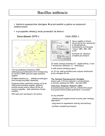 Bacillus anthracis bakterie powszechnie dostępne Î przetrwalniki w glebie na obszarach endemicznych w przypadku inhalacji może prowadzić do śmierci Świerdłowsk 1979 r. USA 2001 r. Spory wąglika w listach docierają do biur senatorów w Waszyngtonie, dziennikarzy na Florydzie i stacji NBC, ABC, CBS w NY Dochodzi do skażenia urzędów pocztowych. 22 osoby zostają zarażone (11 - wąglik skórny, w tym 7-miesięczne niemowlę i 11 - inhalcyjny), 7 lat po podpisaniu konwencji ONZ zakazującej produkowania broni biologicznej na terenie ZSRR wybucha nagle epidemia wąglika. Źródłem skażenia są .... zakłady produkujące broń biologiczną (błąd człowieka). Przypuszczalnie uwolnione zostaje od 1g do 100g przetrwalników wąglika. Skażony aerozol można wykryć nawet 40 km od miejsca wypadku, mało zaludnione tereny wiejskie 200 osób jest zarażonych, 66 umiera. 5 osób umiera (inhalacja spor) ok. 10 tys. osób profilaktycznie zażywa antybiotyki przez następne 60 dni The National Pharmaceutical Stockpile dostarczyło 3,75 mln tabletek z antybiotykiem w okresie: październik 2001 - styczeń 2002 Laboratory Response Network (LRN) przeanalizowano ponad 125 tys. próbek klinicznych oraz ponad milion próbek pobranych z otoczenia Co się zmieniło? • globalne postrzeganie bioterroryzmu jako realnego zagrożenia • spojrzenie na zagadnienie wtórnej aerozolizacji • problem rzesyłek pocztowych B. anthracis w USA Emerging Infectious Diseases , October 2002 wersja online: www.cdc.gov/eid Jernigan DB, Raghunathan PL, Bell BP, Brechner R, Bresnitz EA, Butler JC, et al. (2002) Investigation of bioterrorism-related anthrax, United States, 2001: epidemiologic findings. Emerg Infect Dis 10:1019-28 Proszek znaleziony w 4 kopertach zawierał ten sam szczep bakterii B. anthracis (szczepy nierozróżnialne), jednak siła rażenia była różna. Zakażenia drogą wziewną były powiązane z pocztą wysłaną w październiku 2001 r. • Czy był to efekt zamierzony? • Czy był to wpływ czynników środowiskowych? B. anthracis w USA SORTOWANIE POCZTY Kanadyjczycy przeprowadzili testy z Bacillus globigii. Zamknięte koperty zawierające bakterie mogą być pierwotnym źródłem zakażenia. - Jakie ryzyko skażenia? Na poczcie w Brentwood przeprowadzono test: Skażone listy trafiały na pocztę w Brentwood od 12 do 21 października 2001 r; w tym czasie przez pocztę Brentwood przeszło ok. 60 mln listów zasymulowano pracę urządzeń sortowniczych (zdezynfekowane wcześniej 0,05% podchlorynem) Wykryto bakterie B. anthracis ( cfu - colony forming units) Pracownik pracujący na poczcie w ciągu 8 godzin wdychałby około 30 cząstek zawierających żywe bakterie wąglika Adresaci zdrowi Jest to niskie skażenie: 20 - krotnie mniejsze niż dawka na jaką byli eksponowani sortowacze wełny (Pennsylvania, w ciągu 8 godzin wdychali około 1 300 cząstek zawierających żywe bakterie wąglika, mniej niż 510 cząstek miało średnicę mniejszą niż 5 µm, ), stukrotnie mniej niż wyliczona LD50 dla człowieka ??? List do jednego z senatorów (T. Daschle) zawierał około 2g proszku; 109 do 1012 przetrwalników na 1g proszku Staruszka z Connecticut - mieszkała w budynku, do którego przychodziły listy ze skażonej poczty w Hamilton, NY (jedyne ogniwo), nigdzie gdzie przebywała w ciągu 2 m-cy przed zachorowaniem nie znaleziono B. anthracis. Zdiagnozowana 20 listopada, zmarła 21 listopada 2001 r. ? Wiek, odporność Bacillus anthracis • przetrwalnikująca laseczka G(+) • rozwija się w warunkach tlenowych i względnie beztlenowych • bakterie są blisko spokrewnione z Bacillus cereus CDC • endospory tworzą się pośrodku komórki • przetrwalniki Î sterylizacja w autoklawie • czynniki wirulencji: otoczka, warstwa S (S-layer) i egzotoksyna • szczepy wytwarzające otoczkę łatwo jest odróżnić - wygląd kolonii - gładkie i śliskie • otoczka złożona z polimeru kwasu D-glutaminowego • synteza otoczki Kolonie R Kolonie S CDC – następuje w organizmie (CO2) – plazmid pXO2 – konieczna jest ekspresja trzech genów: capB, capC i capA kodujących enzymy związane z błoną komórkową bakterii. W regulacji ekspresji genów uczestniczą produkty genów acpA (pXO2) oraz atxA (pXO1) Szczepy nie wytwarzające otoczki (pozbawione plazmidu pXO2) wykazują obniżoną wirulencję. Otoczka chroni przed fagocytozą. Szczep Sterna - szczepionka weterynaryjna Toksyna B. anthracis • egzotoksyna składa się z trzech białek kodowanych przez geny: pagA, cya, lef znajdujące się na plazmidzie pXO1 • modelowa toksyna typu A-B • podjednostka B - czynnik PA - wiąże się na powierzchni komórek eukariotycznych z receptorami ATR (anthrax toxin receptor) i wprowadza podjednostkę A do cytozolu • pozostałe dwa białka: - czynnik EF i czynnik LF - mają aktywność enzymatyczną; każde z nich stanowi odrębną podjednostkę A; w związku z tym mamy do czynienia z dwiema toksynami EdTx LeTx Czynnik EF- PA Czynnik LF-PA prowadzi do obrzęku prowadzi do śmierci EF- po związaniu się z obecną w komórce kalmoduliną nabywa właściwości cyklazy adenylanowej − enzymu, który katalizuje reakcję przejścia ATP w cykliczny AMP (cAMP). Prowadzi to do gwałtownego, nawet tysiąckrotnego wzrostu stężenia tego związku w komórce. Ponieważ cAMP jest cząsteczką sygnałową, należącą do tzw. przekaźników II typu, które regulują szereg procesów zachodzących w komórkach eukariotycznych, działanie EF zakłóca ich prawidłowy przebieg. Efektem rozregulowania procesów wewnątrzkomórkowych − zwłaszcza zaburzenia transportu jonów − jest wydzielanie przez komórki na zewnątrz elektrolitów i utrata wody. LF - jest cynkową proteazą, inaktywuje wewnątrzkomórkowe kinazy MEK (MEK1, MEK2, MEK3), które stanowią jedno z ogniw szlaków sygnałowych przekazujących zewnętrzne bodźce do wnętrza komórki eukariotycznej. Serynowo-treoninowe kinazy MEK fosforylują, a tym 