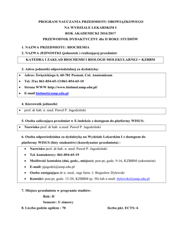 PROGRAM NAUCZANIA PRZEDMIOTU OBOWIĄZKOWEGO NA WYDZIALE LEKARSKIM I ROK AKADEMICKI 2016/2017 PRZEWODNIK DYDAKTYCZNY dla II ROKU STUDIÓW 1. NAZWA PRZEDMIOTU: BIOCHEMIA 2. NAZWA JEDNOSTKI (jednostek ) realizującej przedmiot: KATEDRA I ZAKŁAD BIOCHEMII I BIOLOGII MOLEKULARNEJ = KZBBM 3. Adres jednostki odpowiedzialnej za dydaktykę: Adres: Święcickiego 6, 60-781 Poznań, Col. Anatomicum Tel. /Fax 061-854-65-13/061-854-65-10 Strona WWW http://www.biolmol.ump.edu.pl/ E-mail [email protected] 4. Kierownik jednostki: prof. dr hab. n. med. Paweł P. Jagodziński 5. Osoba zaliczająca przedmiot w E-indeksie z dostępem do platformy WISUS: Nazwisko prof. dr hab. n.med. Paweł P. Jagodziński 6. Osoba odpowiedzialna za dydaktykę na Wydziale Lekarskim I z dostępem do platformy WISUS (listy studentów) (koordynator przedmiotu) : Nazwisko prof. dr hab. n. med. Paweł P. Jagodziński Tel. kontaktowy: 061-854-65-19 Możliwość kontaktu (dni, godz., miejsce): pon-pt, godz. 9-16, KZBBM (sekretariat) E-mail: [email protected] Osoba zastępująca dr n. med., mgr farm. J. Bogusław Dylewski Kontakt: pon-pt, godz. 13-20, KZBBM (p. 30) lub e-mail: [email protected] 7. Miejsce przedmiotu w programie studiów: Rok: II Semestr: 3/ zimowy 8. Liczba godzin ogółem : 70 liczba pkt. ECTS: 6 Jednostki uczestniczące w nauczaniu przedmiotu Semestr zimowy liczba godzin Ćwiczenia W Ć S kategoria KZBBM 15 43 A 12 Razem: 15 43 A 12 9. SYLABUS Nazwa przedmiotu/modułu Wydział Nazwa kierunku studiów Poziom kształcenia Forma studiów Język przedmiotu Rodzaj przedmiotu BIOCHEMIA Lekarski I Lekarski Jednolite magisterskie (studia wyższe) stacjonarne polski obowiązkowy fakultatywny 1 2 3 4 5 6 7 8 9 10 11 12 Rok studiów/semestr I II III IV V VI Liczba godzin zajęć dydaktycznych z podziałem na formy prowadzenia zajęć 70, w tym: 15 - wykłady, 12- seminaria, 43 - ćwiczenia Założenia i cele przedmiotu C01. Poznanie budowy i funkcji związków organicznych wchodzących w skład makrocząsteczek obecnych w komórkach, macierzy zewnątrzkomórkowej i płynach ustrojowych. C02. Przekazanie wiedzy dotyczącej przemian głównych grup związków chemicznych na poziomie molekularnym. C03. Poznanie enzymów katalizujących kluczowe reakcje w metabolizmie węglowodanów, lipidów i związków azotowych, oraz mechanizmów regulacji ich aktywności. C04. Zrozumienie współzależności przemian i końcowego utleniania produktów katabolizmu białek, węglowodanów i tłuszczów. C05. Omówienie specyfiki metabolizmu niektórych narządów i tkanek w gospodarce energetycznej organizmu. C06. Zrozumienie podstaw homeostazy ustrojowej, szczególnie w odniesieniu do gospodarki węglowodanowej i lipidowej, wodno-elektrolitowej i kwasowo-zasadowej oraz o roli hormonów w tych procesach. C07. Omówienie podstawowych technik laboratoryjnych stosowanych w pracowni biochemicznej oraz ćwiczenie umiejętności stosowania właściwych technik w analizie biochemicznej. C08. Rozwijanie i kształtowanie umiejętności poszukiwania i przekształcania informacji w zakresie procesów biochemicznych. C09. Uświadomienie konieczności stałego poszerzania wiedzy dotyczącej biochemicznych podstaw integralności organizmu ludzkiego. C10. Wypracowanie umiejętności zespołowego opracowywania zagadnień. Symbol efektów kształcenia zgodnie ze standardami OPIS KIERUNKOWYCH EFEKTÓW KSZTAŁCENIA WIEDZA (ZGODNIE ZE SZCZEGÓŁOWYMI EFEKTAMI KSZTAŁCENIA) Metody weryfikacji osiągnięcia zamierzonych efektów kształcenia: B.W10. B.W11. B.W12. B.W15. zna budowę prostych związków organicznych wchodzących w skład makrocząsteczek obecnych w komórkach, macierzy zewnątrzkomórkowej i płynów ustrojowych; opisuje budowę lipidów i polisacharydów oraz ich funkcje w strukturach komórkowych i pozakomórkowych; charakteryzuje struktury I-, II-, III- oraz IV-rzędowe białek; zna modyfikacje potranslacyjne i funkcjonalne białka oraz ich znaczenie; opisuje podstawowe szlaki kataboliczne i anaboliczne, sposoby ich regulacji oraz wpływ czynników genetycznych i środowiskowych; B.W16. zna profile metaboliczne podstawowych narządów i układów; B.W17. zna pojęcia: potencjał oksydacyjny organizmu i stres oksydacyjny; zna enzymy biorące udział w trawieniu, mechanizm wytwarzania kwasu solnego w żołądku, rolę żółci, przebieg wchłaniania produktów trawienia oraz zaburzenia z nimi związane; zna konsekwencje niewłaściwego odżywiania, w tym długotrwałego głodowania, przyjmowania zbyt obfitych posiłków oraz stosowania niezbilansowanej diety; zna konsekwencje niedoboru witamin lub minerałów oraz ich nadmiaru w organizmie; zna mechanizm działania hormonów oraz konsekwencje zaburzeń regulacji hormonalnej; UMIEJĘTNOŚCI (ZGODNIE ZE SZCZEGÓŁOWYMI EFEKTAMI KSZTAŁCENIA) B.W18. B.W19. B.W20. B.W26. B.U6. przewiduje kierunek procesów biochemicznych w zależności od stanu energetycznego komórek; B.U9. posługuje się podstawowymi technikami laboratoryjnymi, takimi jak: analiza jakościowa, miareczkowanie, kolorymetria, pehametria, chromatografia, elektroforeza białek i kwasów nukleinowych; B.U10. obsługuje proste przyrządy pomiarowe oraz ocenia dokładność wykonywanych pomiarów; B.U14. planuje i wykonuje proste badanie naukowe oraz interpretuje jego wyniki i wy-ciąga wnioski. PUNKTY ECTS Sprawdziany wejściowe i wyjściowe w poszczególnych modułach tematycznych oraz sprawdzian z materiału wykładowego (punkty do uzyskania zaliczenia) Seminaria i repetytoria (punkty za rozwiązywanie postawionych zadań problemowych) Ćwiczenia laboratoryjne (punkty za przygotowanie teoretyczne oraz wykonanie ćwiczenia i opracowanie protokołu) 6 TREŚCI MERYTORYCZNE PRZEDMIOTU: Tematyka Homeostaza glukozy i integracja metabolizmu. Metabolizm triacylogliceroli (TAG) i lipoprotein osocza Metabolizm kwasu arachidonowego Cholesterol i jego biologicznie czynne pochodne Biosynteza i funkcja tlenku azotu (NO) Stres oksydacyjny Molekularne 