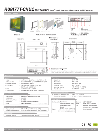 R08I77T-CHU1 8.4" Panel PC Mechanical R (Intel core 2 Quad/core 2 Duo/celeron M+GME platform) Design Storage (HDD) SBC Board 2 1 Back Cover Inverter Touch/Glass (Optional) Front Cover Panel Metal Frame Housing FRONT VIEW 7 10 9 6. PS/2 7. DC-IN Power Jack 8. Brightness Adjustment Kndo 9. Power On Button 10. Power Reset Button Fully Integrated I/O Dimensions SIDE VIEW 8 5 1. Audio Jack 2. RJ-45 3. USB 4. VGA Out 5. RS-232 Conn. Modularized Construction Chassis 6 4 3 BACK VIEW SIDE VIEW Measurements shown in mm * All Dimensions are ± * Note: is a simplified drawing and some components are not marked in detail. * Pleasethis contact our sales representative if you need further product information. BOTTOM VIEW Specifications Panel Spec : System : CPU : Intel Core 2 Quad/Core 2 Duo/Celeron M Size/Type : 10.4" TFT Memory Slot : 2 x DDR2 DIMM, up to 4GB DDR2 667/800 Resolutions : 800 x 600 System Chipset : Intel GM45/ICH9M-E Brightness 2 : 400 cd/m (typ.) IDE/SATA : 1 x 44pin IDE (UDMA 33/66/100) Contrast Ratio : 600 : 1(typ.) Viewing Angles : -75~75(H);-60~70(V) Max Colors : 16.2M(8bits / color) 3XSATA with RAID 0/1/5 LAN Audio Codec : Intel 82567LM + 82574L : ICH7M Built-in, AC97 w / 5.1 Channels Environment Considerations : Input / Output : Serial Ports : 3 x RS232, 1 x RS232/422/485 USB Ports : 4 x USB Keyboard / Mouse : 2 x PS/2 Ethernet : 2 x RJ 45-10/100/1000 Mbps VGA : 1 x VGA (female) Operating Temperature Operating Humidity : 0 deg.C to 50deg.C : 30% to 90% (non condensing) Order Options : Default setting:RS232 Mechanical : Open Frame Panel Mount(5mm bezel) IP65(10mm bezel) Power Specifications : Chassis : 12V DC IN (Lockable Power Jack) Power Input Power Consumption : 75W (typ.)(Max.backlight & high CPU load) Touch Storage : 2.5" HDD/CF RAM : DIMM DDR2 533/667 OS : Windows XPE(Optional) Windows XPPE (Optional) : 5 Wires Resistive(Optional) Linux(Optional) (A customized housing is needed if you have demands of SAW/IR/IT/SC touch) Accessori es : Externa l Adapter : 110~230V Ac-in Power Adapter Note: All Specifications are subject to change without prior notice! Revised Date:21-Jun-2016 V1.2